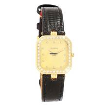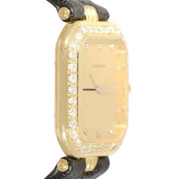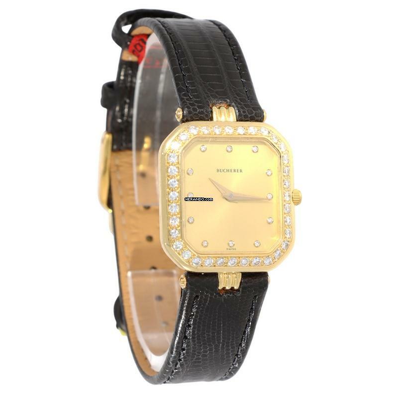 Sie erhalten aus dem Hause Bucherer eine Damenarmbanduhr mit Diamantzifferblatt und Brillantlünette, Quarz aus 750 Gelbgold mit Lederband.