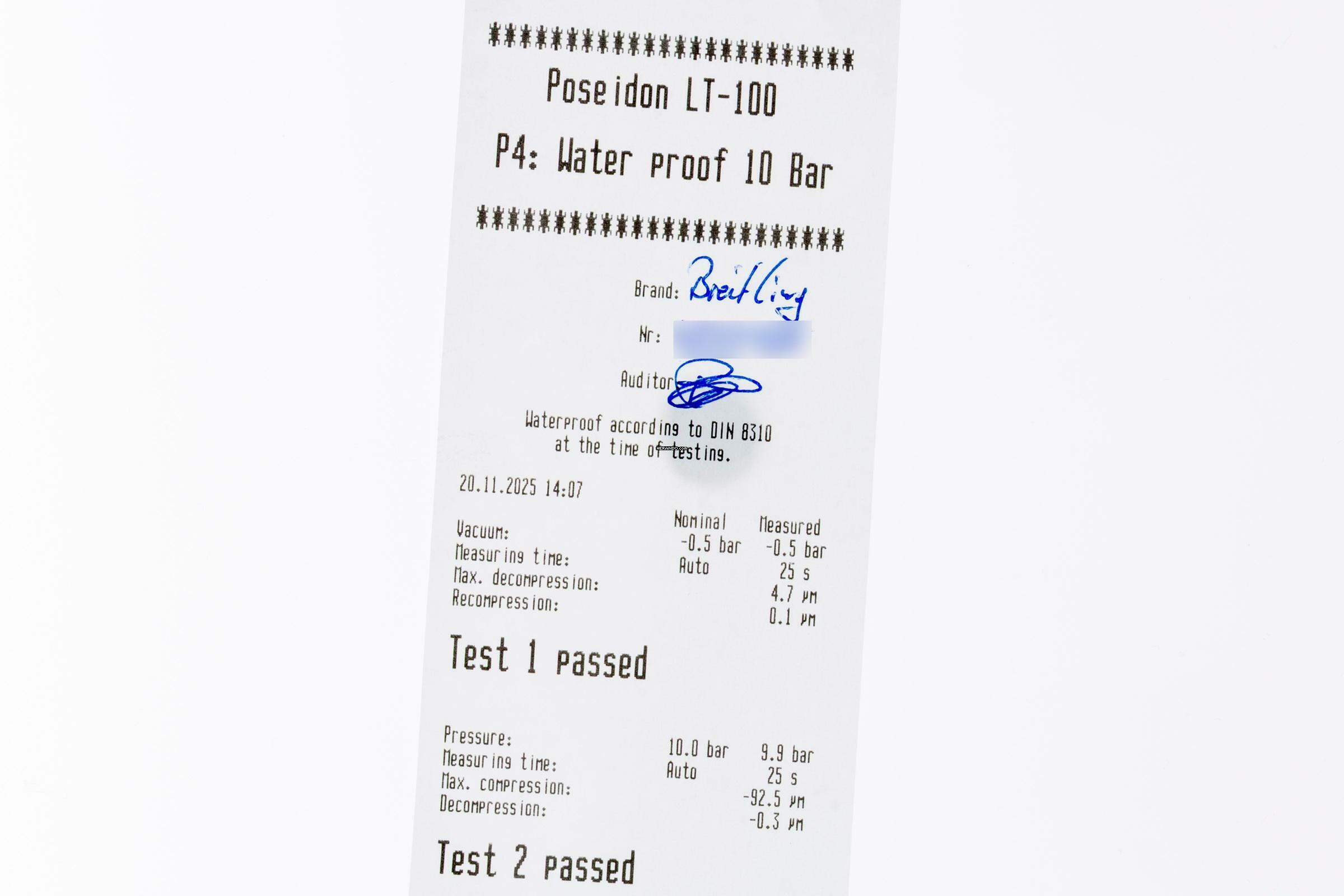 * Wenn die Uhr positiv auf Wasserdichtigkeit getestet wurde, dann gilt diese Eigenschaft zum Zeitpunkt der Messung. Wasserdichtigkeit ist nach DIN 8310 keine bleibende Eigenschaft. Sie sollte jährlich und vor besonderen Belastungen überprüft werden, da die eingebauten Dichtelemente in ihrer Funktion und im täglichen Gebrauch nachlassen. Einflüsse wie starke Temperaturschwankungen, Chlor, Seife oder Salzwasser wirken sich negativ auf die Wasserdichtigkeit aus.