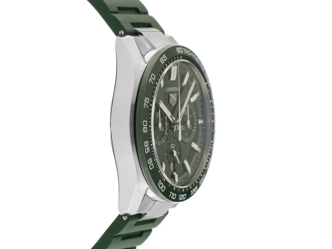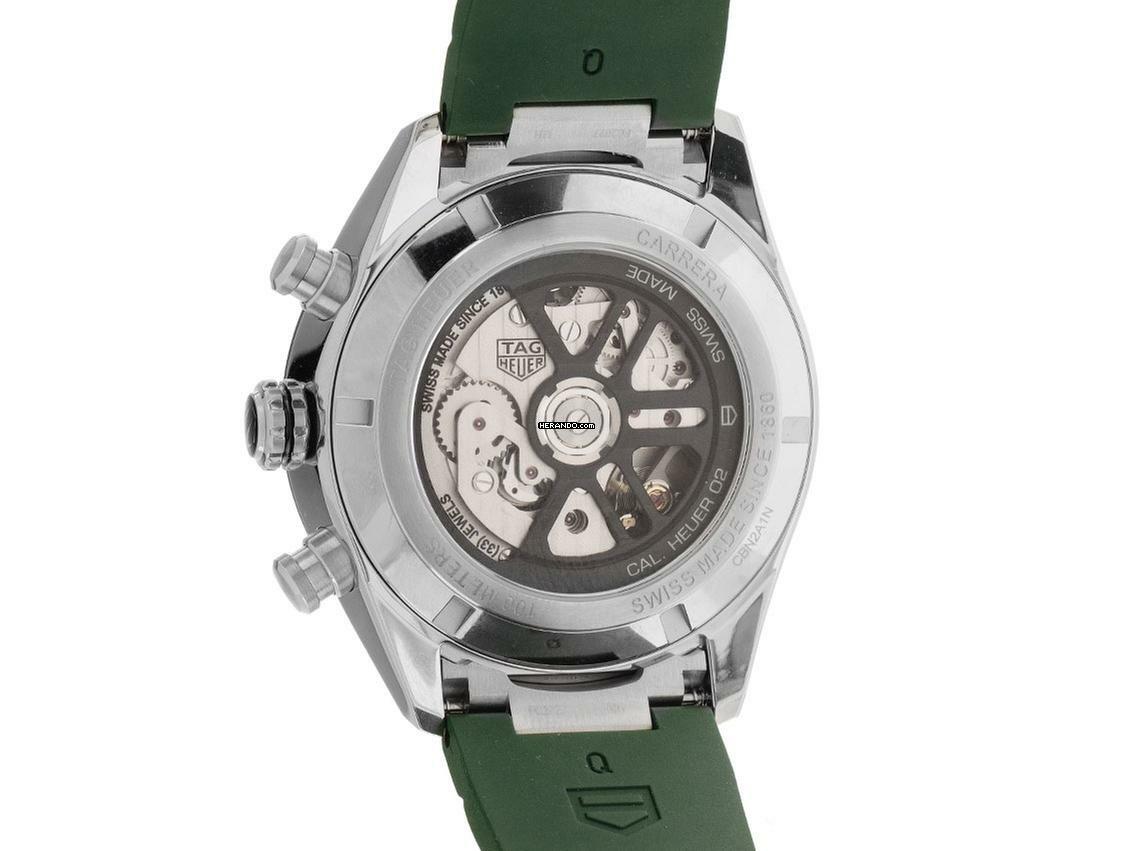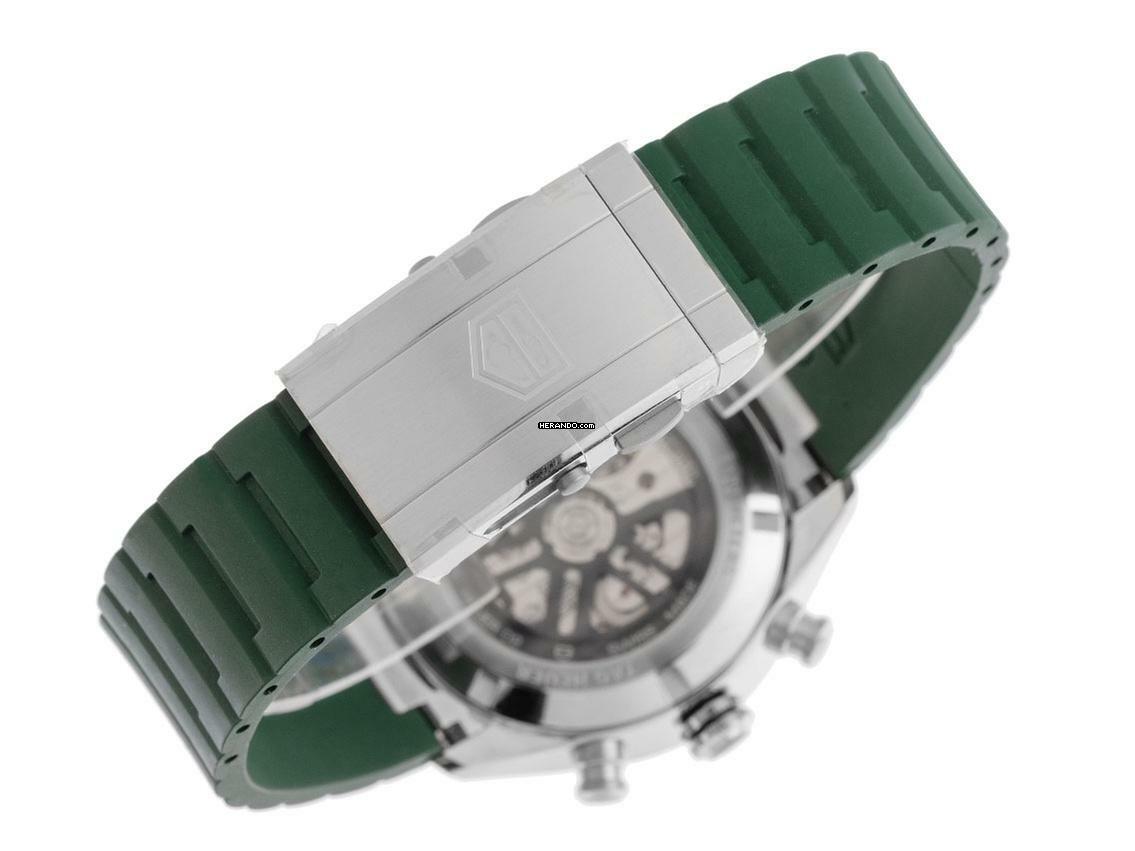 Tag Heuer Carrera Stahl Automatik Chronograph Armband Kautschuk Faltschließe Gehäuse Edelstahl poliert und satiniert, Gehäusedurchmesser ohne Krone 44mm, Gehäusehöhe 15,2mm. Lünette Keramik grün satiniert mit gravierter Tachymeterskala. Armband Kautschuk grün, Sicherheitsfaltschließe Edelstahl mit Verlängerung und Hersteller-Logo. Zifferblatt grün kreisförmig gebürstet mit aufgesetzten Edelstahl Leuchtindexen und Edelstahl Leuchtzeigern. Uhrwerk Automatik, Chronograph, Tag Heuer Manufakturkaliber Calibre Heuer 02 mit 33 Edelsteinen, Gangreserve ca. 80 Stunden. Anzeige von Stunde und Minute über Zeiger aus der Mitte, kleine Sekunde mit Sekundenstopp zur sekundengenauen Einstellung der Uhrzeit bei 6 Uhr, Datumsanzeige mit Schnellverstellung bei 6 Uhr. Saphirglas kratzfest und gewölbt. Krone mit Hersteller-Logo. Boden Edelstahl verschraubt und graviert mit Saphirglas Sichtfenster. Gewicht der Uhr inklusive Armband 155g. Wasserdicht bis 10 ATM. Referenznummer: CBN2A1N.FT6238, ID: ST610281001225H-6750, Artikelnummer: 10000083705. Original Tag Heuer Box mit Umkarton und Garantie Papiere von 2025 sowie Beschreibung, Full Set. Ungetragen. Lieferzeit sofort. Inklusive Uhrenpass mit einem Farbbild, der genauen Beschreibung sowie dem Wiederbeschaffungswert der Uhr über 6750,-€ und 1000 Tage Garantie ab Kaufdatum.