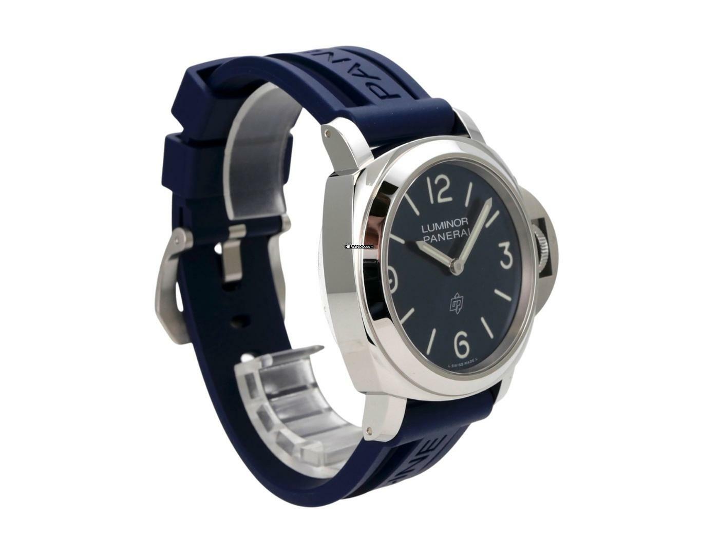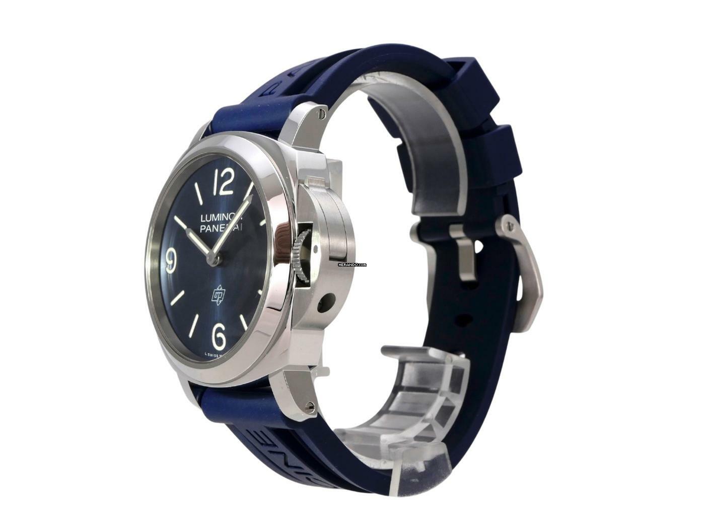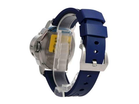 Gehäuse aus Edelstahl poliert, Gehäusedurchmesser 44 mm, Lünette aus Edelstahl poliert, blaues Kautschukband mit Dornschließe aus poliertem Edelstahl, zusätzliches braunes Lederarmband, blaues Zifferblatt mit arabischen Leuchtziffern und Stundenmarkierungen, Mechanisches Uhrwerk mit Handaufzug, Kaliber Panerai P.6000 mit 19 Steine, Schwingung 21.600 A/h., Gangreserve 72 Stunden, entspiegeltes Saphirglas, Edelstahlboden, wasserdicht bis zu 10 bar.