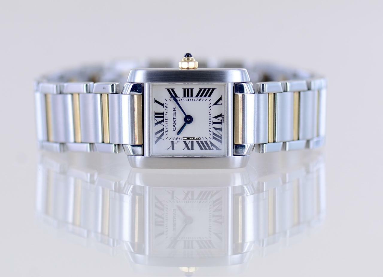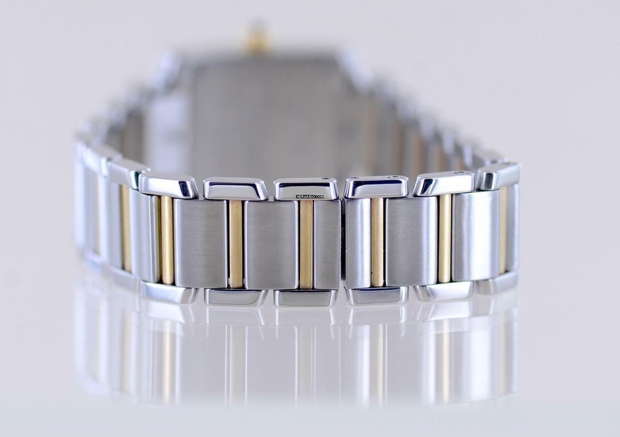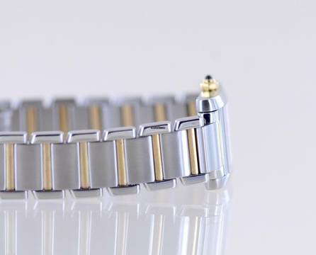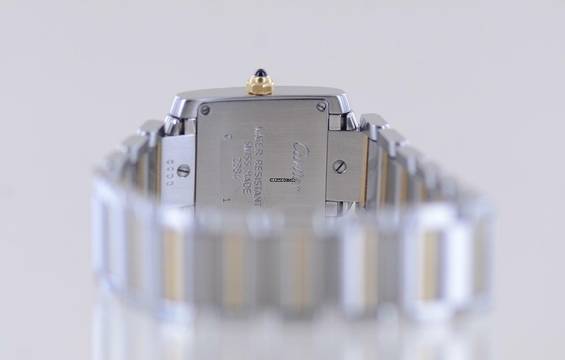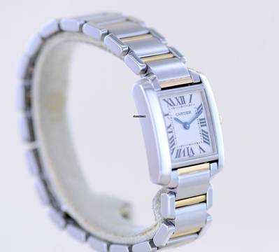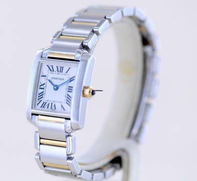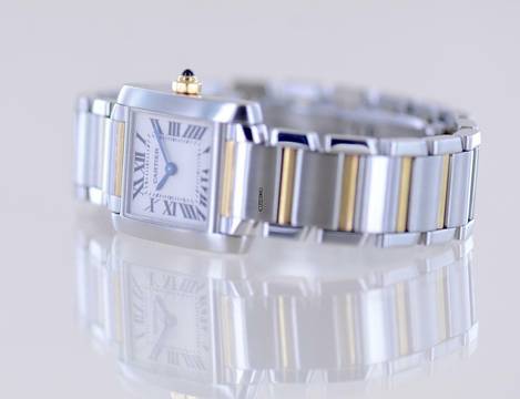 Sehr schöne und klassisch sportliche Cartier Tank Francaise in der beliebten Gold/Stahl-Ausführung. Es handelt sich um die Damenausführung mit der Referenz 2384. Dieser Klassiker wirkt mit den viereckigen Tank-Form und dem genialen Armband zeitlos schön. Das weiße Zifferblatt mit den römischen Ziffern erinnert an die 50er Jahre und neben Cartier-Uhren auch an bewährte Modelle von Jaeger LeCoultre oder Girard Perregaux.Die Zeiger sind hitzegebläut und die Uhr ist sehr gut ablesbar. Der blaue Saphir Cabochon auf der Krone gehört zum Markenzeichen der Modelle. Cartier setzt in Sachen Verarbeitung und Langlebigkeit von Bändern und Gehäuse absolut Maßstäbe in dieser Klasse.