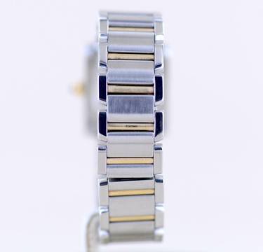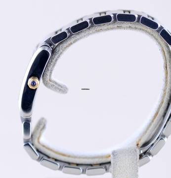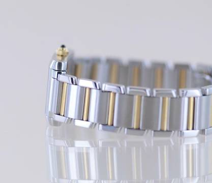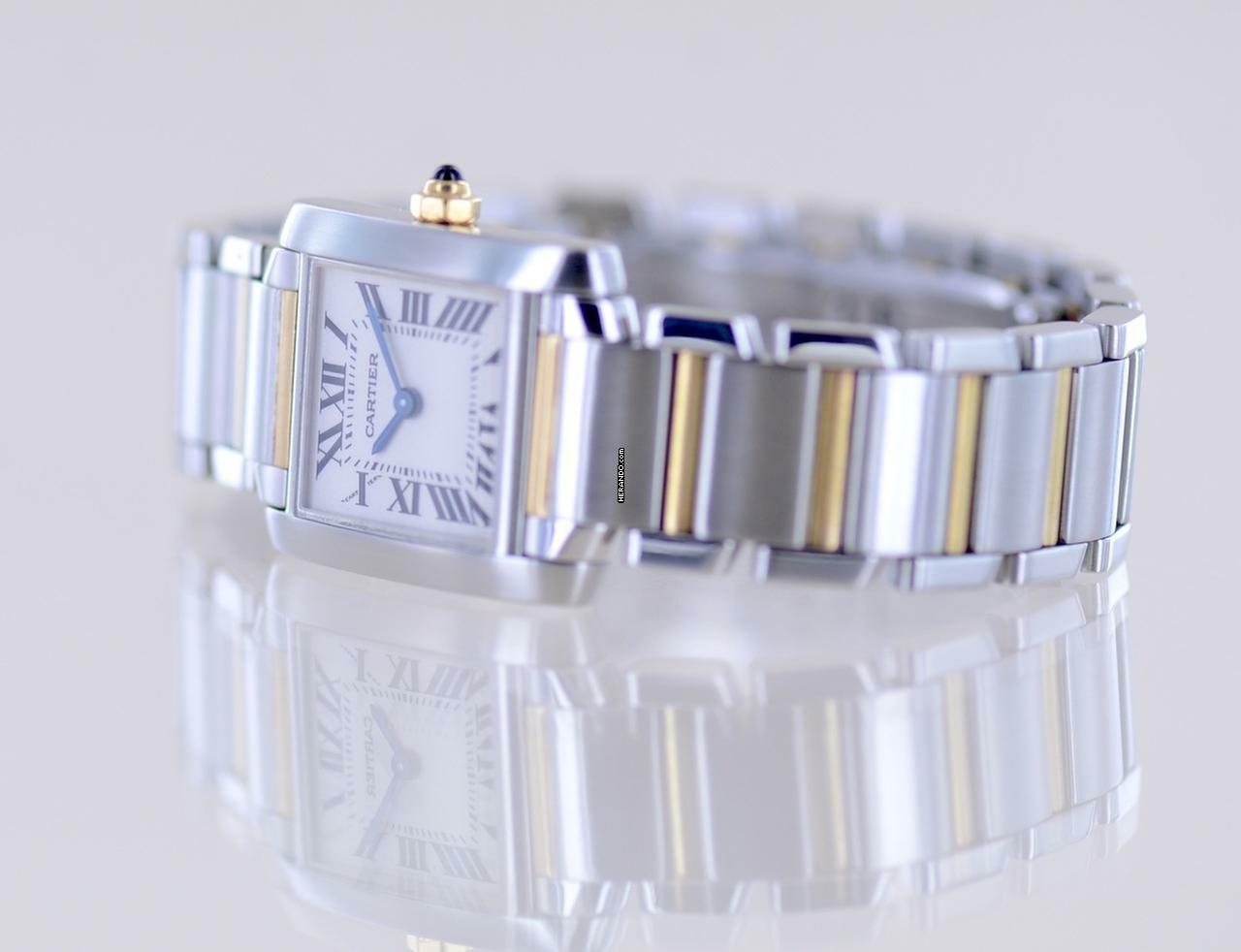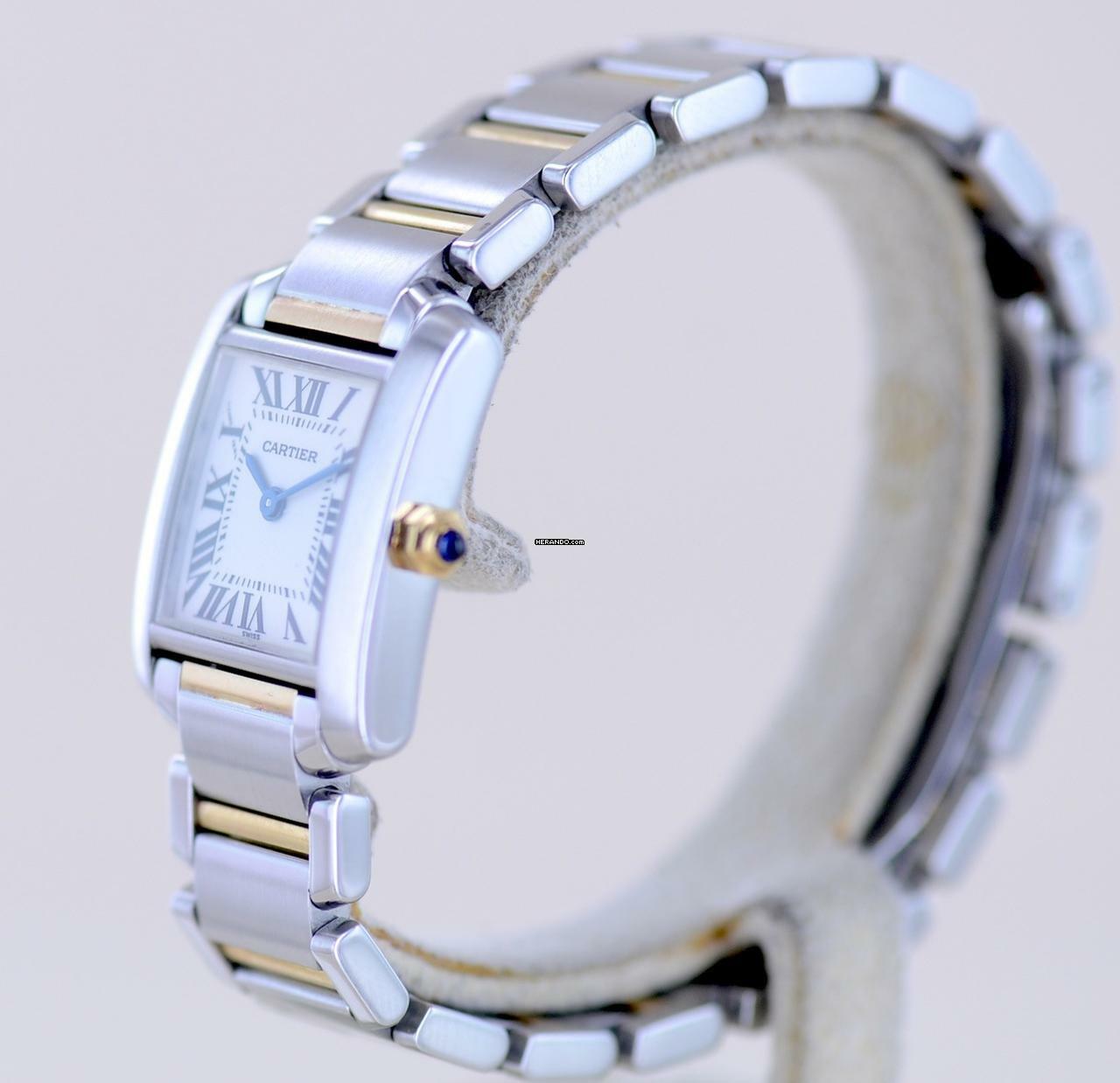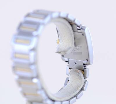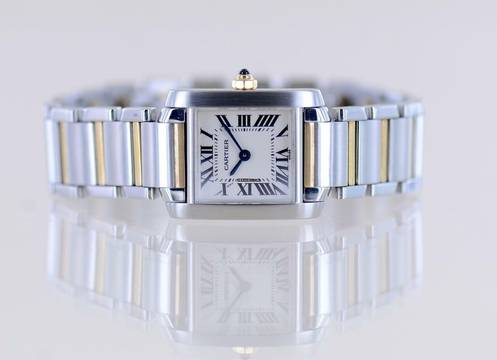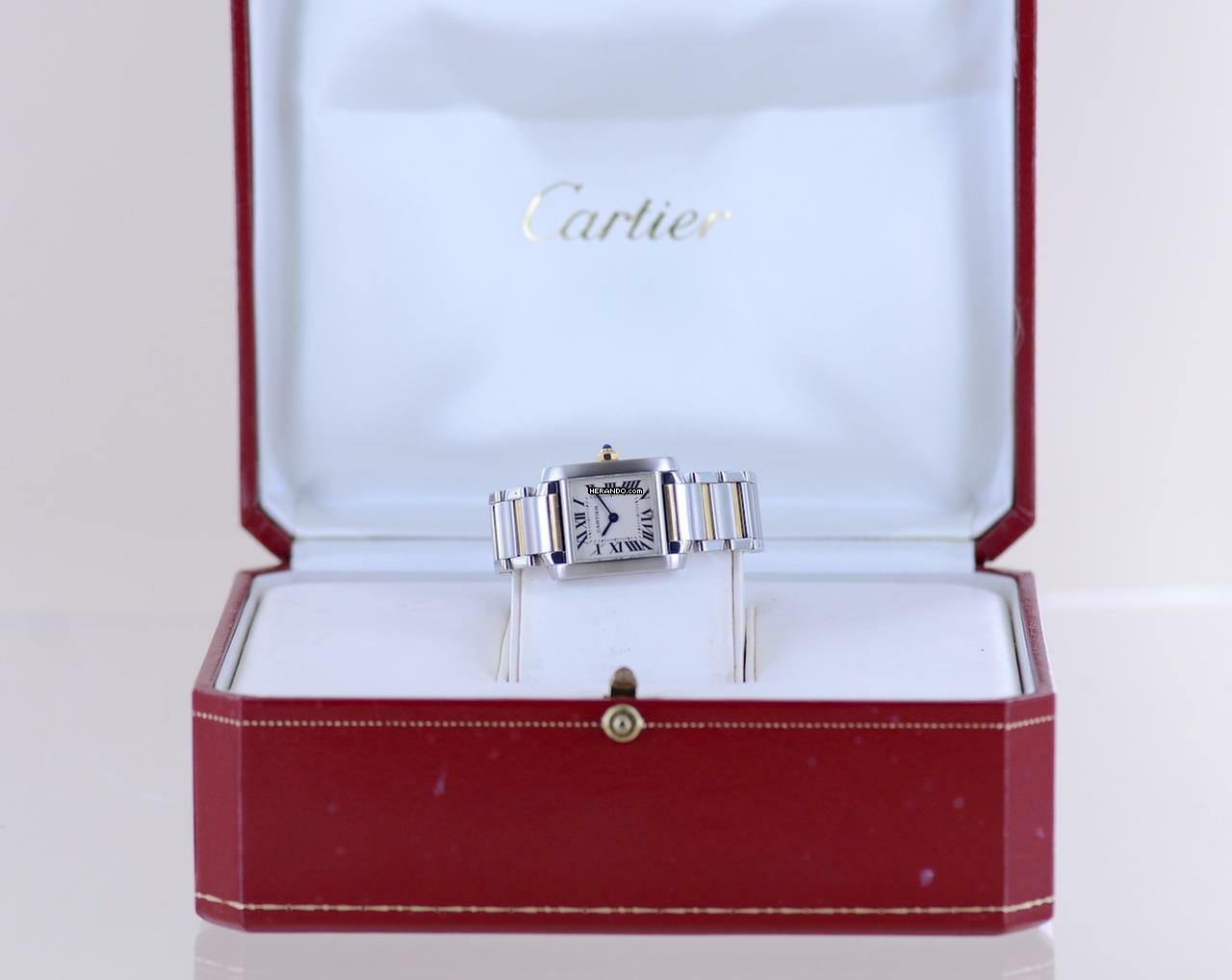 Sehr schöne und klassisch sportliche Cartier Tank Francaise in der beliebten Gold/Stahl-Ausführung. Es handelt sich um die Damenausführung mit der Referenz 2384. Dieser Klassiker wirkt mit den viereckigen Tank-Form und dem genialen Armband zeitlos schön. Das weiße Zifferblatt mit den römischen Ziffern erinnert an die 50er Jahre und neben Cartier-Uhren auch an bewährte Modelle von Jaeger LeCoultre oder Girard Perregaux.Die Zeiger sind hitzegebläut und die Uhr ist sehr gut ablesbar. Der blaue Saphir Cabochon auf der Krone gehört zum Markenzeichen der Modelle. Cartier setzt in Sachen Verarbeitung und Langlebigkeit von Bändern und Gehäuse absolut Maßstäbe in dieser Klasse.