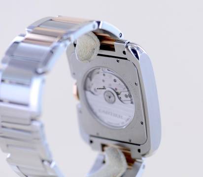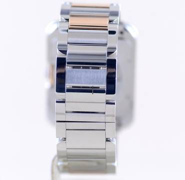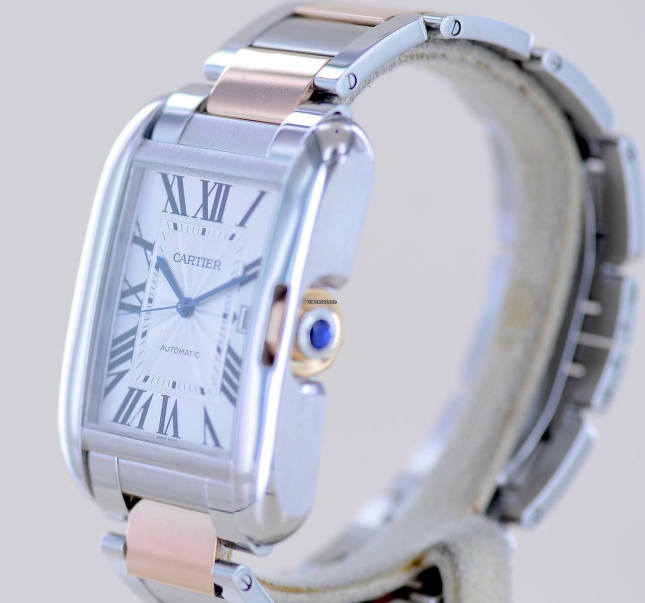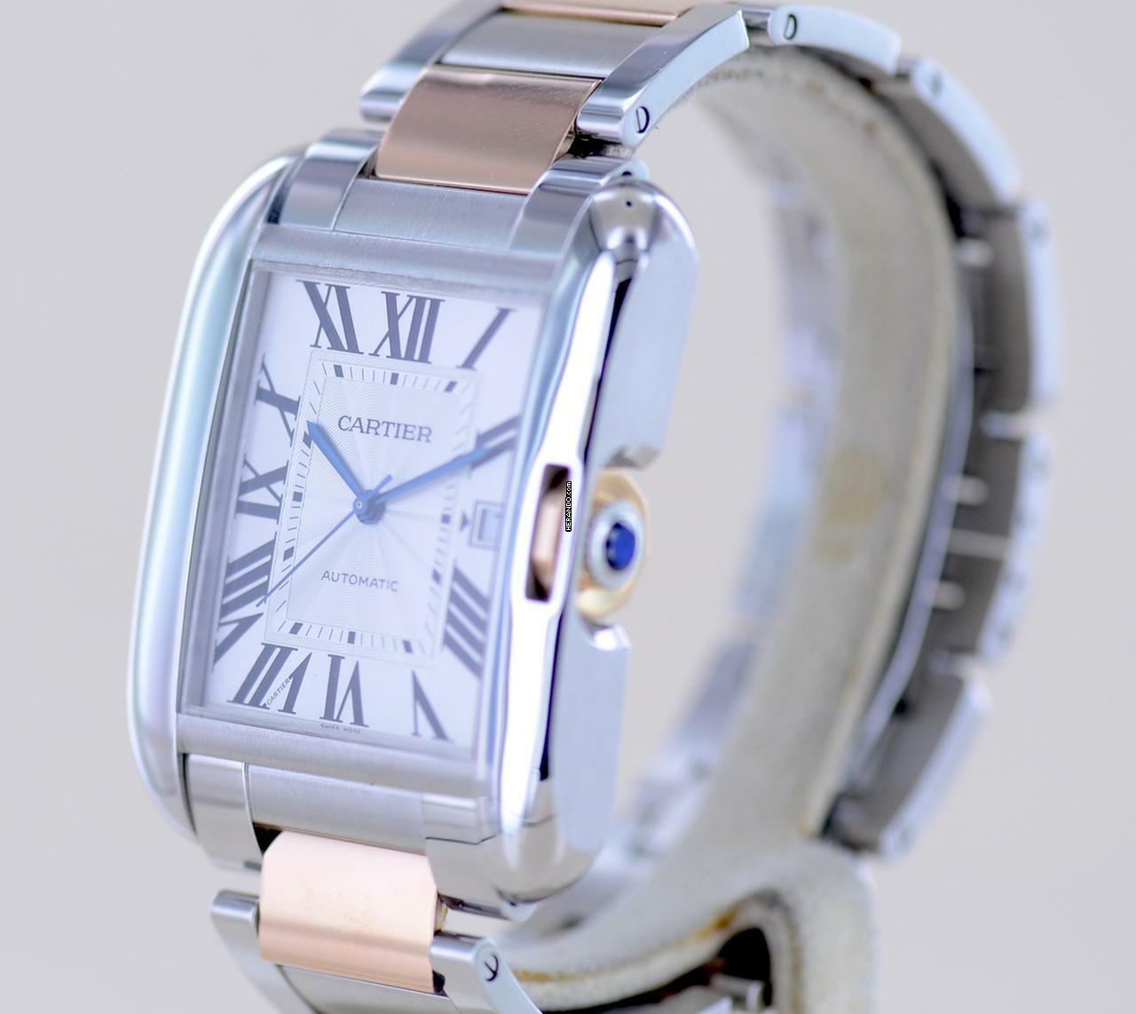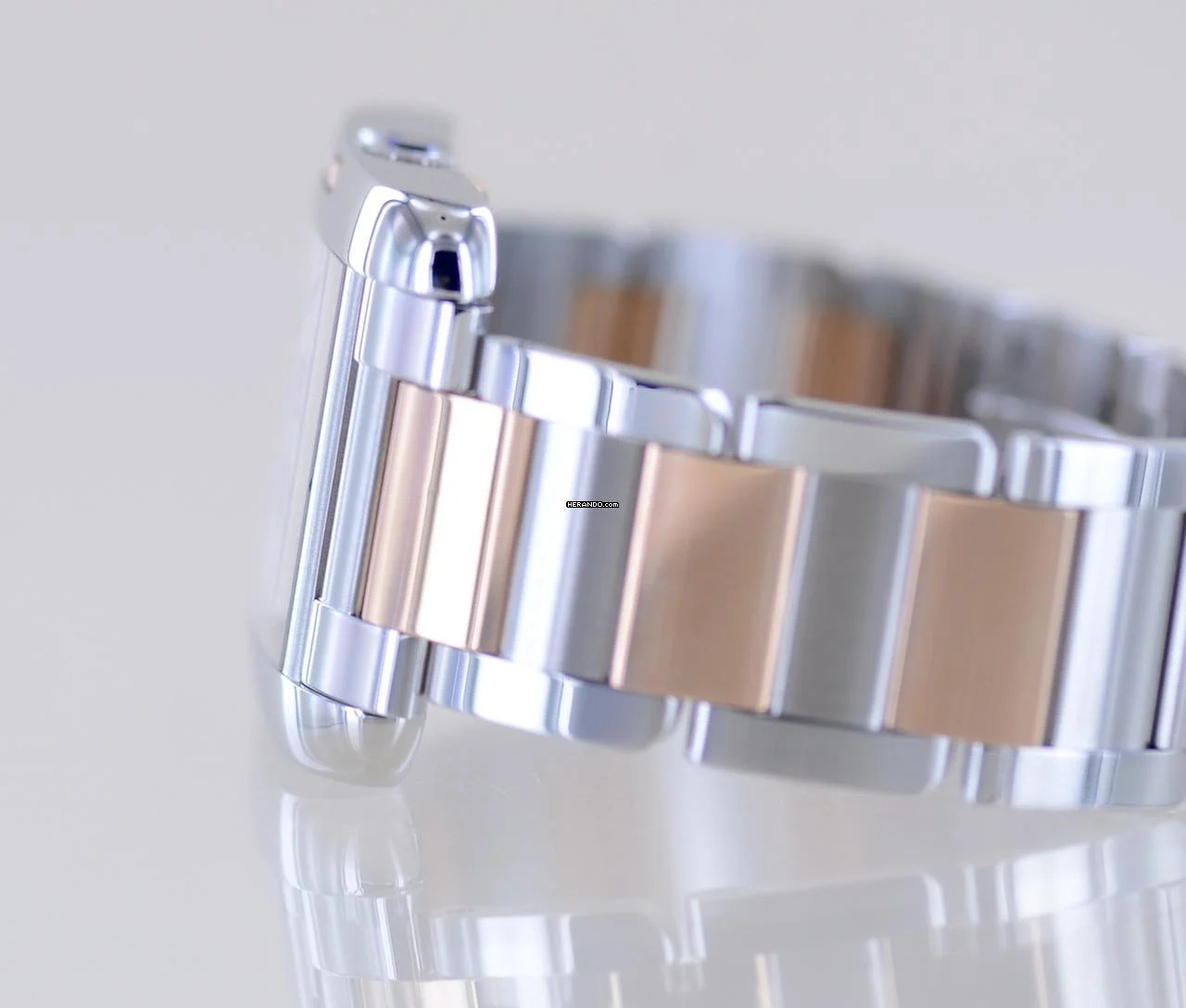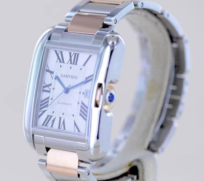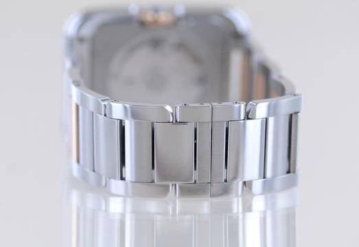 Sehr schöne und seltene Cartier Tank Anglaise XL in der seltenen Stahl-Roségoldausführung mit dem hochwertigen Cartier-Automatikkaliber. Es handelt sich um die größere Ausführung mit der Referenz 3507 / W5310006 . Eine geniale Herrenuhr, die nur selten zu sehen ist und sich ausgezeichnet trägt.Dieser Klassiker wirkt mit der großen Tank-Form und dem genialen Armband zeitlos schön. Das silberne Zifferblatt mit den römischen Ziffern erinnert an die 50er Jahre und neben Cartier-Uhren auch an bewährte Modelle von Jaeger LeCoultre oder Girard Perregaux. Die Zeiger sind gebläut / poliert und sehr gut ablesbar. Der blaue Saphir Cabochon auf der Krone gehört zum Markenzeichen der Modelle. In diesem Fall integriert in die große roségoldenen Aufzugskrone, die durch das Gehäuse nach oben zu sehen ist.