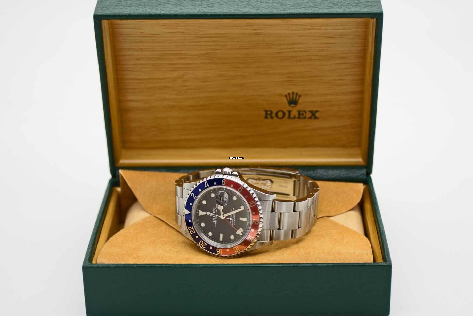 GMT Master II 16710, 40 mm Gehäuse mit schwarzem SL Zifferblatt und perfekt gefadeter Pepsi Lünette sowie passendem Rolex Oysterarmband ohne Spannungsverlust. Perfektes Fullset in Rolex Box mit Umkarton, GMT Master Anleitung, Oyster Booklet, Chronometer Booklet, Leder Etui, zweitem Lünetten Inlay, Hang Tag mit passender Gehäuse Nr., Rolex Siegel und Rolex Garantiezertifikat aus 04/2000 (A-Serie/Swiss Made Dial). Dieser Neo-Vintage Klassiker Uhr befindet sich in perfektem und sehr gepflegtem Zustand. Inzahlungnahmen sind auf Herando nicht möglich. Bitte sprechen Sie uns hierzu an.