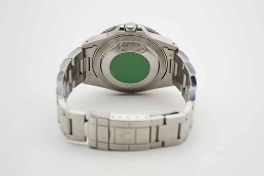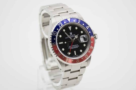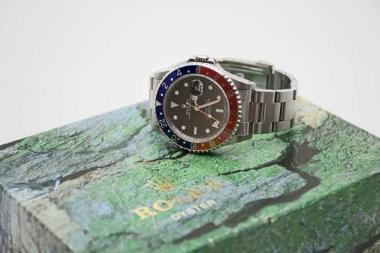 GMT Master II 16710, 40 mm case with black SL/Swiss Made dial, perfectly faded Pepsi bezel and Rolex Oyster bracelet with zero stretch. Perfect full set in Rolex inner and outer box with GMT Master manual, Oyster booklet, Chronometer booklet, black bezel inlay, leather wallet, hang tag with bar code and matching case no., Rolex tag and Rolex warranty certificate from 04/2000 (A-Serie/ green SL version). This neo vintage GMT comes in perfect and mint condition. Please keep in mind that our complete inventory is stored in our bank safe for safety purposes.