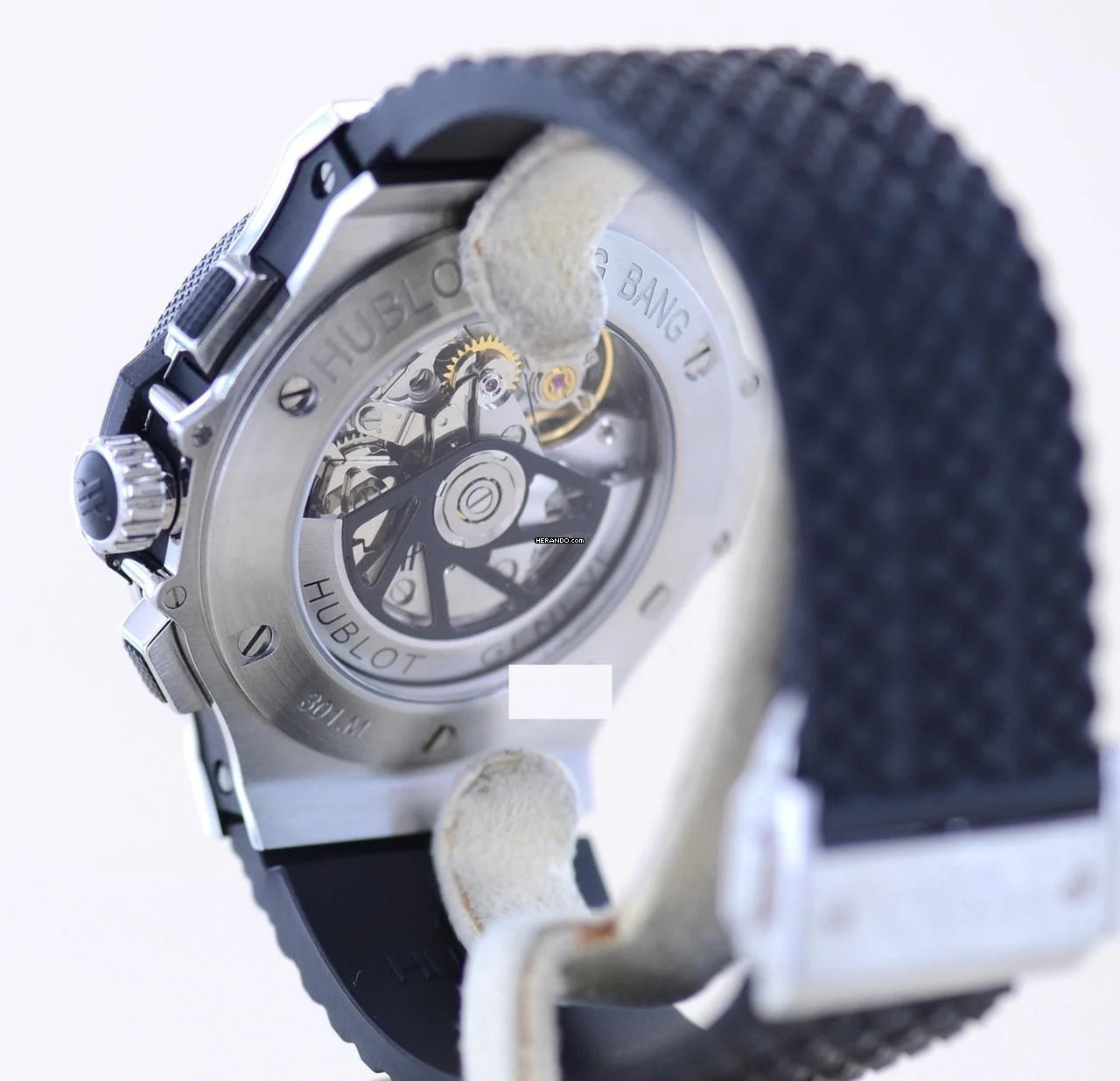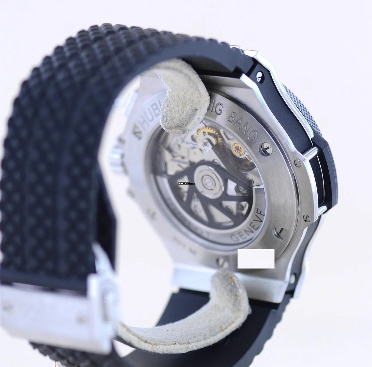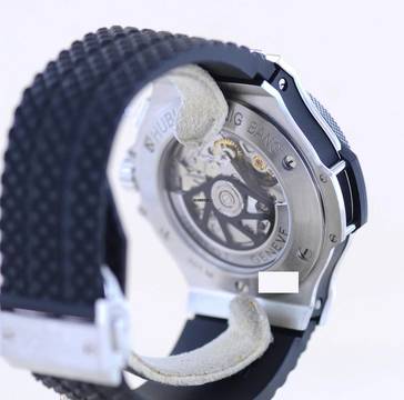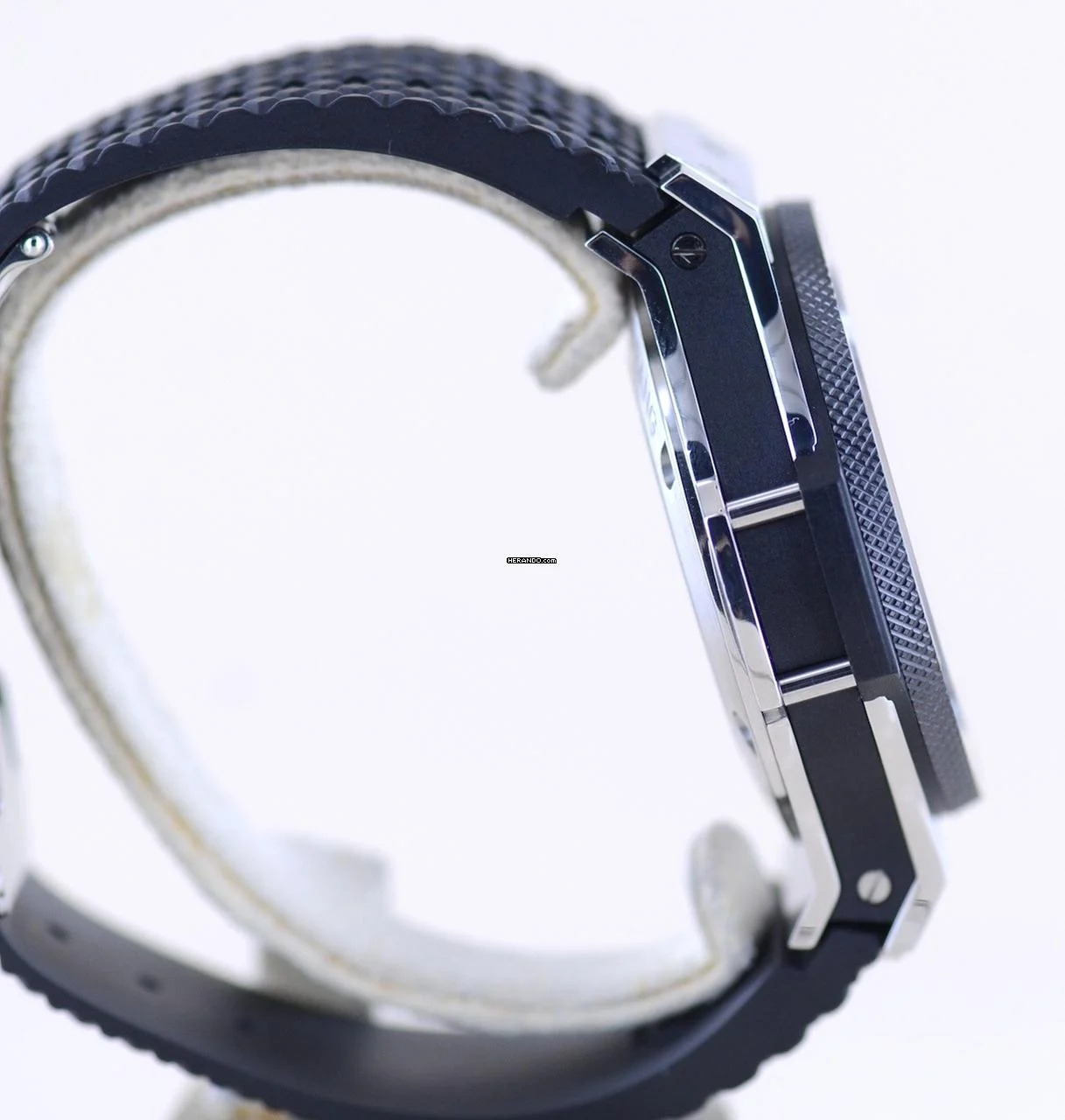 Obwohl die Uhr von den Dimensionen her nicht gerade klein ist, trägt sie sich super angenehm. Das perfekte Kautschukband verschmilzt förmlich mit dem Handgelenk. Die Hublot macht sich bestens am Handgelenk und steht für sportlichen, extravaganten Luxus. Das geniale, schwarze Blatt hat eine coole Oberfläche und verfügt über Leuchtindizes und Leuchtzeiger, der es auch nachts gut ablesbar machen. Das Datum, welches der Uhr ihre Alltagstauglichkeit verleiht, befindet sich dezent zwischen 4 und 5.