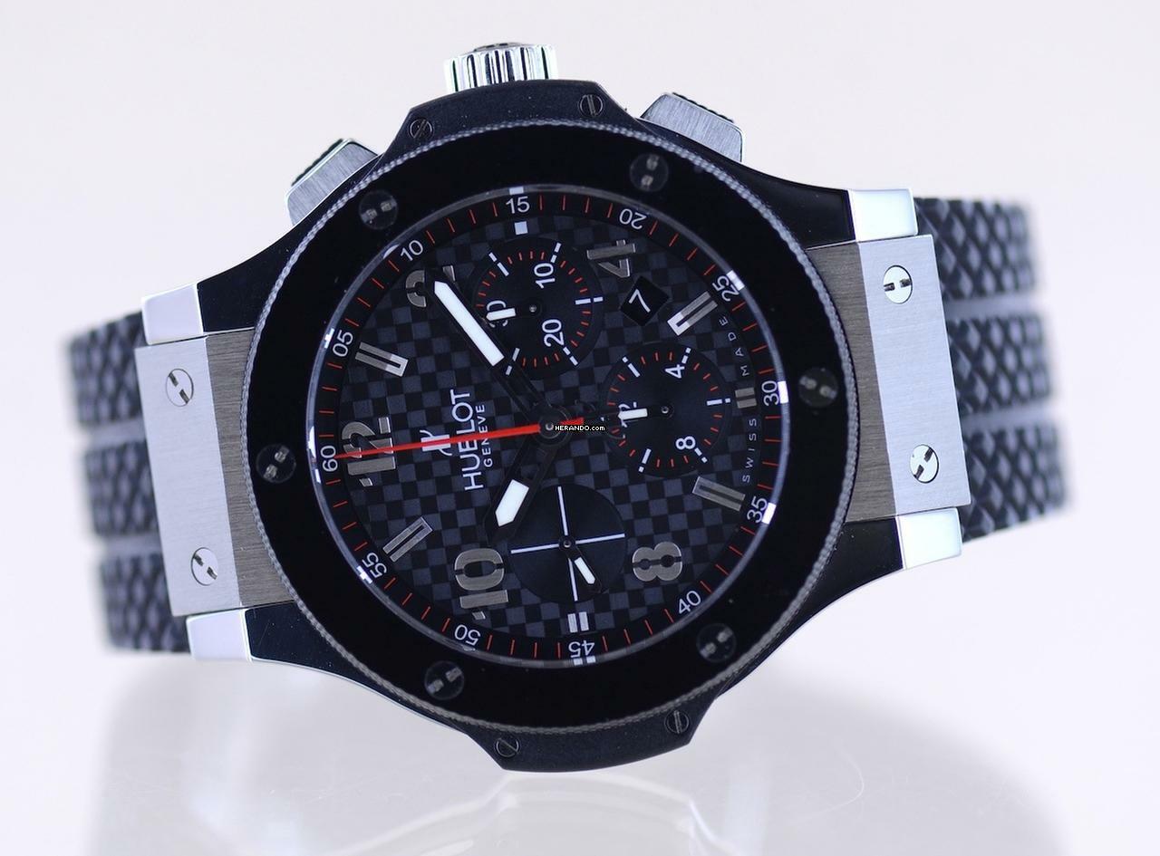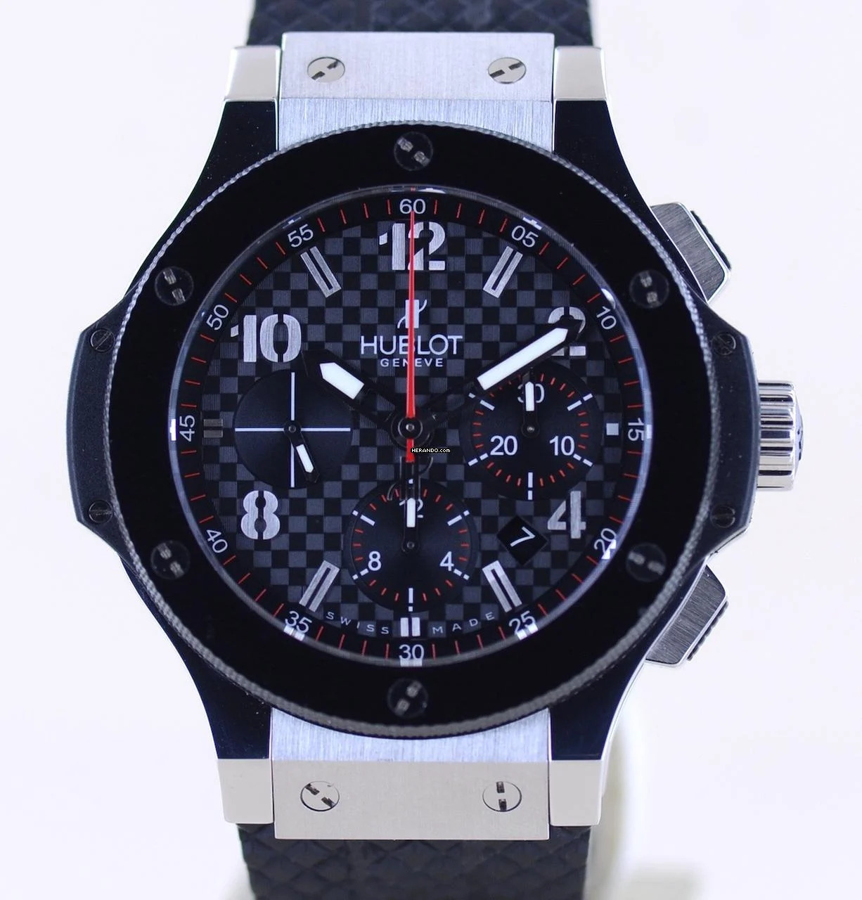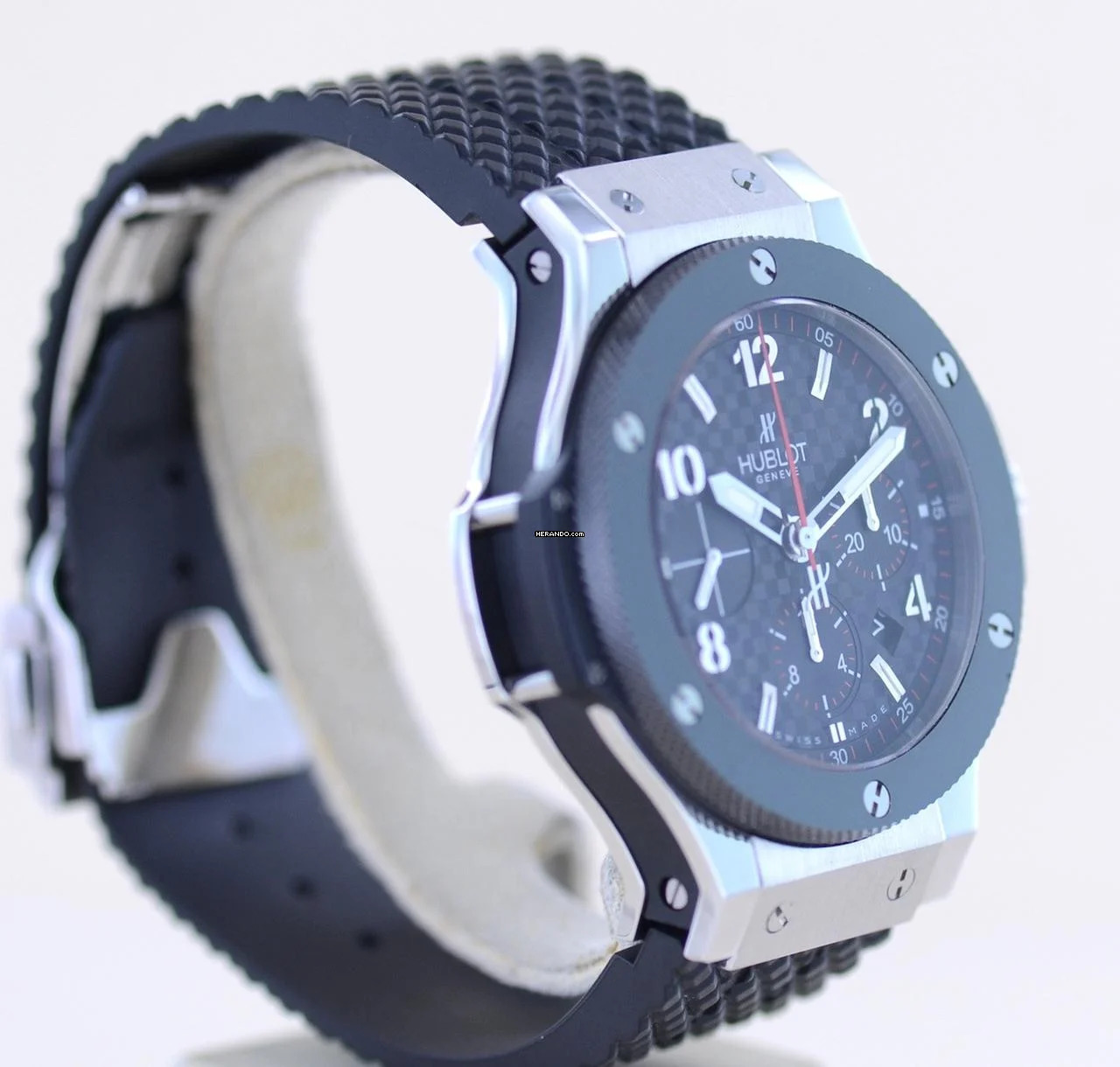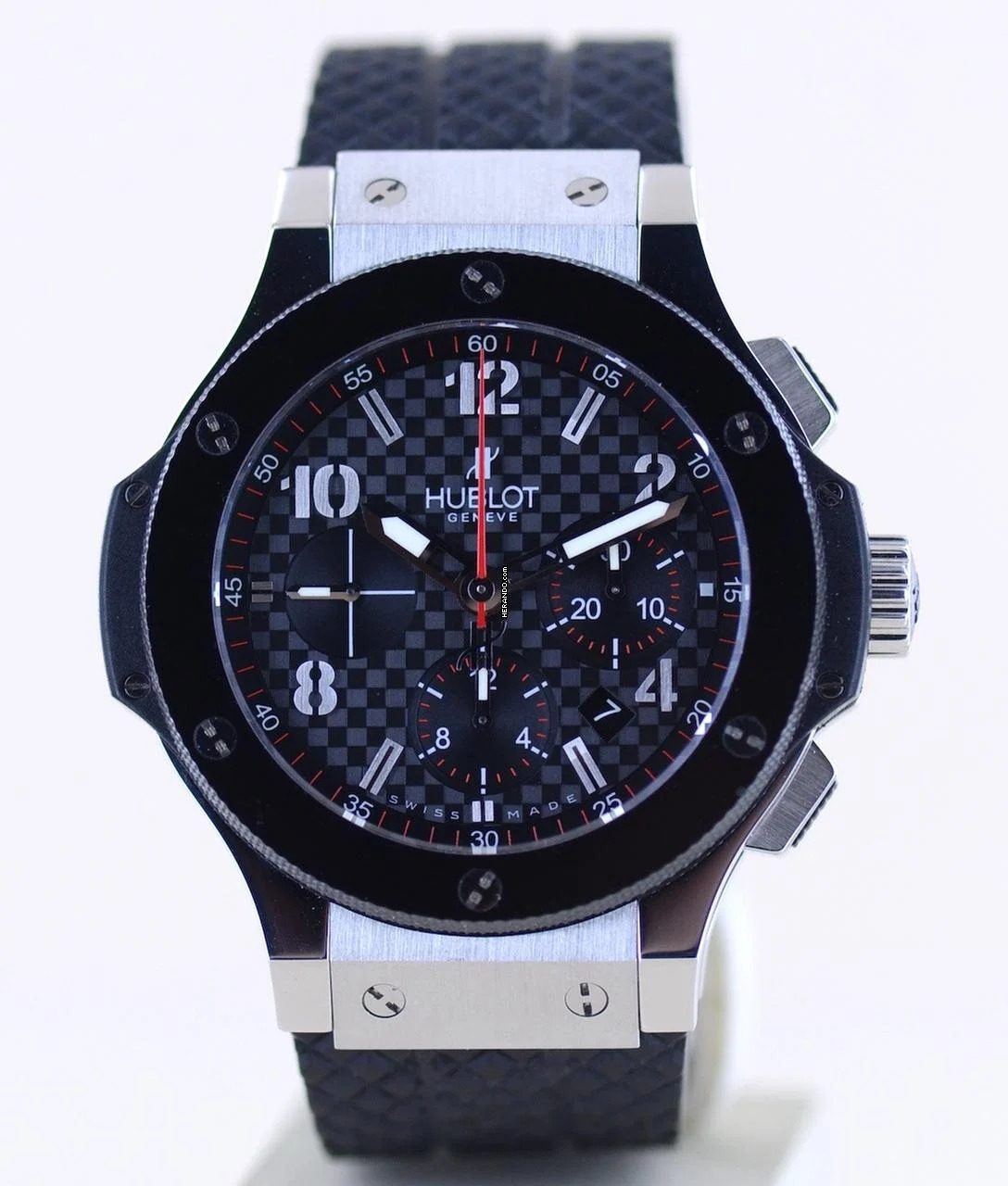 Sehr schöne, sportlich luxuriöse Hublot Big Bang Stahl mit schwarzem Zifferblatt und schwarzer Keramiklünette. Das Blatt ist in Racing-Carbon-Optik gehalten und wirkt durch die roten Elemente sowie dem roten Stoppsekundenzeiger sehr sportlich. In Kombination mit der glatten Keramiklünette eine coole zeitlose Kombination.Die Uhr trägt sich mit 44 mm plus Krone als schöne, präsente Größe zum Hemd oder auch Freizeitoutfit. Das markante Gehäuse und das perfekte Band bilden eine sportliche Uhr mit hohem Wiedererkennungswert. Das Gehäuse ist teils poliert und teils satiniert und eine legendäre Materialkombination.