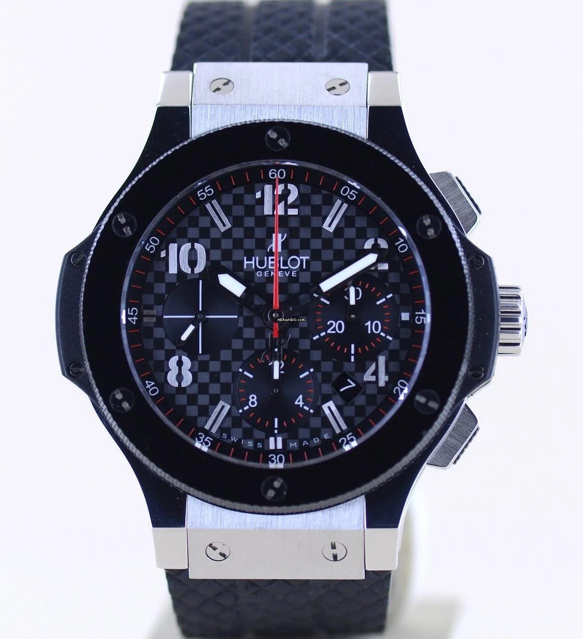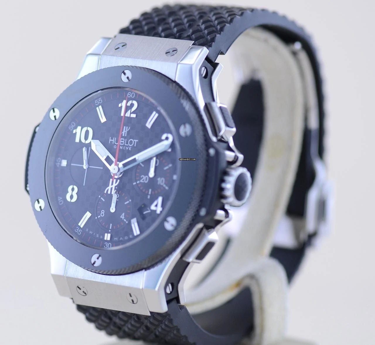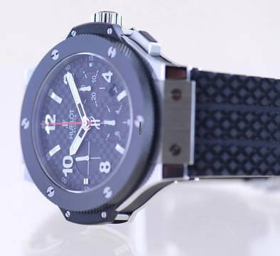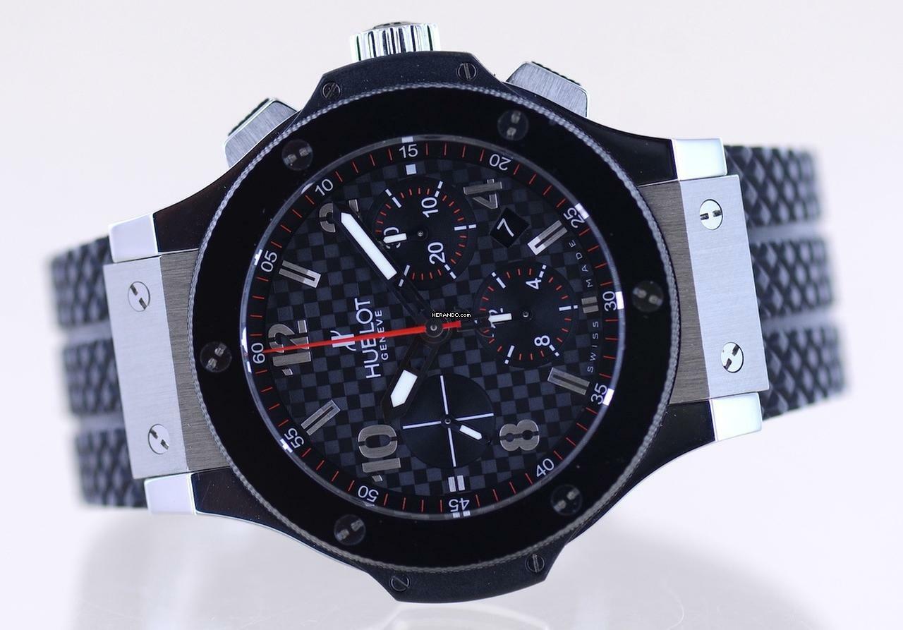 Sehr schöne, sportlich luxuriöse Hublot Big Bang Stahl mit schwarzem Zifferblatt und schwarzer Keramiklünette. Das Blatt ist in Racing-Carbon-Optik gehalten und wirkt durch die roten Elemente sowie dem roten Stoppsekundenzeiger sehr sportlich. In Kombination mit der glatten Keramiklünette eine coole zeitlose Kombination.Die Uhr trägt sich mit 44 mm plus Krone als schöne, präsente Größe zum Hemd oder auch Freizeitoutfit. Das markante Gehäuse und das perfekte Band bilden eine sportliche Uhr mit hohem Wiedererkennungswert. Das Gehäuse ist teils poliert und teils satiniert und eine legendäre Materialkombination.
