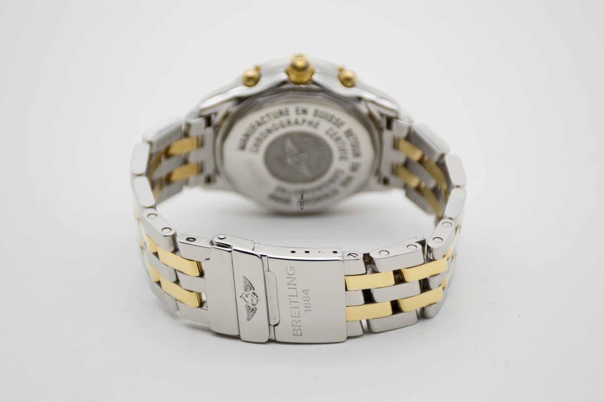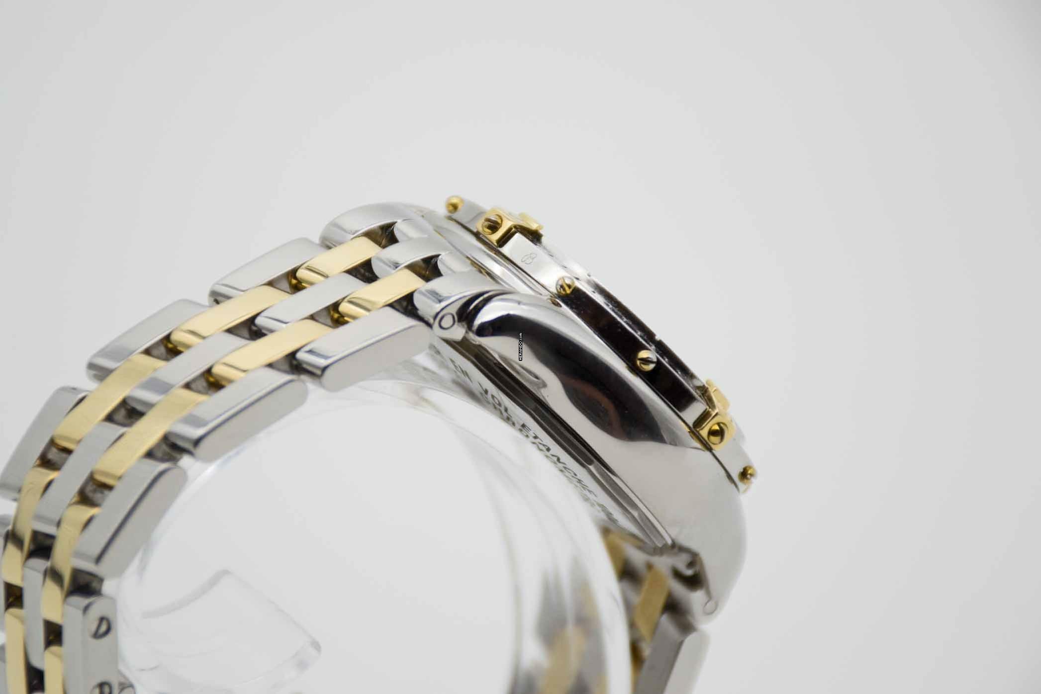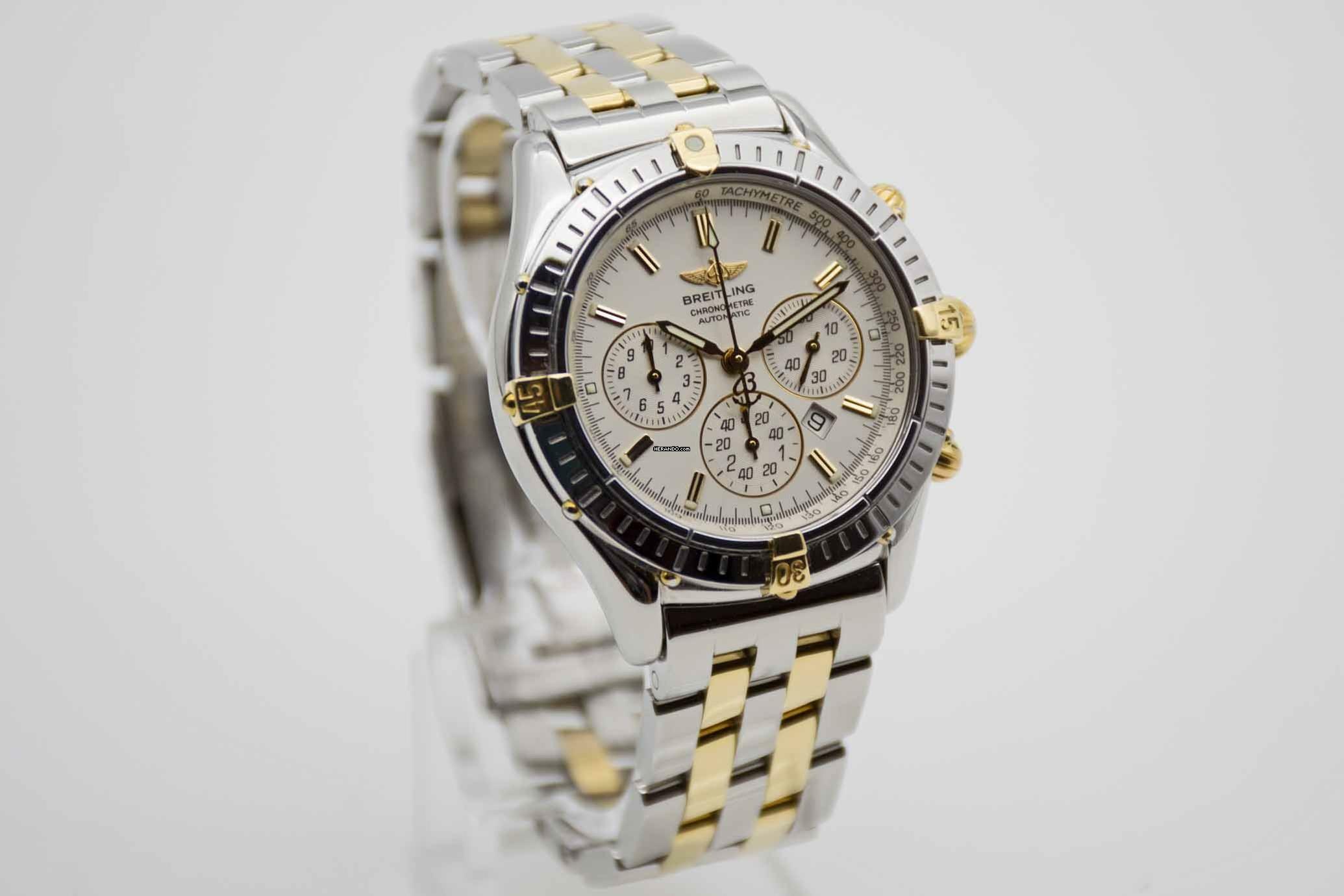 Shadow Flyback Chronomat B35312, 38 mm Sthal/Gold Gehäuse mit beigem Zifferblatt und perfektem Breitling Stahl/Gold Armband ohne Spannungsverlust. Komplettes Fullset aus Erstbesitz in Breitling Box mit Umkarton, Dokumentenetui, Bedienungsanleeitung, Chronometer Gangschein, neuem Service und Breitling Garantiezertifikat aus 2000 (deutsche Aulieferung). Top gepflegte Neovintage Pilotenuhr aus erster Hand in perfektem Zustand. Shadow Flyback Chronomat B35312, 38 mm stainless steel/18ct gold case with beige index dial and Breitling bicolor bracelet with zero stretch. Perfect full set in Breitling inner and outer box, with Chronometer certificate, document wallet, Shadow manual, new main service and Breitling warranty certificate from 2000 (LC100/German delivery). The watch comes from the first owner and is in perfect and mint condition.