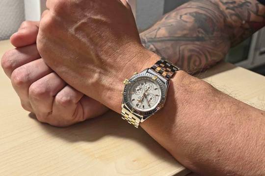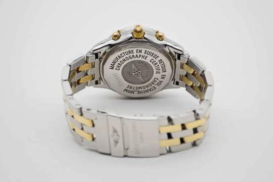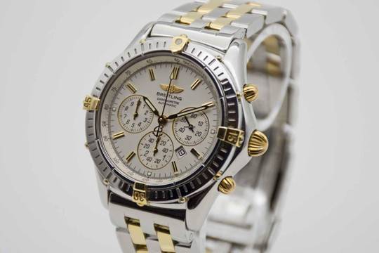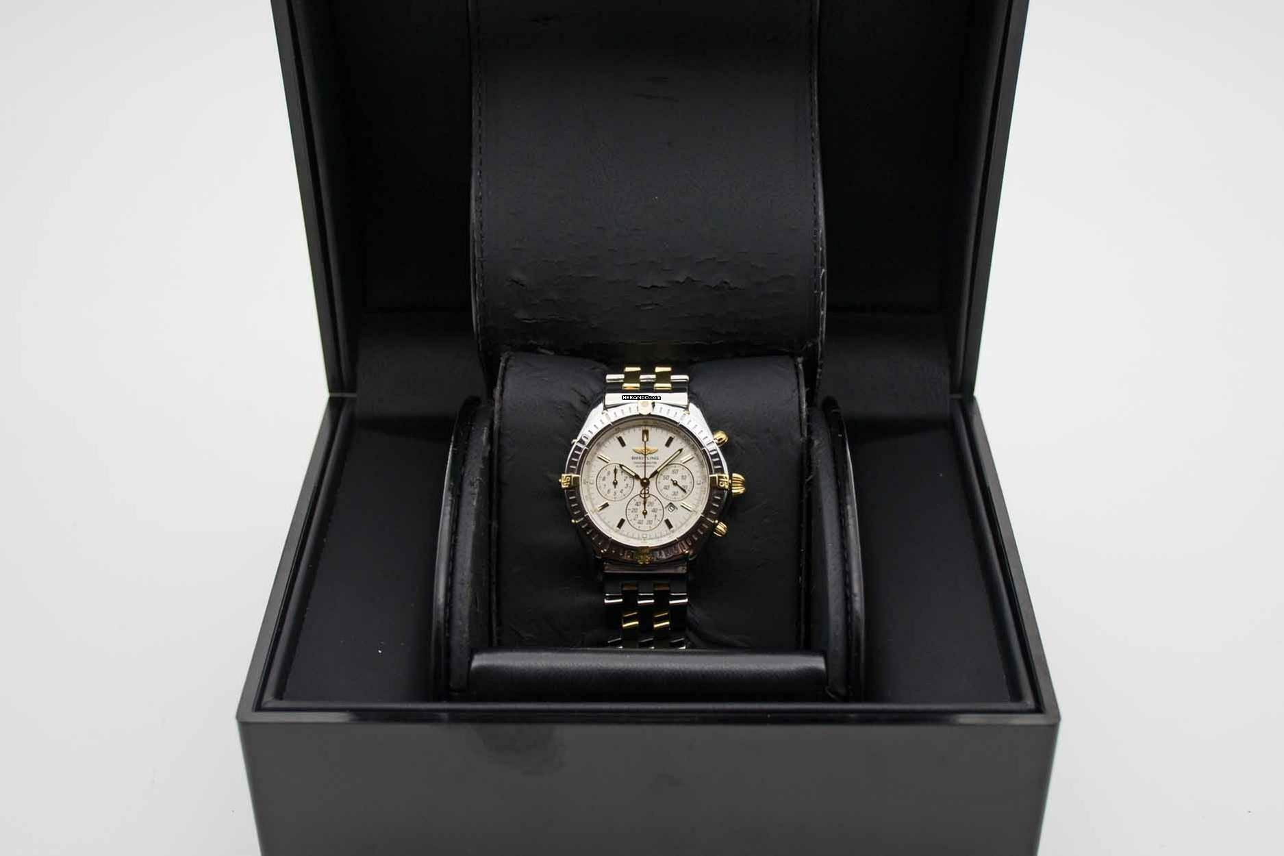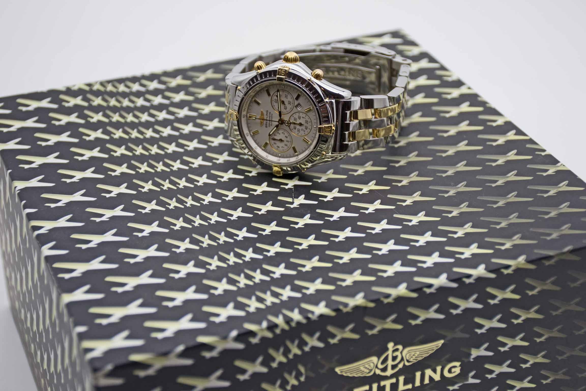 Shadow Flyback Chronomat B35312, 38 mm Sthal/Gold Gehäuse mit beigem Zifferblatt und perfektem Breitling Stahl/Gold Armband ohne Spannungsverlust. Komplettes Fullset aus Erstbesitz in Breitling Box mit Umkarton, Dokumentenetui, Bedienungsanleeitung, Chronometer Gangschein, neuem Service und Breitling Garantiezertifikat aus 2000 (deutsche Aulieferung). Top gepflegte Neovintage Pilotenuhr aus erster Hand in perfektem Zustand. Shadow Flyback Chronomat B35312, 38 mm stainless steel/18ct gold case with beige index dial and Breitling bicolor bracelet with zero stretch. Perfect full set in Breitling inner and outer box, with Chronometer certificate, document wallet, Shadow manual, new main service and Breitling warranty certificate from 2000 (LC100/German delivery). The watch comes from the first owner and is in perfect and mint condition.