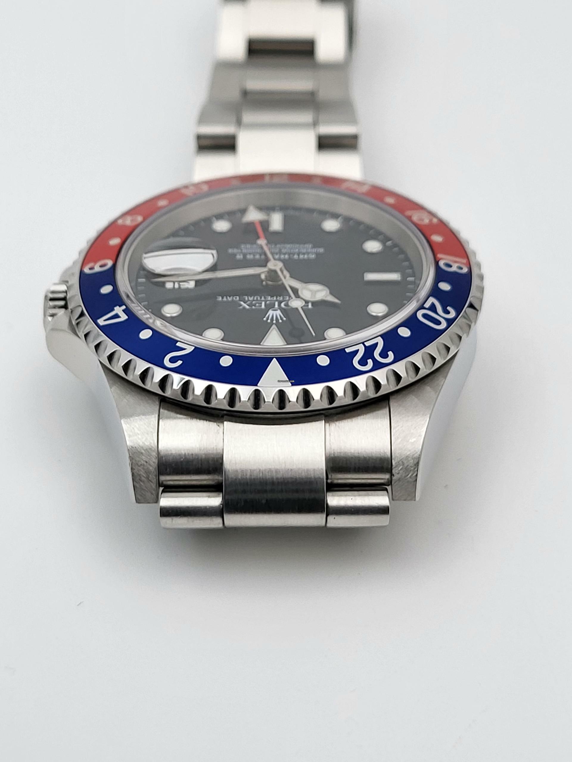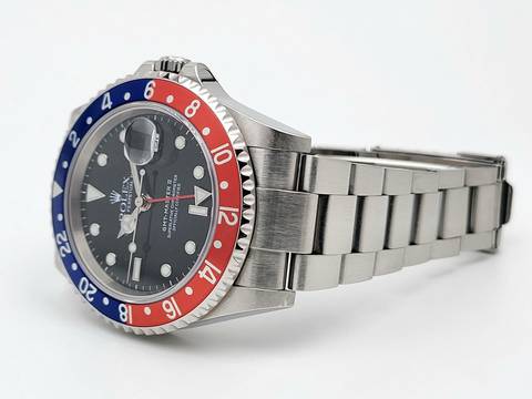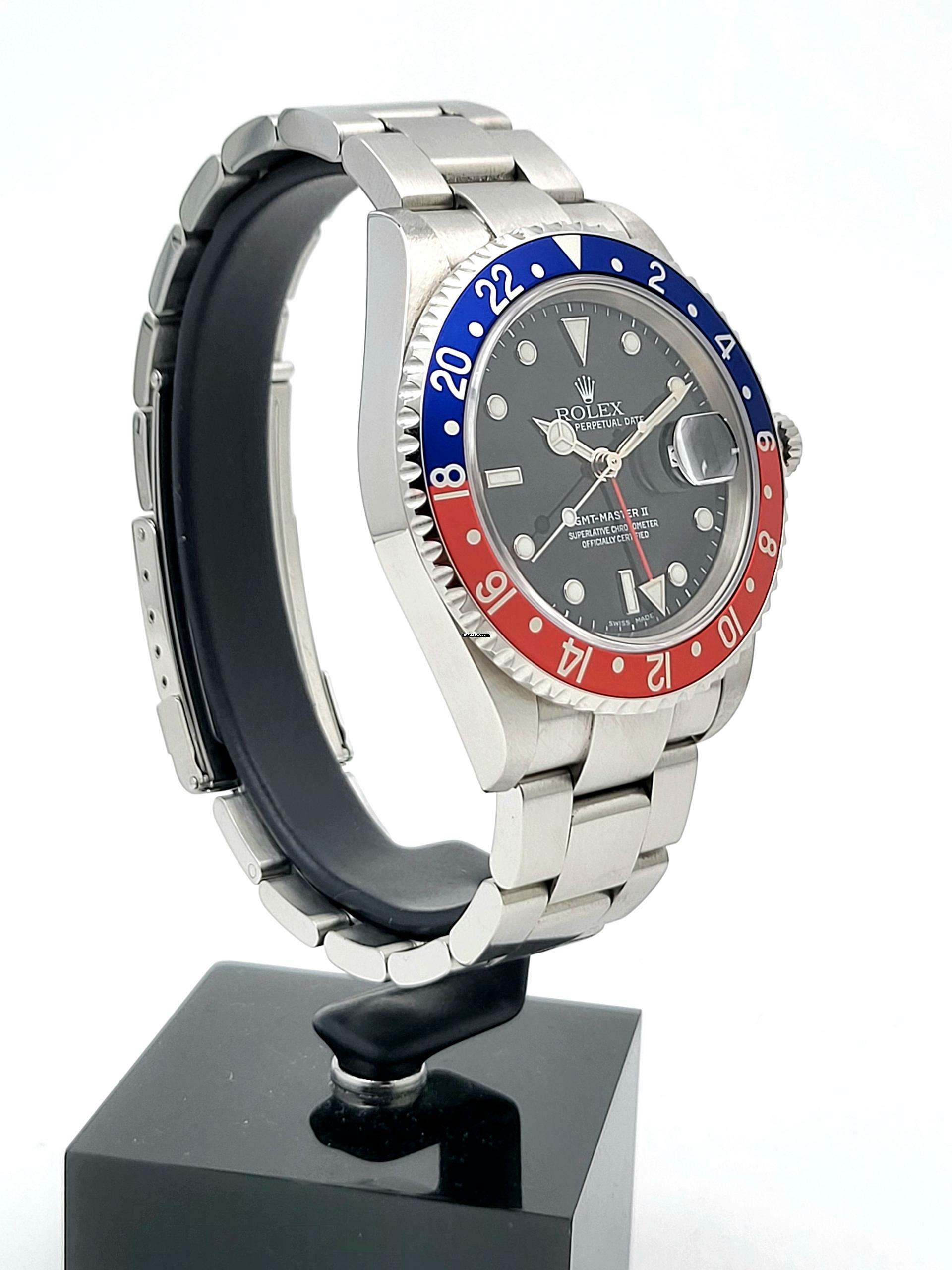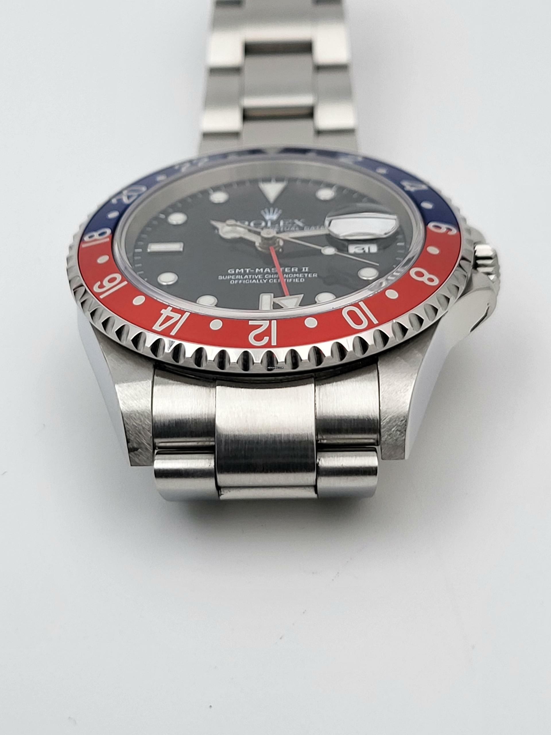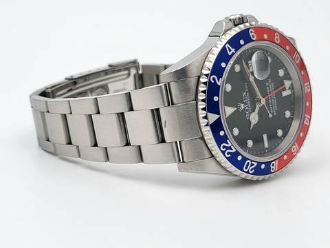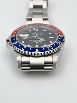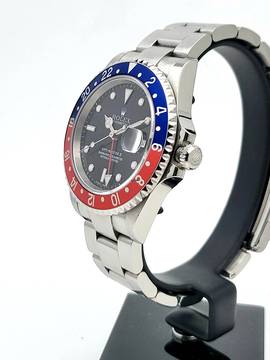 For sale is this Rolex GMT Master II Pepsi 40 mm. steel with red and blue bezel, a black dial and Oyster-Bracelet.