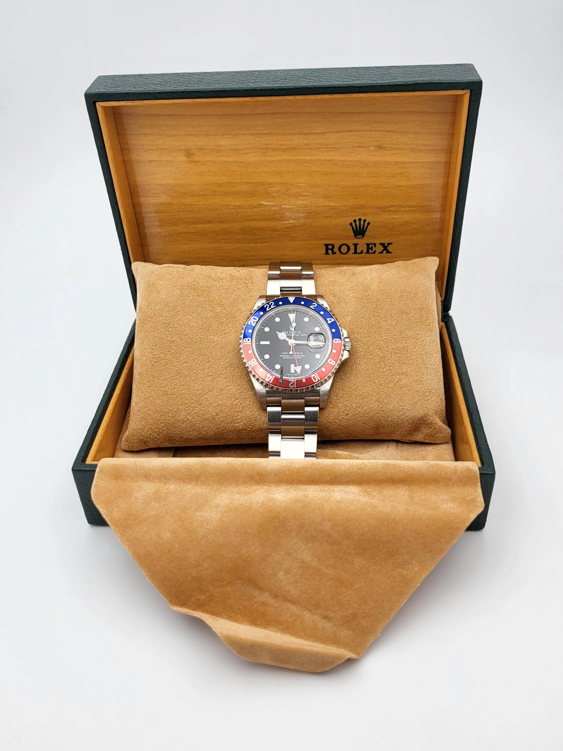 Zum Verkauf steht diese schöne Rolex GMT-Master II Pepsi. in Stahl mit rot blauer Lünette und schwarzem Zifferblatt an einem Oysterband. Die Uhr befindet sich in einem optisch und technisch guten bis sehr guten Zustand mit kleineren Gebrauchsspuren, dies sollten auf den Zoom -Bildern erkennbar sein!