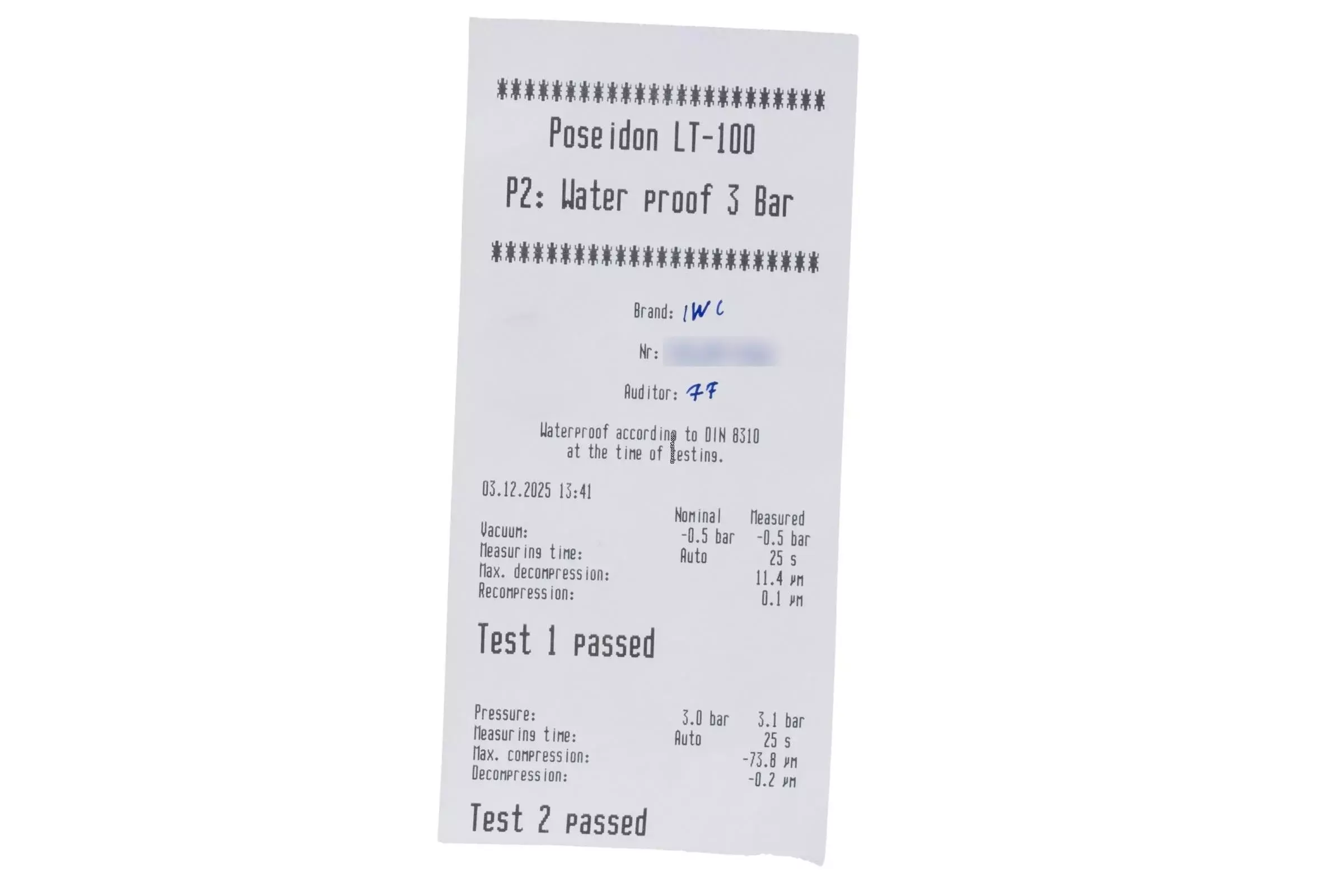 * Wenn die Uhr positiv auf Wasserdichtigkeit getestet wurde, dann gilt diese Eigenschaft zum Zeitpunkt der Messung. Wasserdichtigkeit ist nach DIN 8310 keine bleibende Eigenschaft. Sie sollte jährlich und vor besonderen Belastungen überprüft werden, da die eingebauten Dichtelemente in ihrer Funktion und im täglichen Gebrauch nachlassen. Einflüsse wie starke Temperaturschwankungen, Chlor, Seife oder Salzwasser wirken sich negativ auf die Wasserdichtigkeit aus.