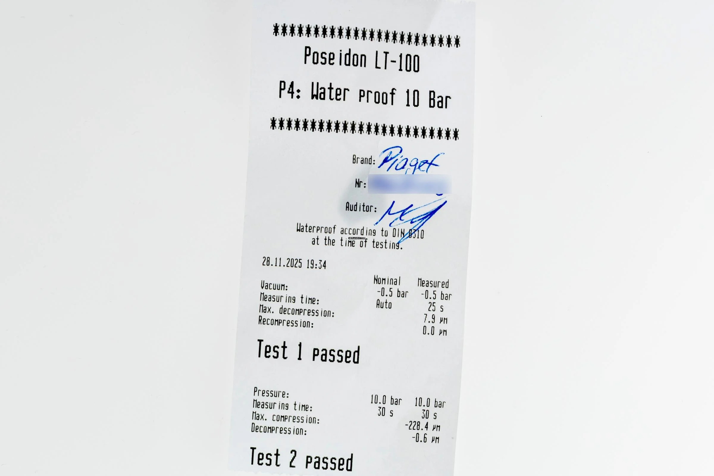 * Wenn die Uhr positiv auf Wasserdichtigkeit getestet wurde, dann gilt diese Eigenschaft zum Zeitpunkt der Messung. Wasserdichtigkeit ist nach DIN 8310 keine bleibende Eigenschaft. Sie sollte jährlich und vor besonderen Belastungen überprüft werden, da die eingebauten Dichtelemente in ihrer Funktion und im täglichen Gebrauch nachlassen. Einflüsse wie starke Temperaturschwankungen, Chlor, Seife oder Salzwasser wirken sich negativ auf die Wasserdichtigkeit aus.