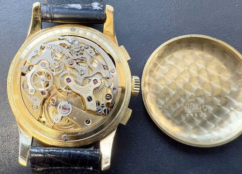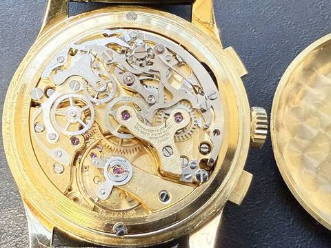 Zustand: Sehr guter gebrauchter Zustand mit leichten Tragespuren (siehe orig. Fotos), das Uhrwerk wurde durch unseren Uhrmachermeister komplett überholt, alle Funktionen sind einwandfrei.