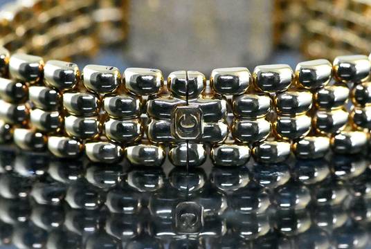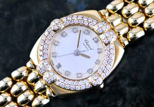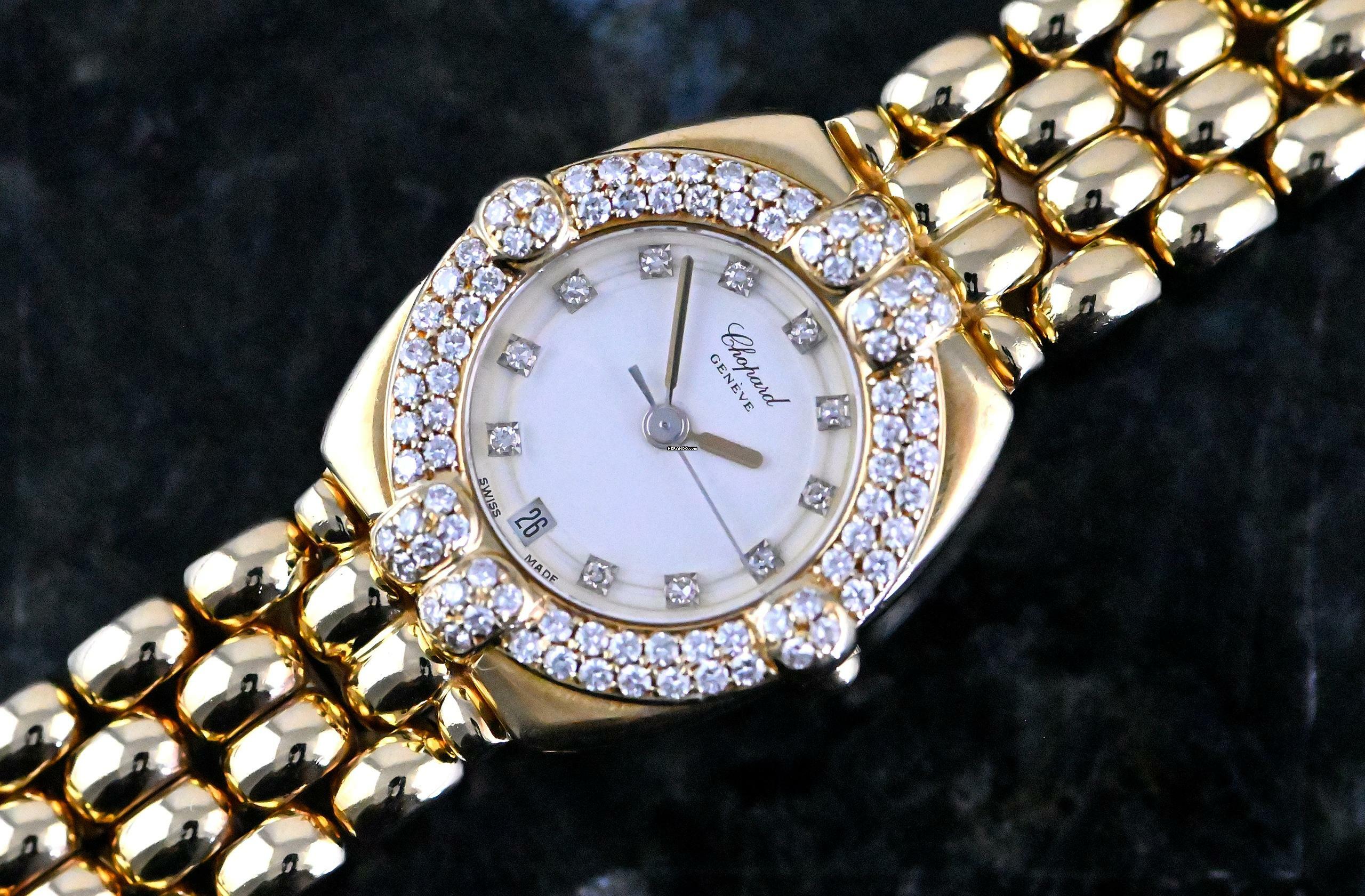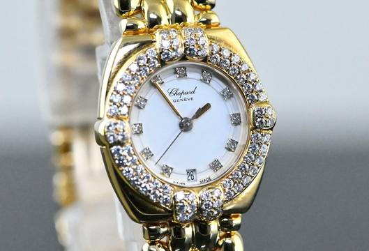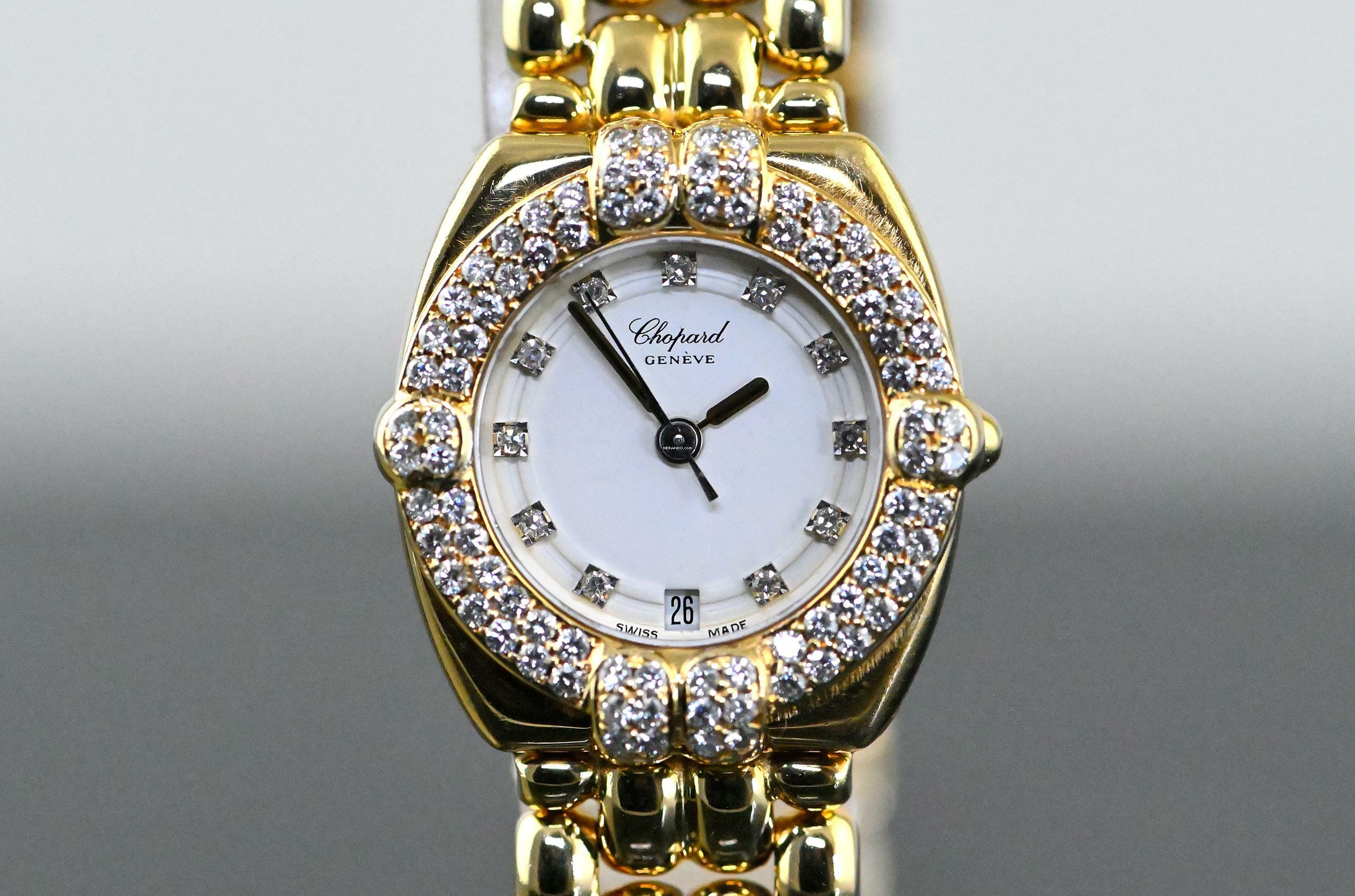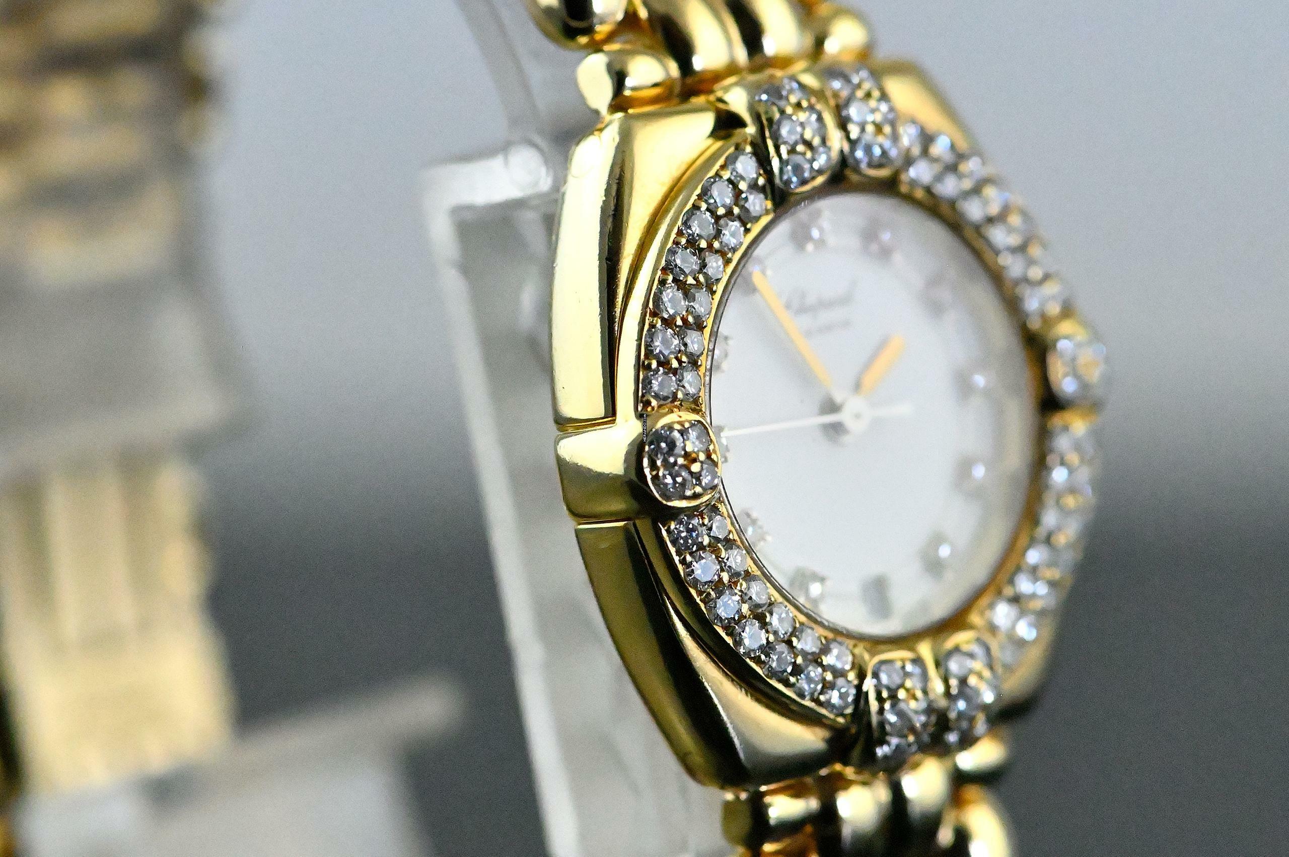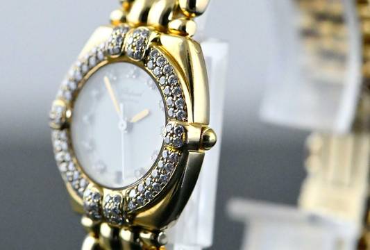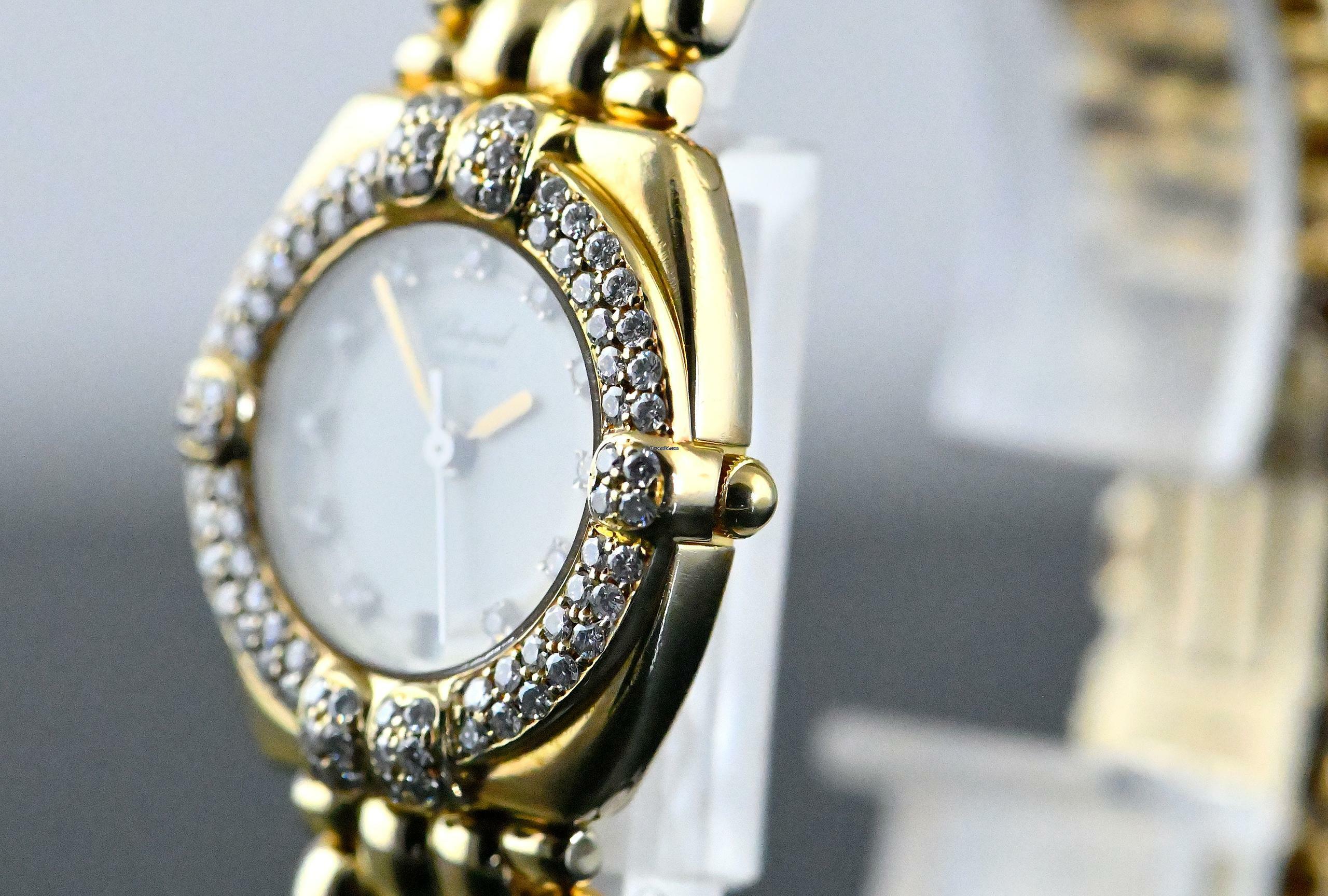 Chopard Gstaad | reference number 32/5120/11 - 5229 | in 18k yellow gold | Chopard quartz movement | bezel is set with 84 brilliant-cut diamonds (approx. 0.75 carats) | white dial set with 11 diamonds | case diameter without the crown of 24 mm | original Chopard gold bracelet with original double folding clasp in yellow gold | inner circumference of the bracelet measures approx. 16.5 cm | total weight approx. 88.3 grams | good worn condition.