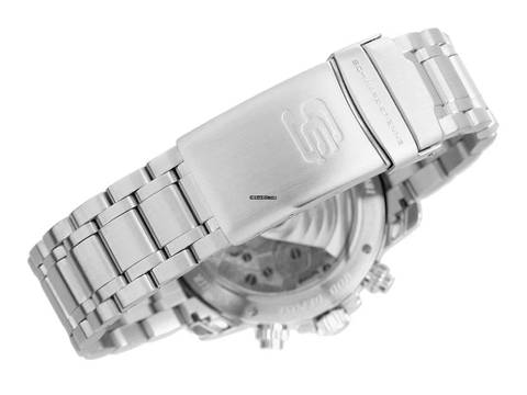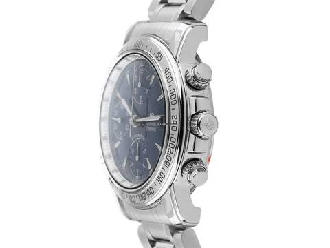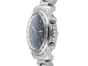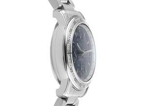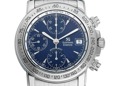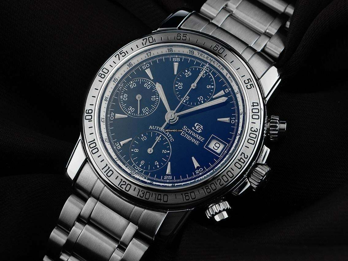 Schwarz Etienne Depose Stahl Automatik Chronograph Armband Stahl Gehäuse Edelstahl poliert und satiniert, Gehäusedurchmesser ohne Krone 39mm, Gehäusehöhe 13,7mm. Lünette Edelstahl mit gravierter Tachymeter Skala. Armband Edelstahl satiniert, Sicherheitsfaltschließe Edelstahl mit Hersteller-Logo. Zifferblatt blau mit aufgesetzten Edelstahl Keilindexen und polierten Zeigern. Uhrwerk Automatik, Chronograph, Kaliber ETA Valjoux 7750 mit 26 Edelsteinen. Anzeige von Stunde und Minute über Zeiger aus der Mitte, kleine Sekunde mit Sekundenstopp zur sekundengenauen Einstellung der Uhrzeit bei 9 Uhr, Datumsanzeige mit Schnellverstellung bei 3 Uhr. Saphirglas gewölbt und kratzfest. Krone verschraubbar mit Flankenschutz und Hersteller-Logo. Boden Edelstahl 6-fach verschraubt und graviert mit Saphirglas Sichtfenster. Gewicht der Uhr inklusive Armband 160g, Länge des Armbandes inklusive Gehäuse 190mm. Referenznummer: 585404, Gehäusenummer: XXX, Baujahr: 1998, ID: P209012001225H-3200, Artikelnummer: 10000083765. Mit Gangkontrolle und kompletter äußerlicher Aufarbeitung von Dezember 2025. Original Schwarz Etienne Box mit Umkarton und Beschreibung sowie original Rechnung über Glasboden von Schwarz Etienne sowie Watchregister Auszug von Dezember 2025, The Watch Register Zertifikat / ohne Eintrag (Internationale Datenbank für verlorene oder gestohlene Uhren). Superschnäppchen, Kapitalanlage mit Wertsteigerungspotential, extrem seltenes Sammlerstück, Tresoruhr, fast nicht getragen. Sehr guter Zustand. Lieferzeit sofort. Inklusive certified pre owned Siegel / Uhrenpass mit einem Farbbild, der genauen Beschreibung sowie dem Wiederbeschaffungswert der Uhr über 3200,-€ und 1000 Tage Garantie ab Kaufdatum.