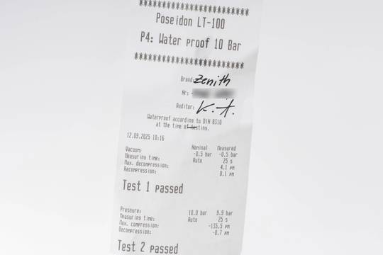 * Wenn die Uhr positiv auf Wasserdichtigkeit getestet wurde, dann gilt diese Eigenschaft zum Zeitpunkt der Messung. Wasserdichtigkeit ist nach DIN 8310 keine bleibende Eigenschaft. Sie sollte jährlich und vor besonderen Belastungen überprüft werden, da die eingebauten Dichtelemente in ihrer Funktion und im täglichen Gebrauch nachlassen. Einflüsse wie starke Temperaturschwankungen, Chlor, Seife oder Salzwasser wirken sich negativ auf die Wasserdichtigkeit aus.