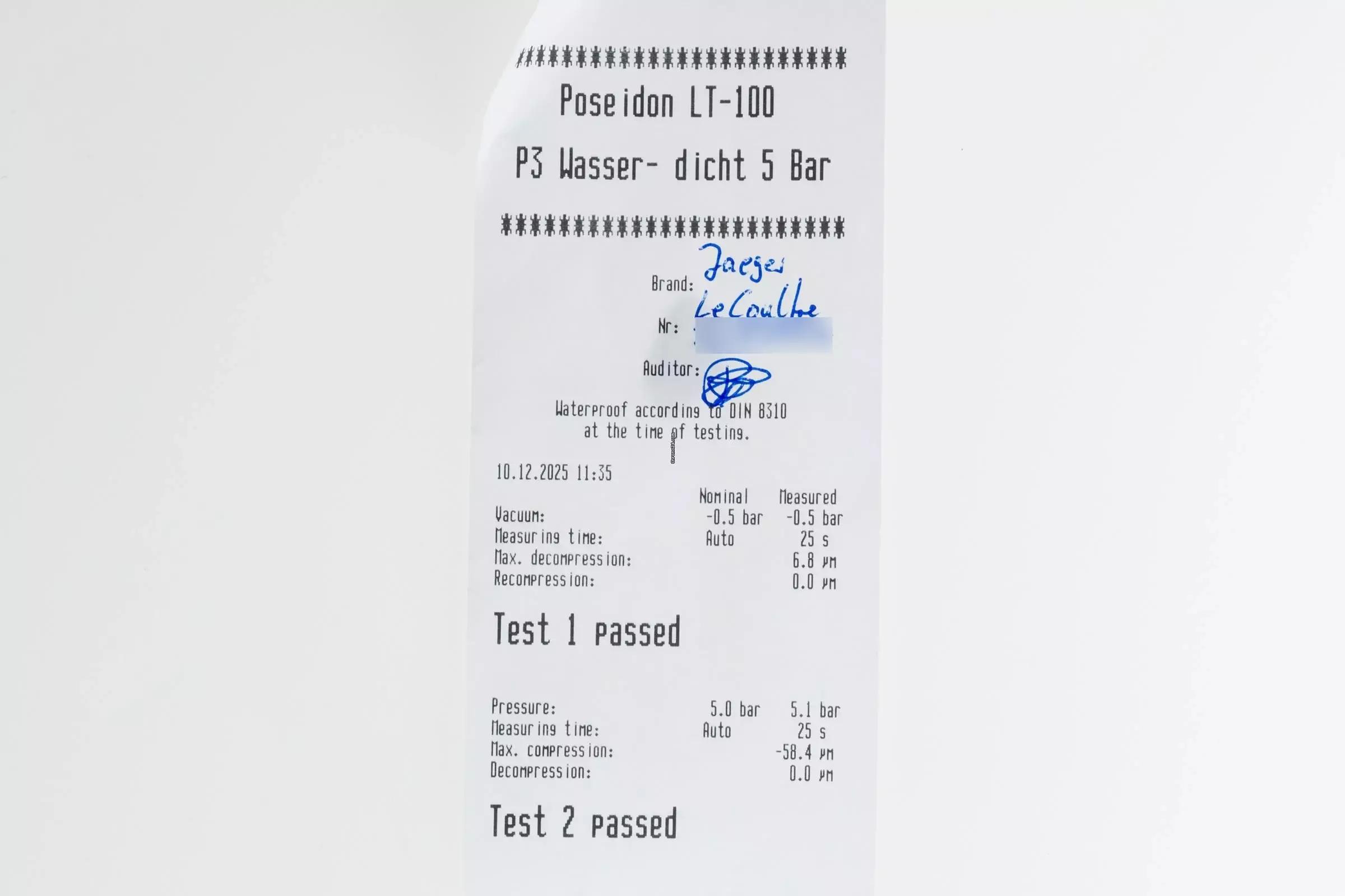 * Wenn die Uhr positiv auf Wasserdichtigkeit getestet wurde, dann gilt diese Eigenschaft zum Zeitpunkt der Messung. Wasserdichtigkeit ist nach DIN 8310 keine bleibende Eigenschaft. Sie sollte jährlich und vor besonderen Belastungen überprüft werden, da die eingebauten Dichtelemente in ihrer Funktion und im täglichen Gebrauch nachlassen. Einflüsse wie starke Temperaturschwankungen, Chlor, Seife oder Salzwasser wirken sich negativ auf die Wasserdichtigkeit aus.