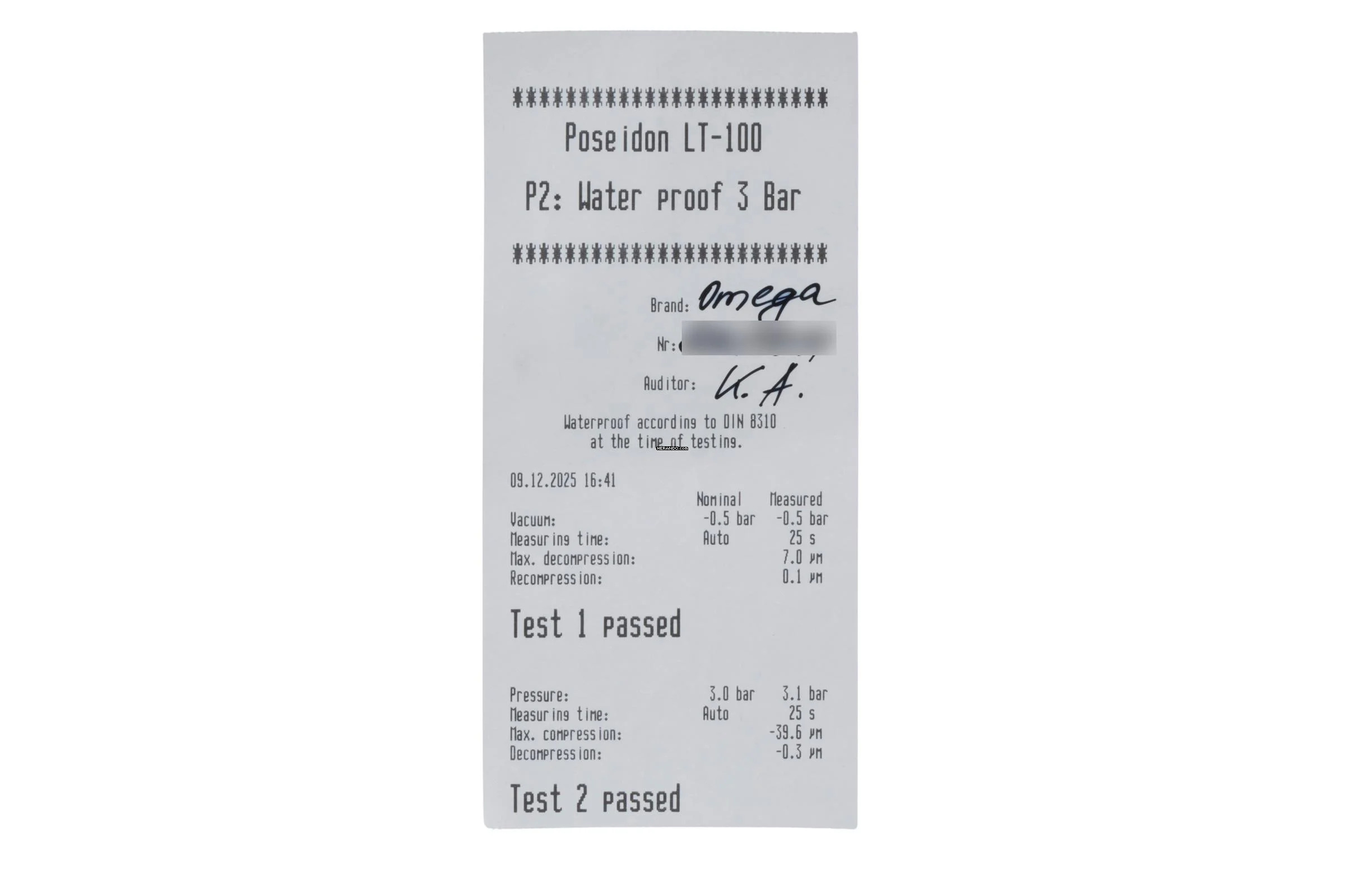 * Wenn die Uhr positiv auf Wasserdichtigkeit getestet wurde, dann gilt diese Eigenschaft zum Zeitpunkt der Messung. Wasserdichtigkeit ist nach DIN 8310 keine bleibende Eigenschaft. Sie sollte jährlich und vor besonderen Belastungen überprüft werden, da die eingebauten Dichtelemente in ihrer Funktion und im täglichen Gebrauch nachlassen. Einflüsse wie starke Temperaturschwankungen, Chlor, Seife oder Salzwasser wirken sich negativ auf die Wasserdichtigkeit aus.