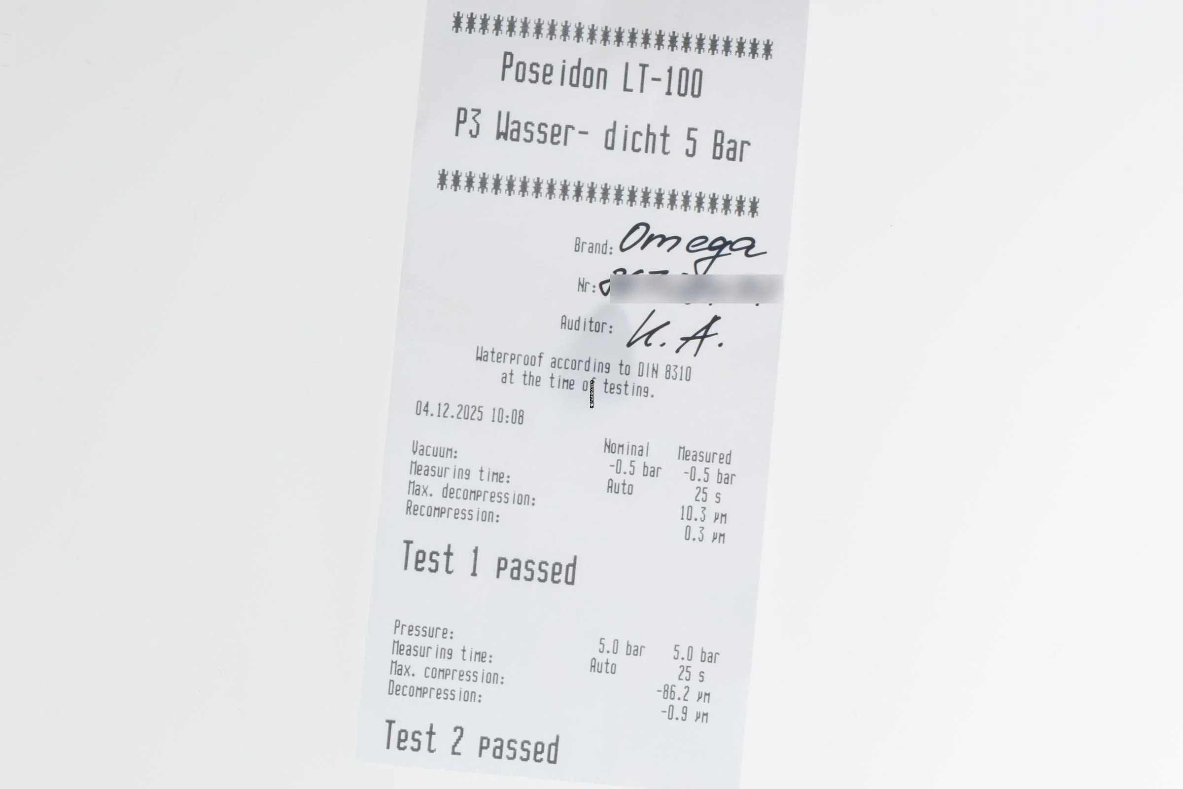 * Wenn die Uhr positiv auf Wasserdichtigkeit getestet wurde, dann gilt diese Eigenschaft zum Zeitpunkt der Messung. Wasserdichtigkeit ist nach DIN 8310 keine bleibende Eigenschaft. Sie sollte jährlich und vor besonderen Belastungen überprüft werden, da die eingebauten Dichtelemente in ihrer Funktion und im täglichen Gebrauch nachlassen. Einflüsse wie starke Temperaturschwankungen, Chlor, Seife oder Salzwasser wirken sich negativ auf die Wasserdichtigkeit aus.