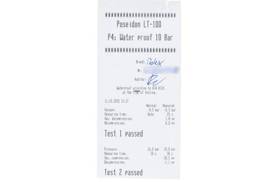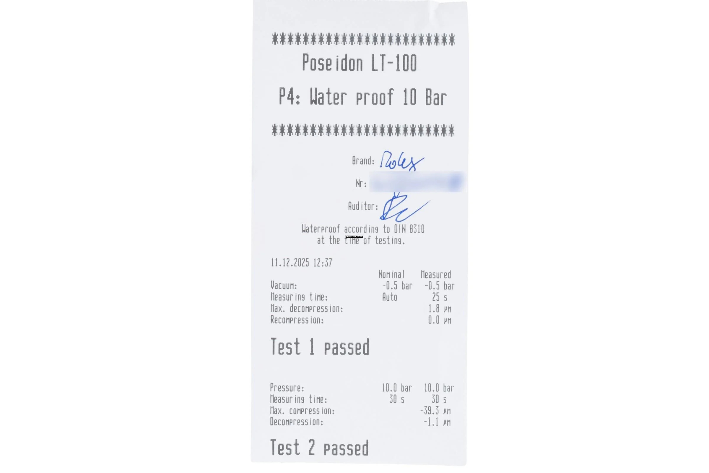 * Wenn die Uhr positiv auf Wasserdichtigkeit getestet wurde, dann gilt diese Eigenschaft zum Zeitpunkt der Messung. Wasserdichtigkeit ist nach DIN 8310 keine bleibende Eigenschaft. Sie sollte jährlich und vor besonderen Belastungen überprüft werden, da die eingebauten Dichtelemente in ihrer Funktion und im täglichen Gebrauch nachlassen. Einflüsse wie starke Temperaturschwankungen, Chlor, Seife oder Salzwasser wirken sich negativ auf die Wasserdichtigkeit aus.