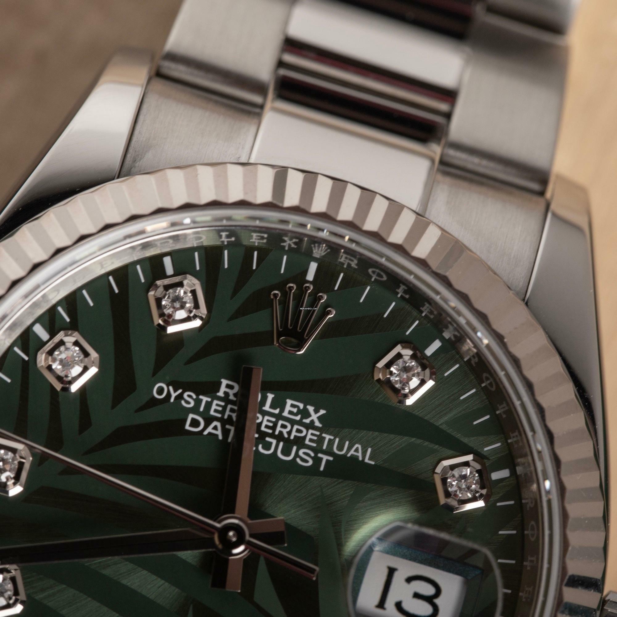 At its core, the watch houses the revolutionary Rolex Calibre 3235 automatic movement. This new-generation calibre features the patented Chronergy escapement and an impressive 70-hour power reserve. Every Rolex Datejust 36 is rigorously tested and certified as a Superlative Chronometer, guaranteeing exceptional accuracy of −2/+2 seconds per day. This combination of innovative engineering and dazzling aesthetic elements makes this particular Datejust 36 a truly modern masterpiece.