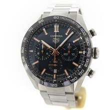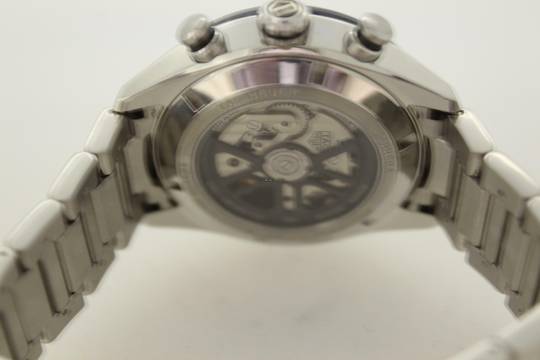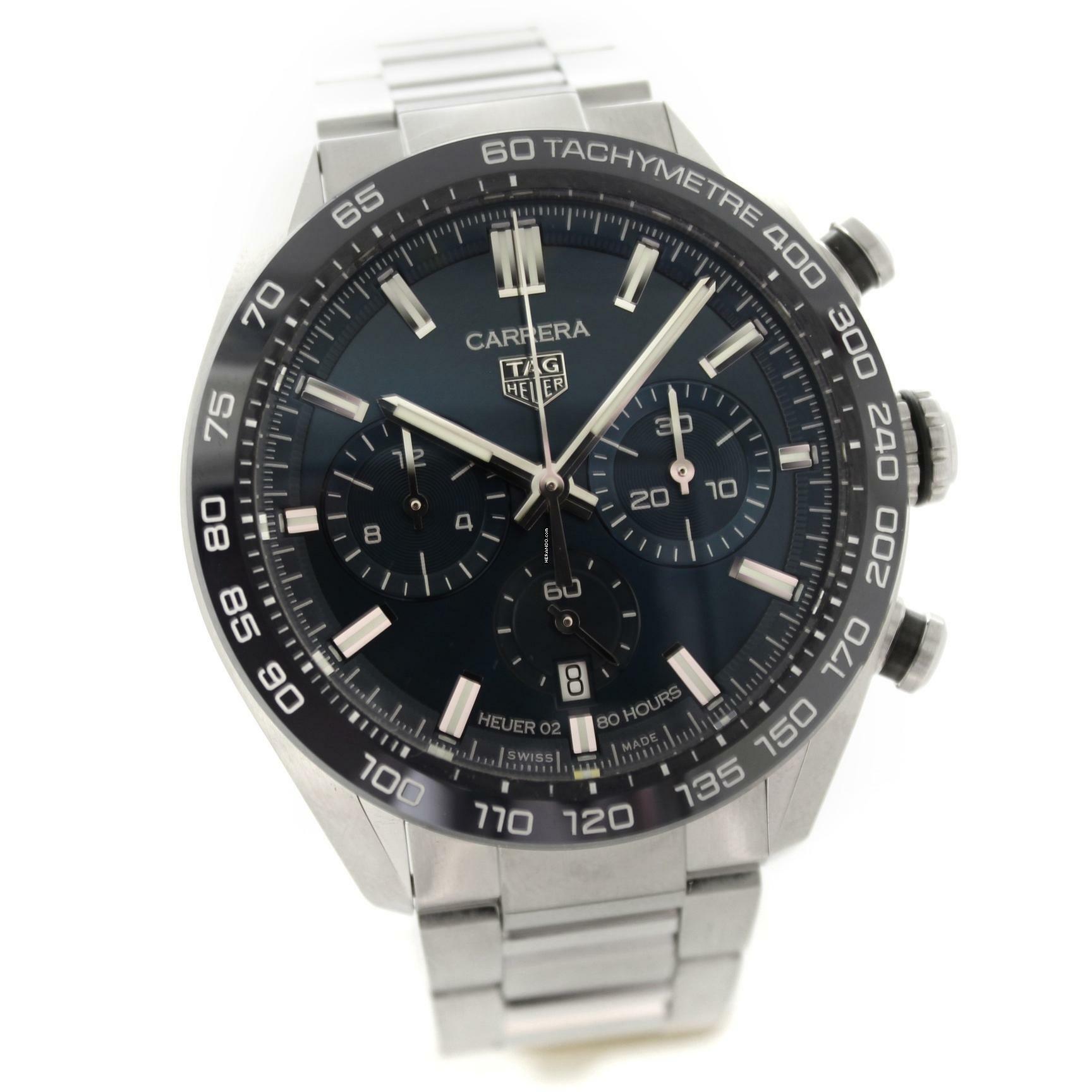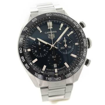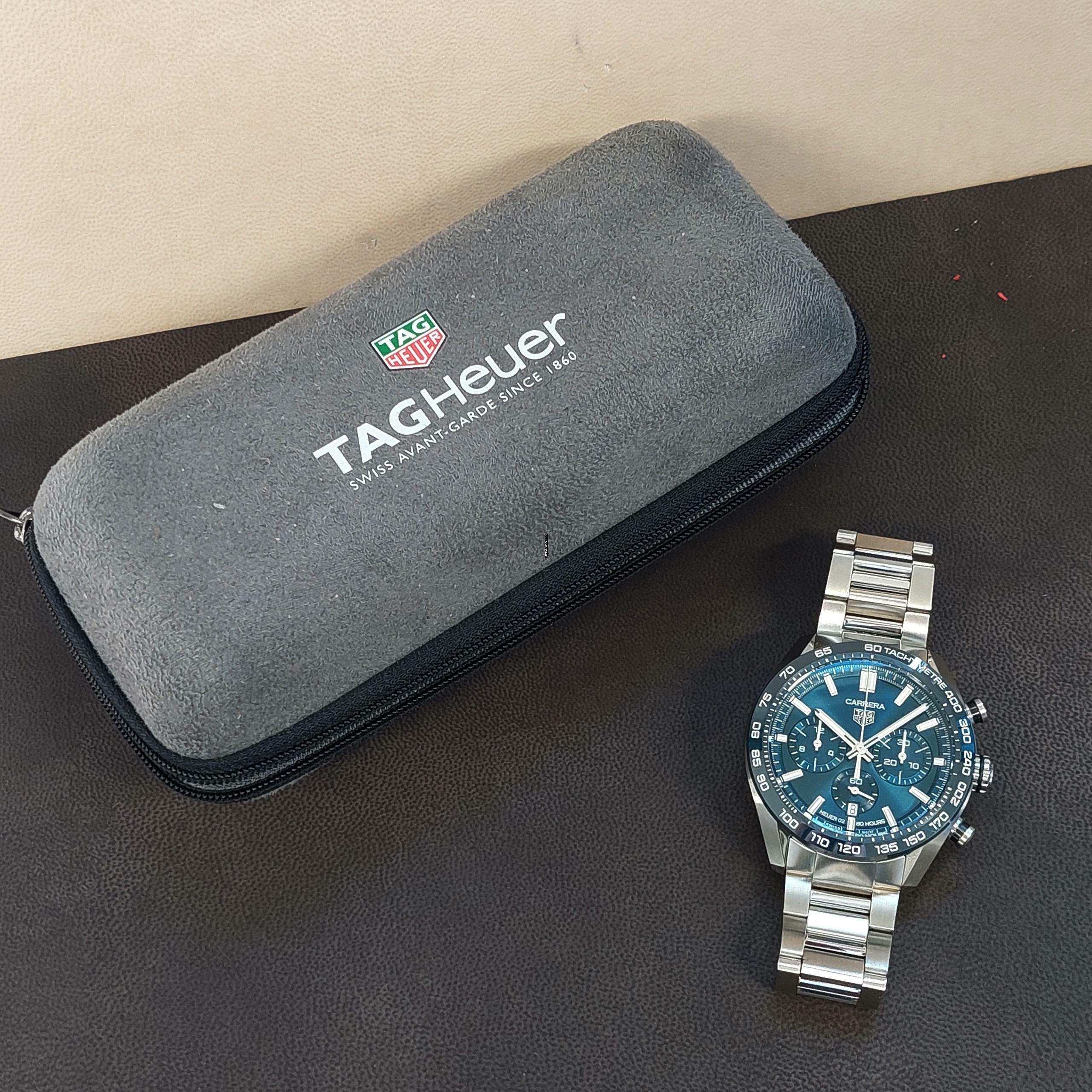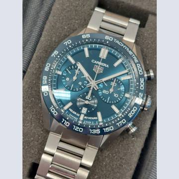 This Tag Heuer watch features a 44mm steel case. The watch features a blue dial. The watch is equipped with a steel strap.