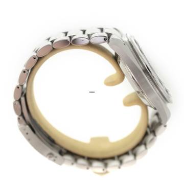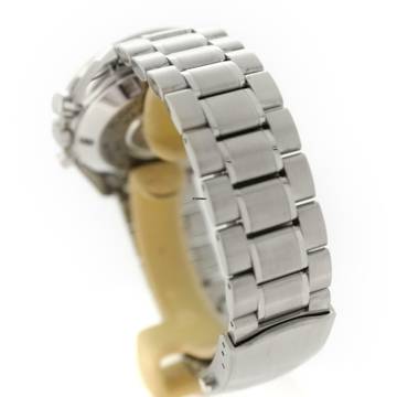 This Omega watch features a 42 mm steel case. The watch features a black dial. The watch is equipped with a steel strap.