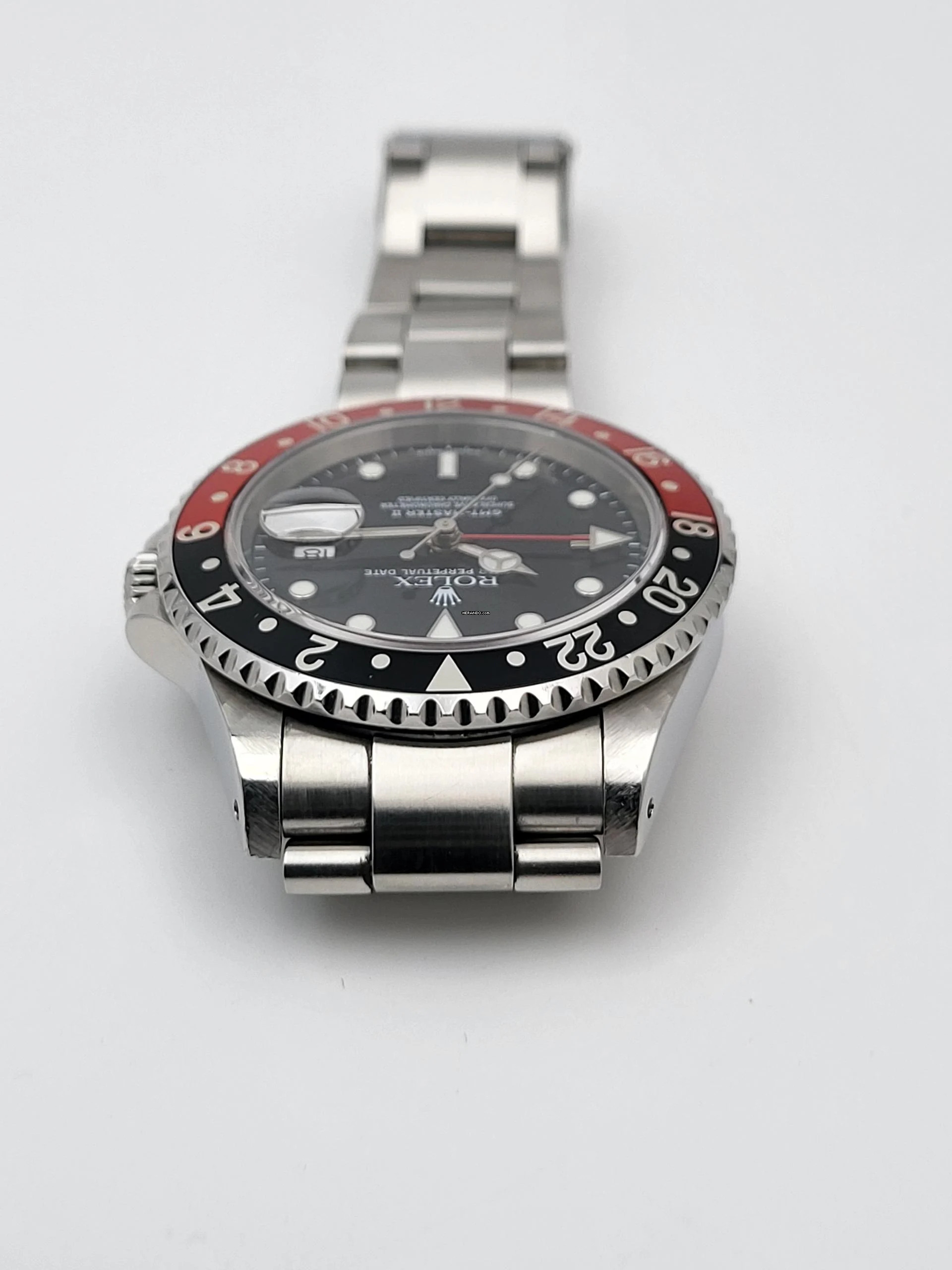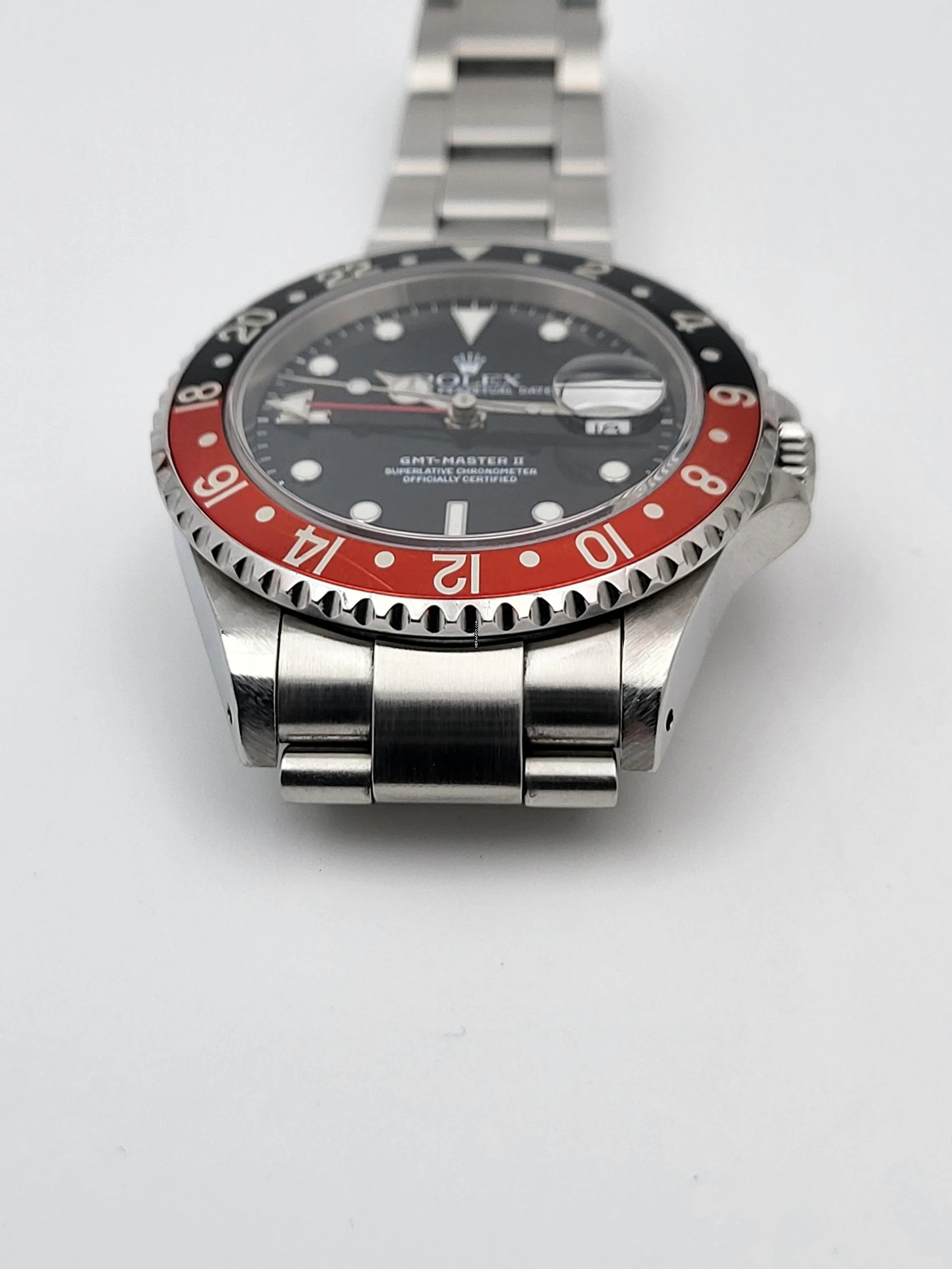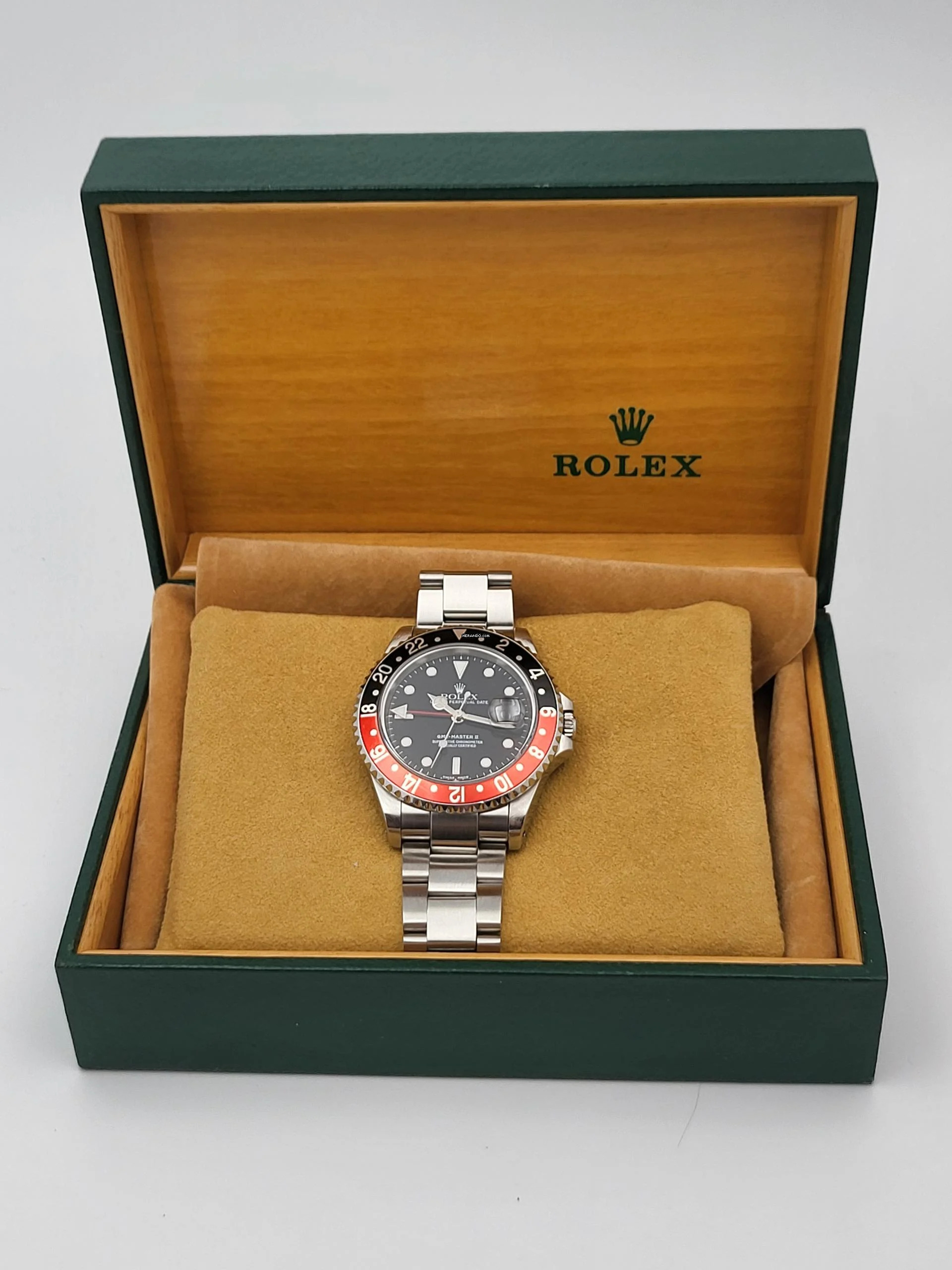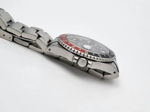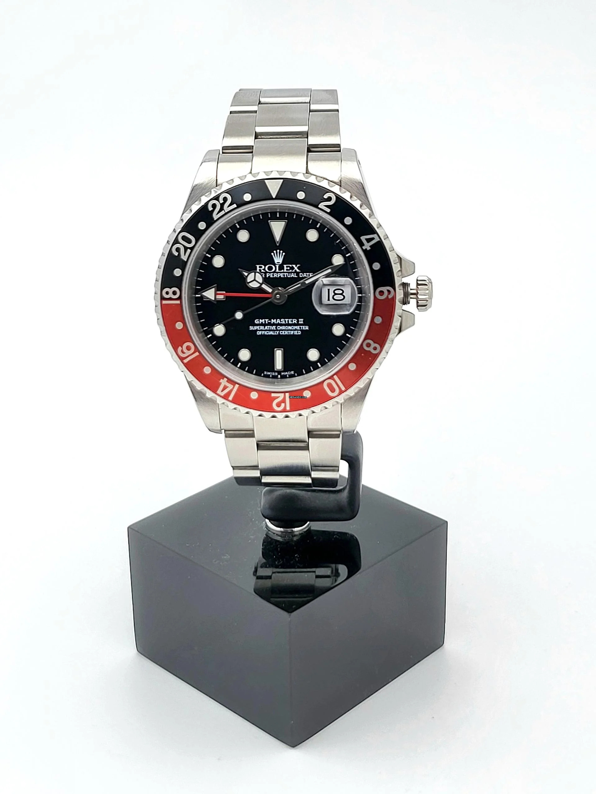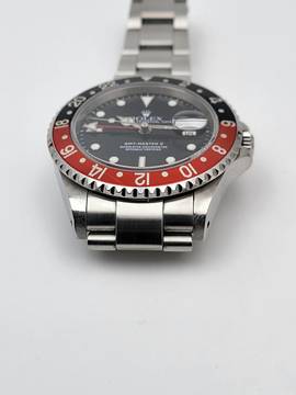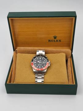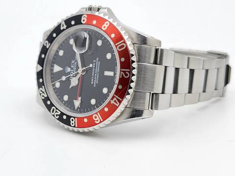 Zum Verkauf steht diese schöne Rolex GMT-Master II Coke. in Stahl mit rot schwarzer Lünette und schwarzem Zifferblatt an einem Oysterband.Alternativ haben wir auch eine neuwertigen Pepsi Lünette.