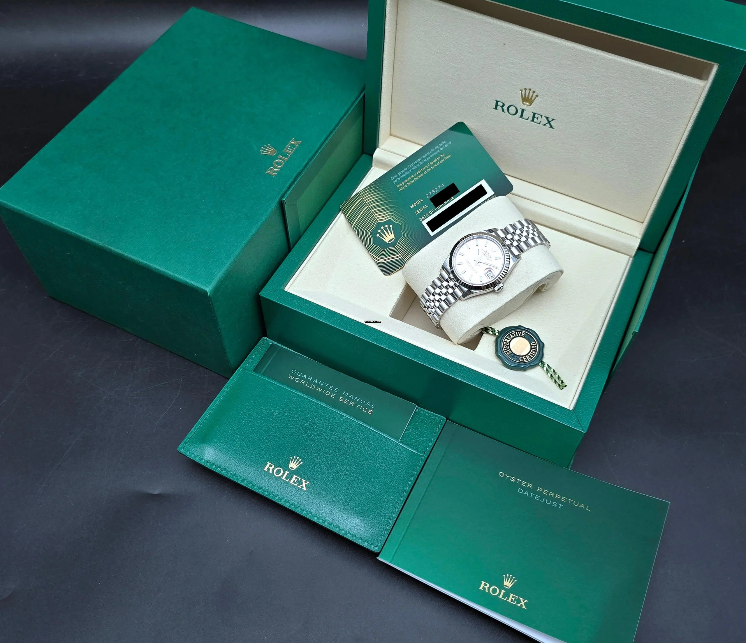 The watch will be delivered with the original box, papers, tag, and 5 years international factory warranty. Warranty card date 11-2025.