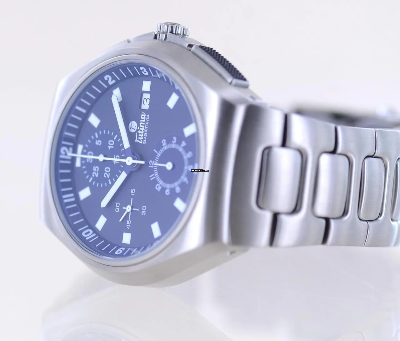 Coole und sportliche Tutima Seven Coastline mit Reintitangehäuse und -band. Diese Uhr in matter Optik überzeugt durch eine sportliche Größe sowie beste Ablesbarkeit und ein cooles maritimes Zifferblatt welches ihr super steht. Typisch M2 ist alles klar und äußerst reduziert und klar designed.Die Tutima hat ein Titangehäuse, welches vollständig mattiert / gebürstet ist. Das blaue Blatt mit den weißen Indizes passt perfekt. Die Ablesbarkeit dieser Uhr ist sehr gut, da die Zeiger und Indizes einen super Kontrast bilden. Die beiden Zeiger für Stunde und Minute sind großzügig mich Leuchtmasse belegt.