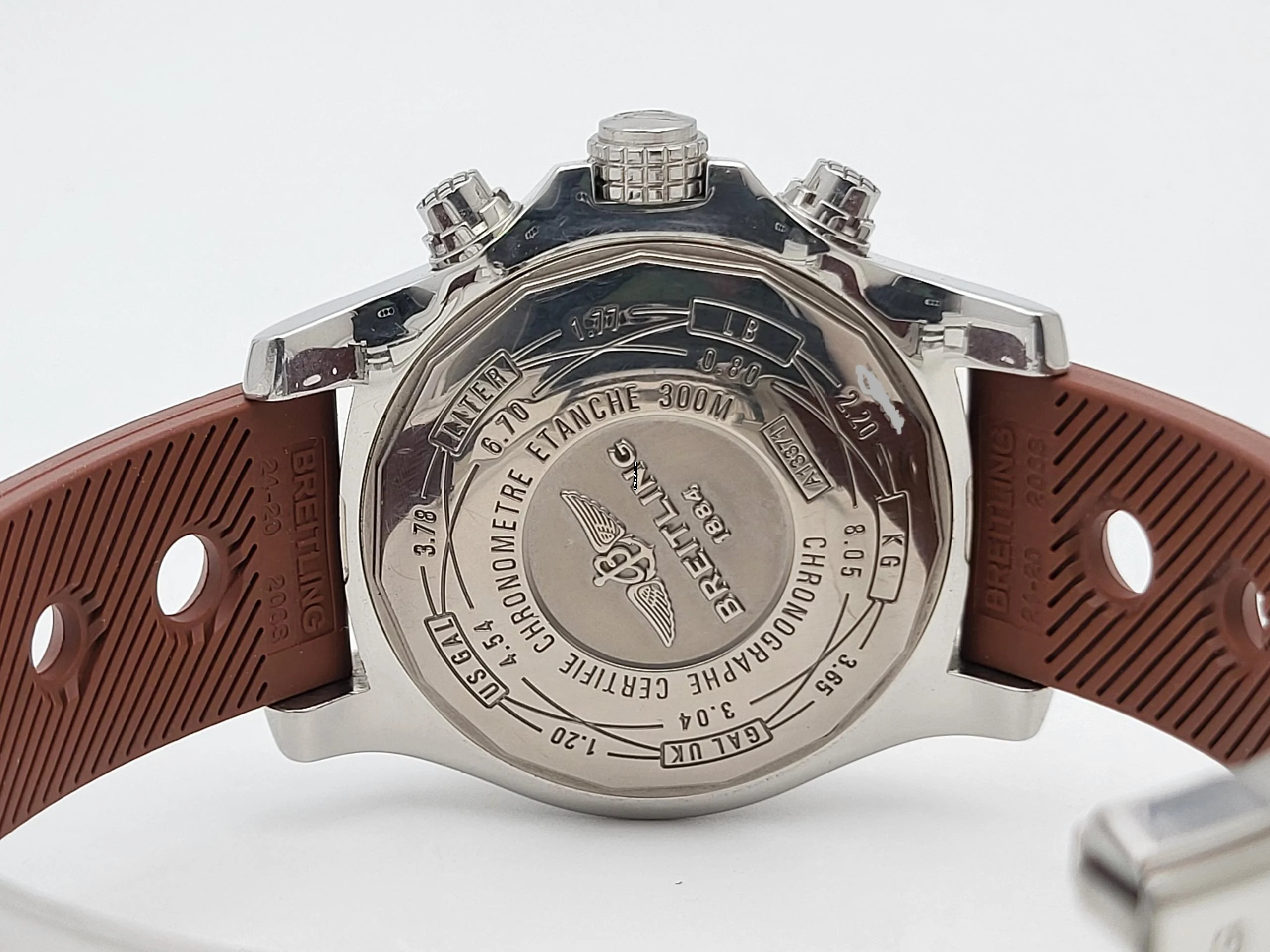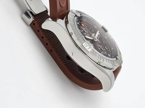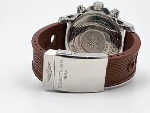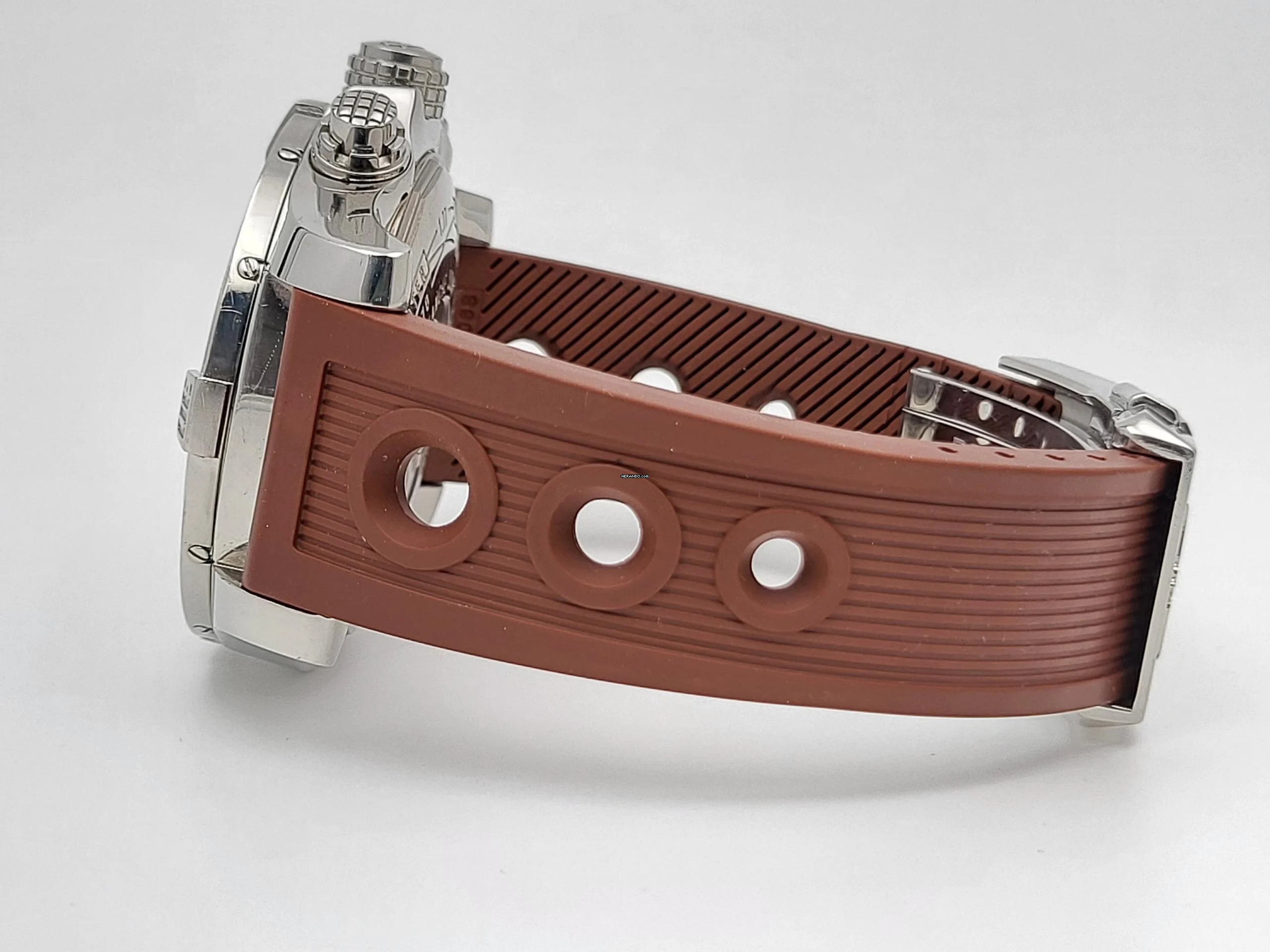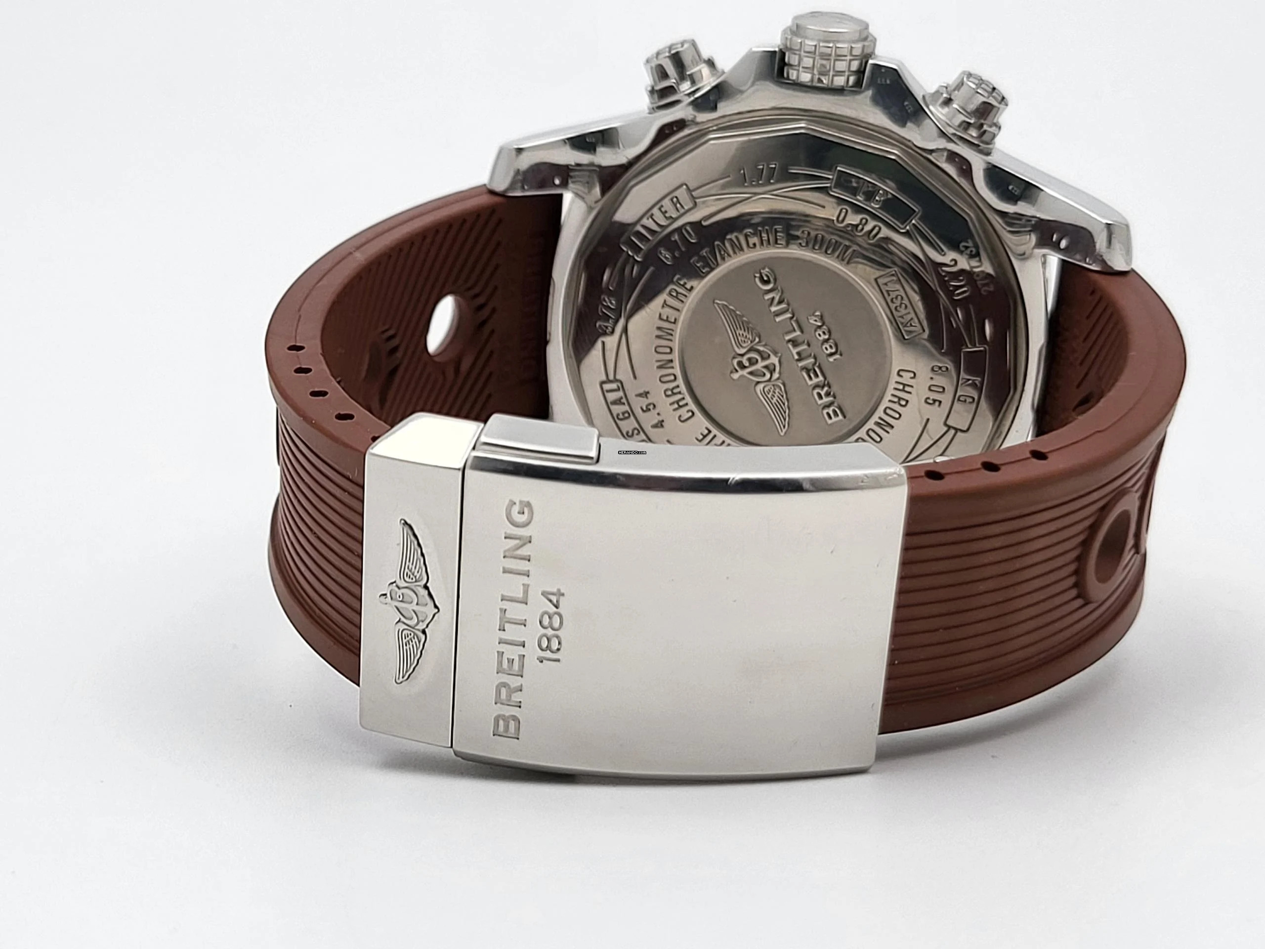For sale is this nice Breitling Superavenger II 48 mm. Steel with a black dial and on a Rubber-Strap with folded clasp ( we can change the strap von brown to Black if you want ).