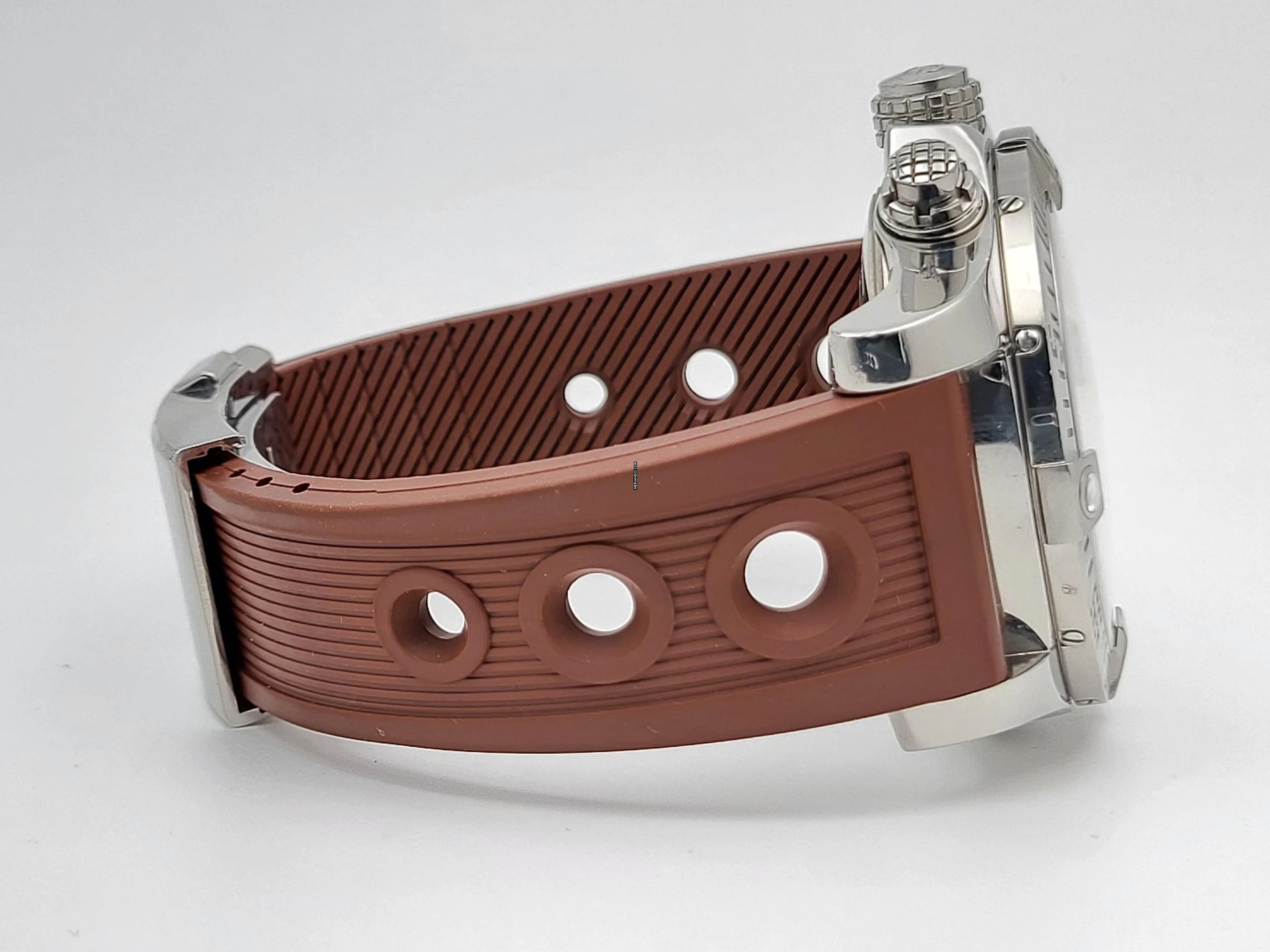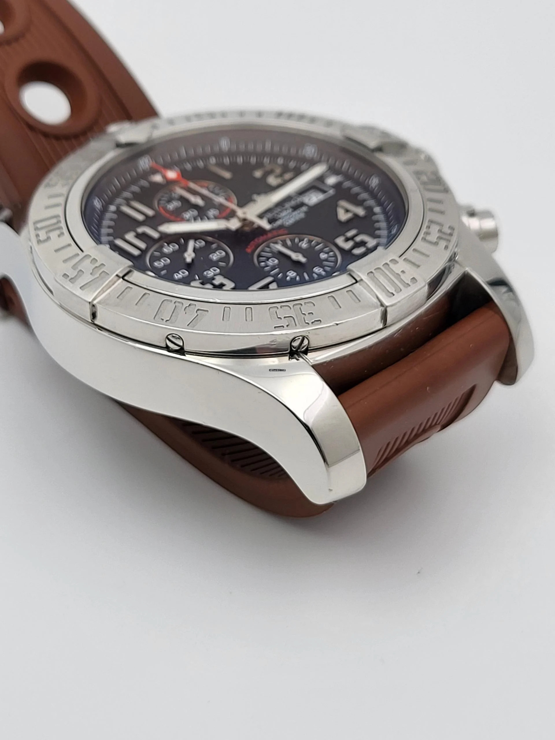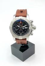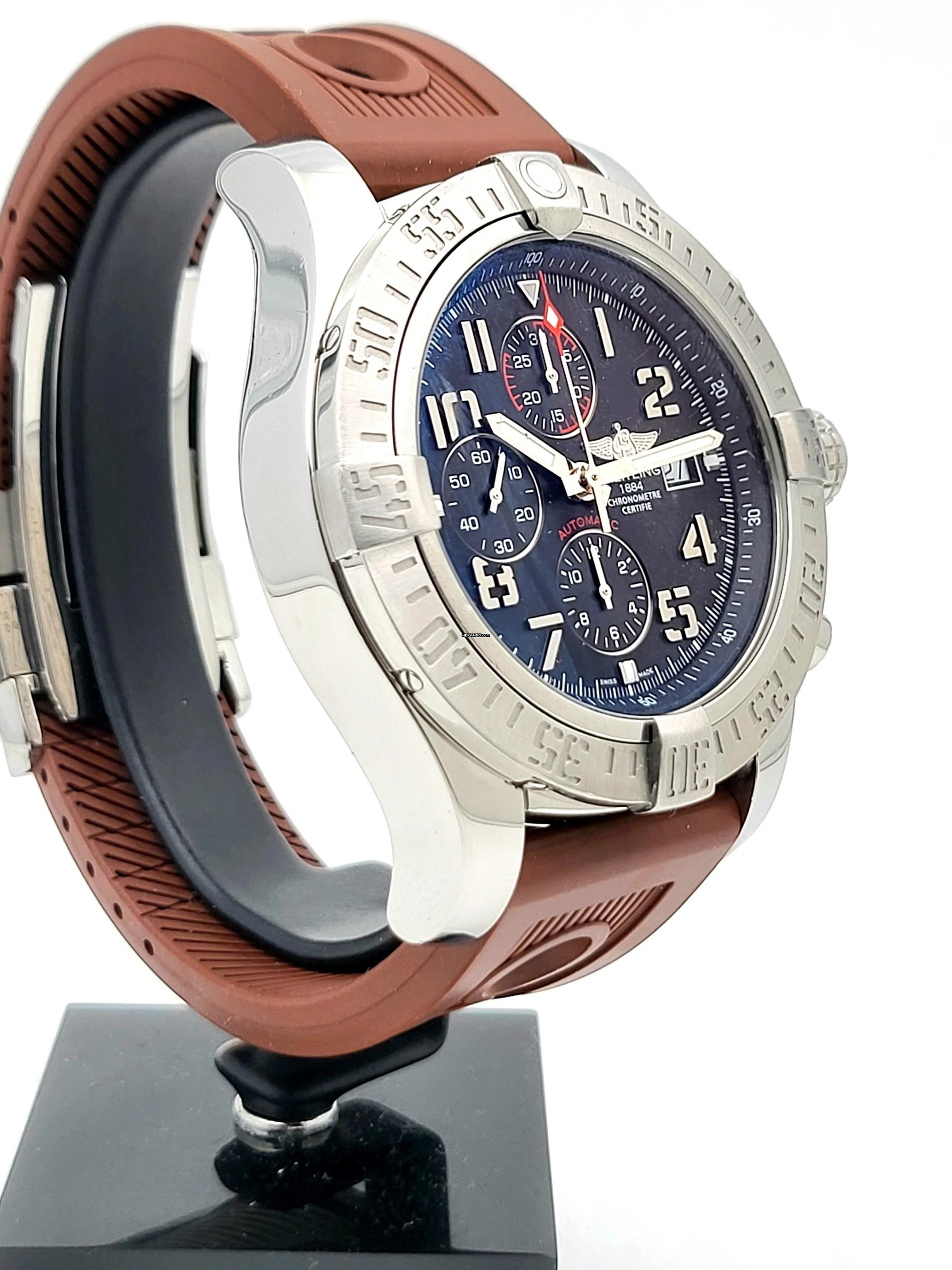 For sale is this nice Breitling Superavenger II 48 mm. Steel with a black dial and on a Rubber-Strap with folded clasp ( we can change the strap von brown to Black if you want ).