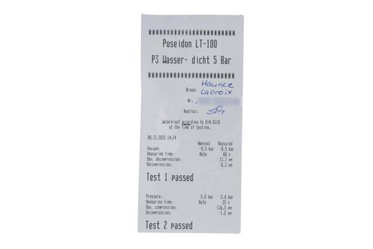 * Wenn die Uhr positiv auf Wasserdichtigkeit getestet wurde, dann gilt diese Eigenschaft zum Zeitpunkt der Messung. Wasserdichtigkeit ist nach DIN 8310 keine bleibende Eigenschaft. Sie sollte jährlich und vor besonderen Belastungen überprüft werden, da die eingebauten Dichtelemente in ihrer Funktion und im täglichen Gebrauch nachlassen. Einflüsse wie starke Temperaturschwankungen, Chlor, Seife oder Salzwasser wirken sich negativ auf die Wasserdichtigkeit aus.