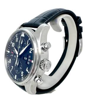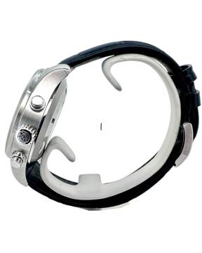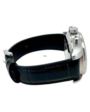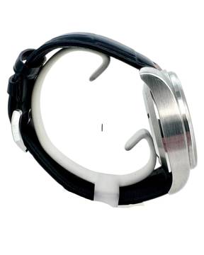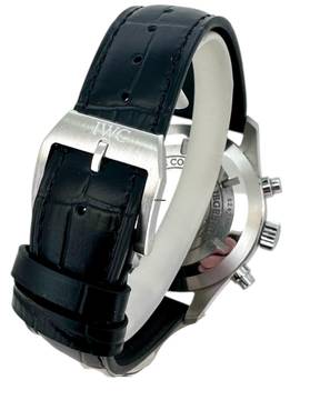 Das robuste Edelstahlgehäuse unterstreicht den professionellen Charakter der Uhr, während das hochwertige schwarze IWC Lederband für hohen Tragekomfort sorgt. Abgerundet wird das Gesamtbild durch die originale IWC Dornschließe, die Sicherheit und Authentizität garantiert.