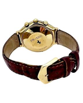 Der Ferrari F40 Cartier Chronograph Referenz F6366402 ist ein außergewöhnlicher Luxuszeitmesser, der sportliche Performance mit exklusiver Eleganz vereint. Dieses seltene Modell entstand aus der prestigeträchtigen Zusammenarbeit zwischen Cartier und Ferrari und richtet sich an anspruchsvolle Sammler. Das markante 42-mm-Gehäuse aus 18k Gelbgold verleiht der Uhr eine kraftvolle Präsenz, während die passende Goldschließe den hochwertigen Charakter konsequent fortführt.