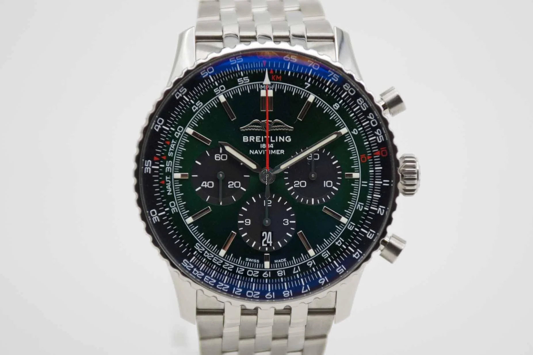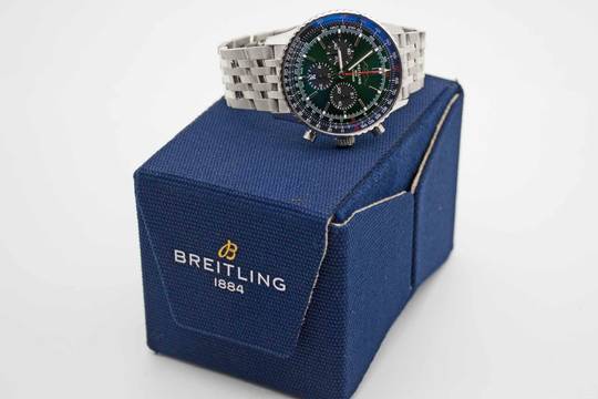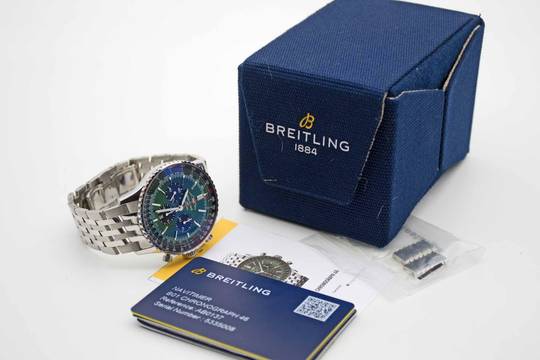Navitimer B01 Chronograph 46 Bentley Green AB0137241L1A1, 46 mm stainless steel case with racing green dial and Breitling steal bracelet in full length. Perfect fullset in Breitling PET box with owners manual and original Breitling warranty card from 2025 (Breitling warranty valid up to 2033). The watch comes in perfect and mint condition like new. Trades are possible.