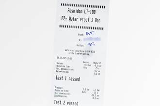 * Wenn die Uhr positiv auf Wasserdichtigkeit getestet wurde, dann gilt diese Eigenschaft zum Zeitpunkt der Messung. Wasserdichtigkeit ist nach DIN 8310 keine bleibende Eigenschaft. Sie sollte jährlich und vor besonderen Belastungen überprüft werden, da die eingebauten Dichtelemente in ihrer Funktion und im täglichen Gebrauch nachlassen. Einflüsse wie starke Temperaturschwankungen, Chlor, Seife oder Salzwasser wirken sich negativ auf die Wasserdichtigkeit aus.