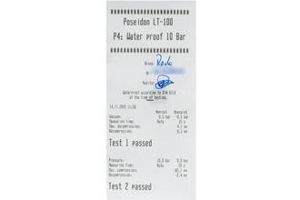 * Wenn die Uhr positiv auf Wasserdichtigkeit getestet wurde, dann gilt diese Eigenschaft zum Zeitpunkt der Messung. Wasserdichtigkeit ist nach DIN 8310 keine bleibende Eigenschaft. Sie sollte jährlich und vor besonderen Belastungen überprüft werden, da die eingebauten Dichtelemente in ihrer Funktion und im täglichen Gebrauch nachlassen. Einflüsse wie starke Temperaturschwankungen, Chlor, Seife oder Salzwasser wirken sich negativ auf die Wasserdichtigkeit aus.