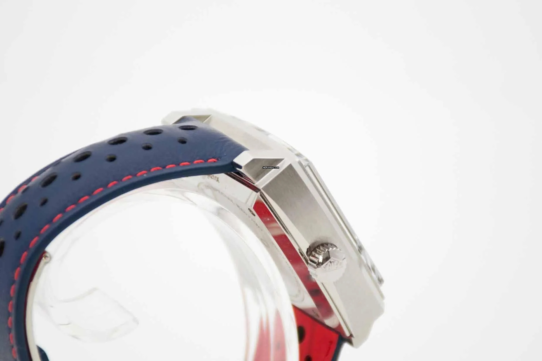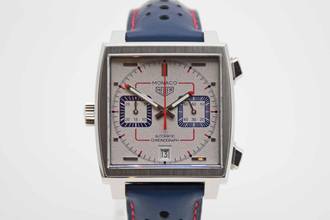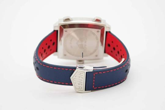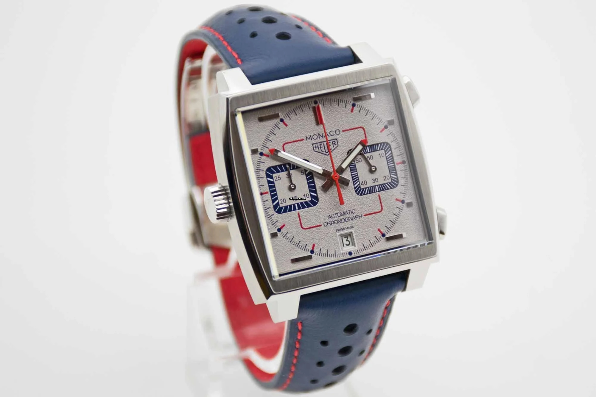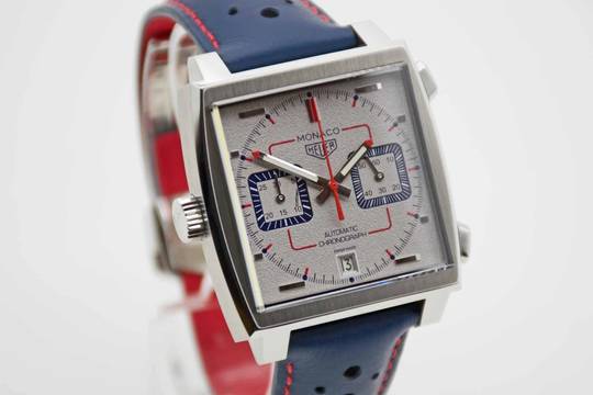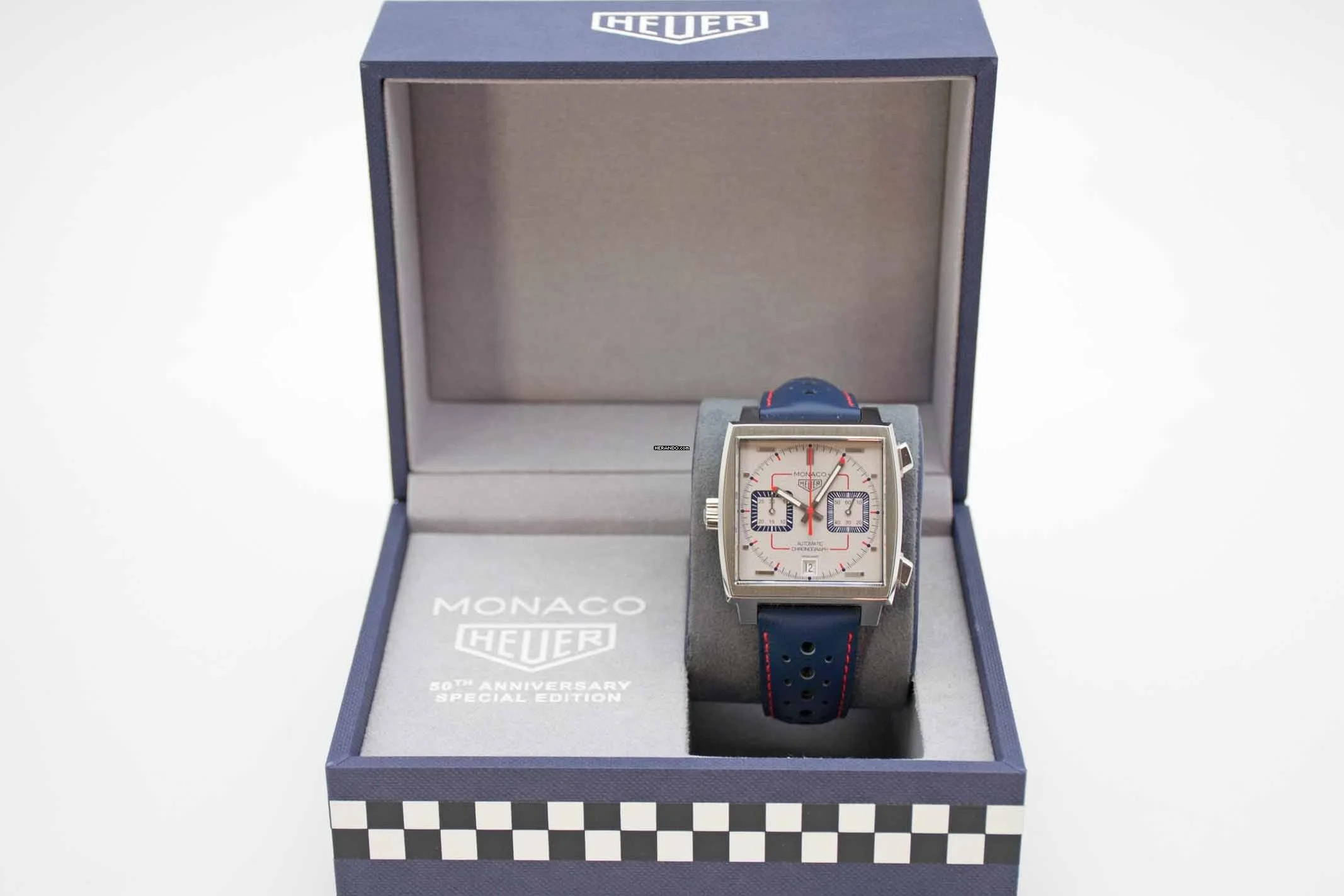 Monaco 50th Anniversary Edition (169 pieces world wide) CAW211X.FC6468, 39 mm case with structured silver Edition dial, blue TH Racing strap and Heuer folding clasp. Collectors fullset in Monaco 50th Anniversary inner and outer box with cover, Anniversary booklet, warranty booklet, hang tag with all matching numbers, TAG Heuer original invoice and TAG Heuer warranty card from 2019. The watch is unworn and comes in new condition. Trades are possible. Please keep in mind that our complete inventory is stored in our bank safe for safety purposes.