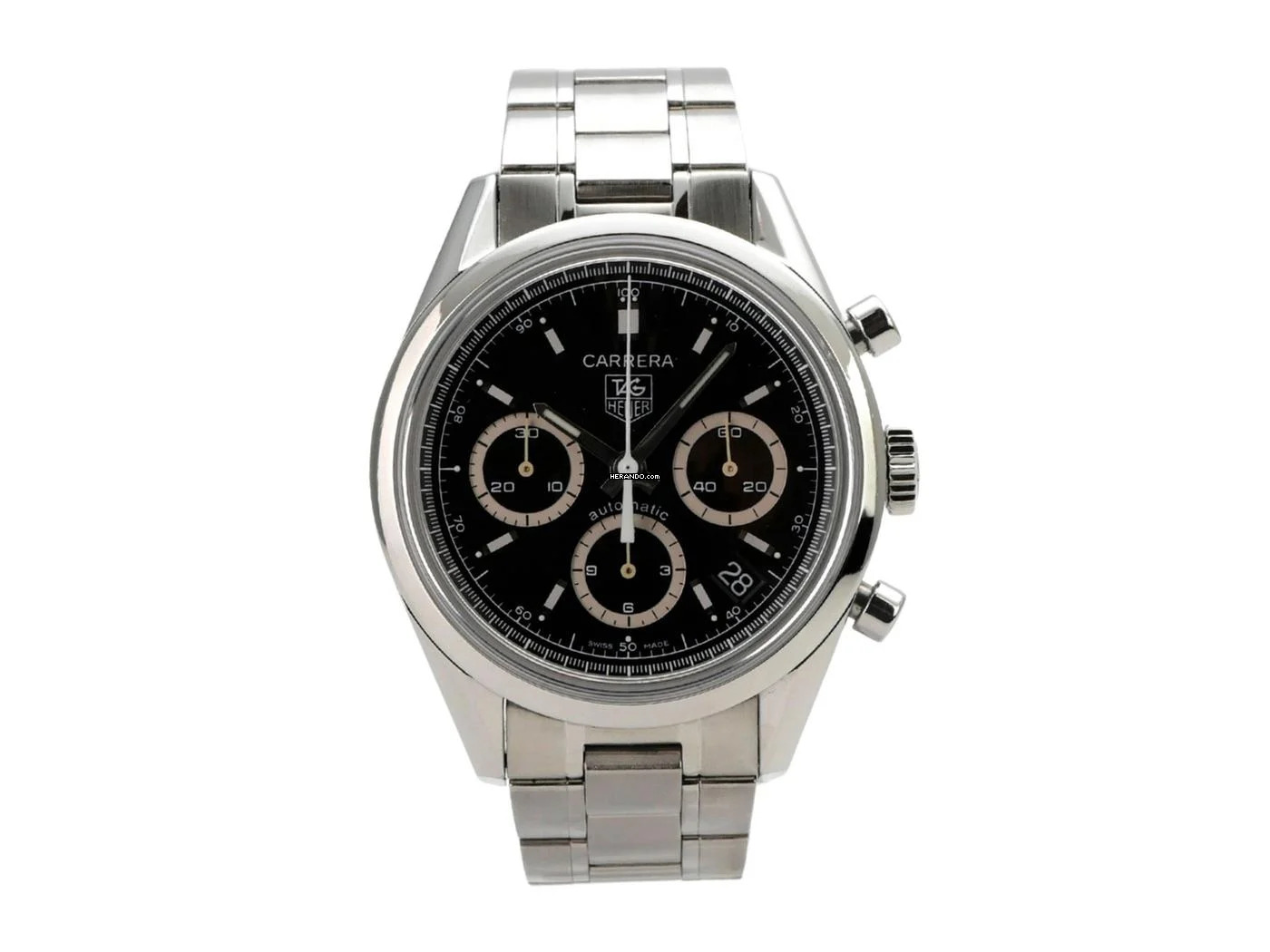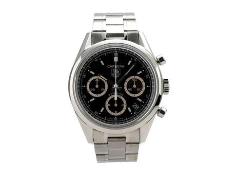 Gehäuse aus Edelstahl poliert, Gehäusedurchmesser 39 mm, Edelstahl Lünette poliert, Edelstahlband mit Faltschließe, schwarzes Zifferblatt mit aufgesetzten Leuchtindizes und Leuchtzeigern, Automatik, Kaliber Tag Heuer 17, Datumsanzeige, Chronograph, Saphirglas, Edelstahlboden graviert, wasserdicht bis zu 10 bar.