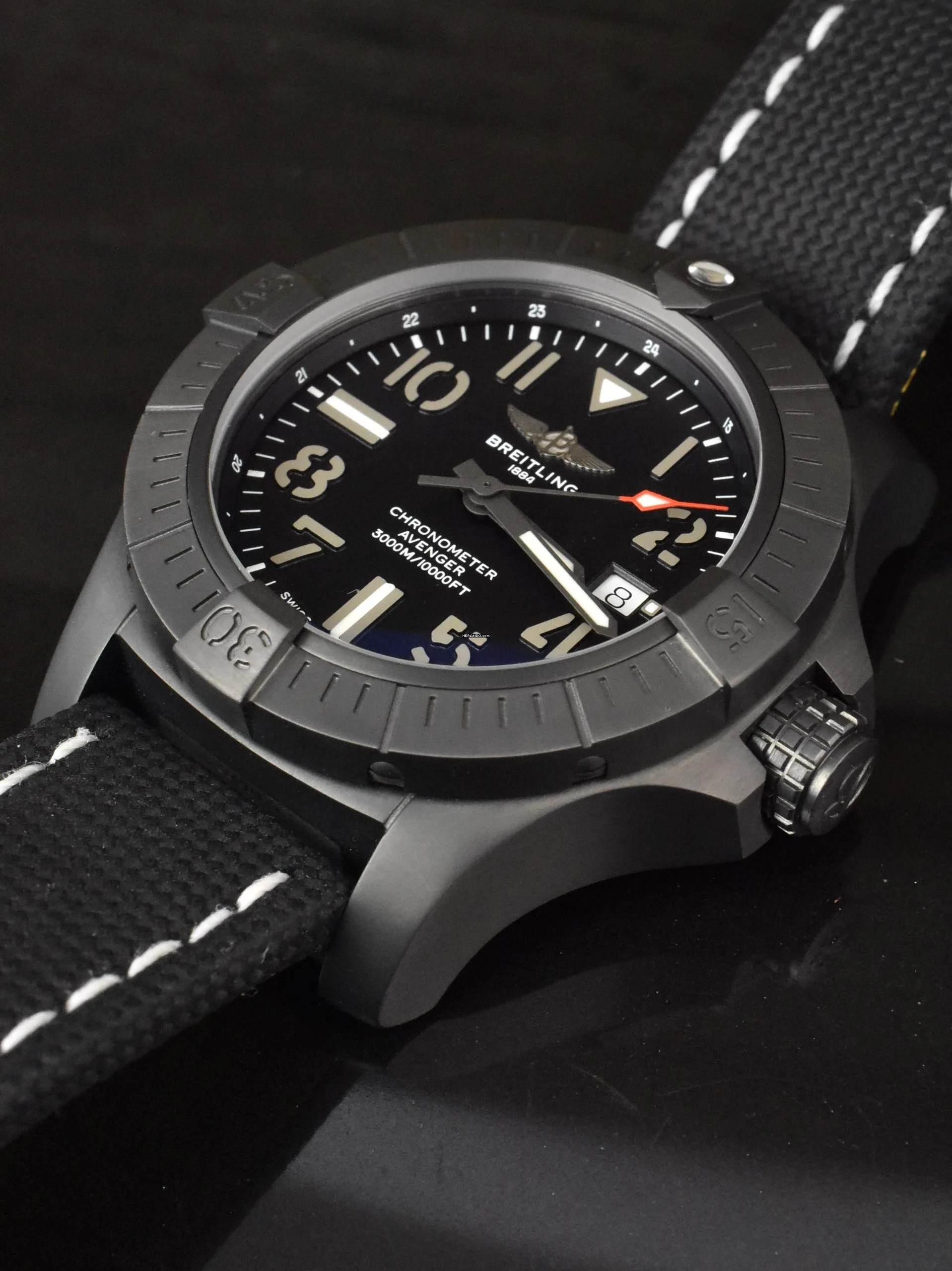 An alle Freunde des guten Geschmacks, angeboten wird eine sehr schöne Breitling Avenger 45 Seawolf Night Mission Black Military Reverenz V17319101B1X2 aus DLC beschichteten Titan am schwarzen Textil Armband aus ca. dem Jahr 2024 mit Box & Papieren!