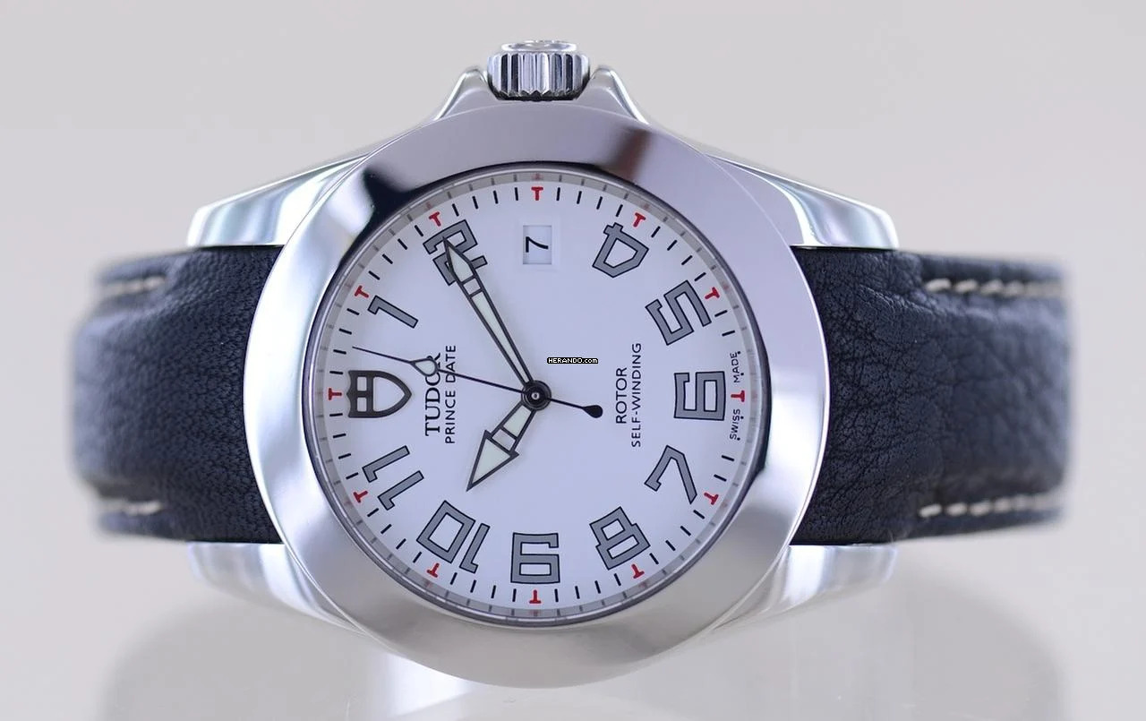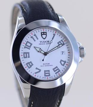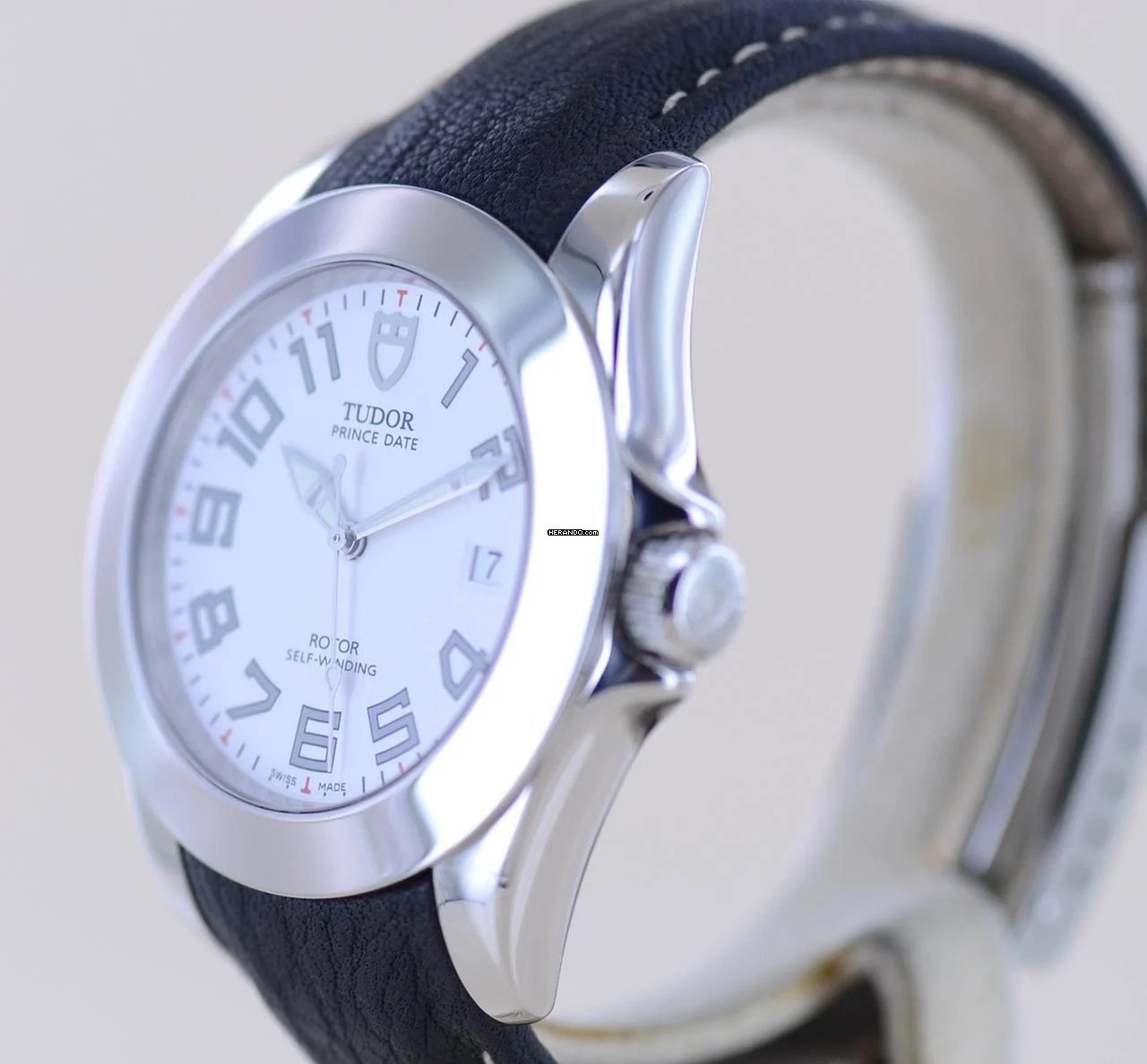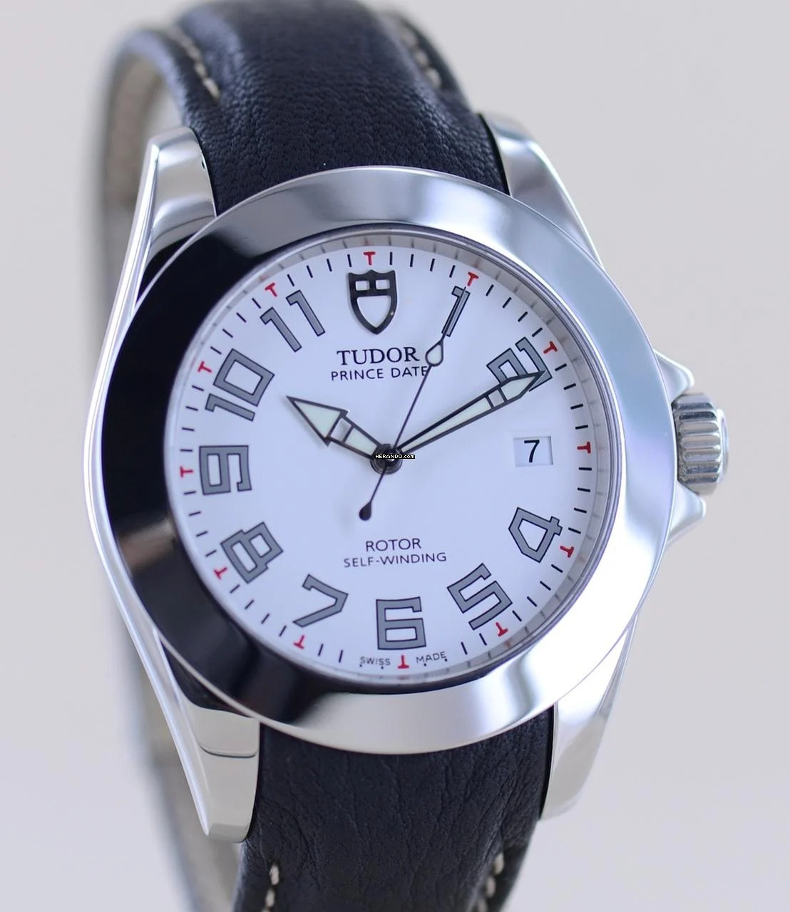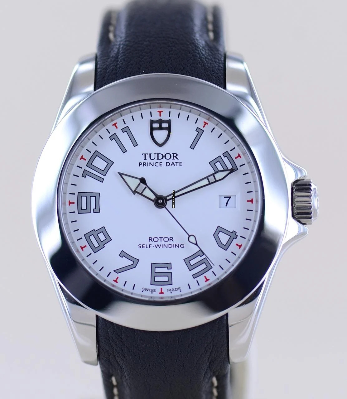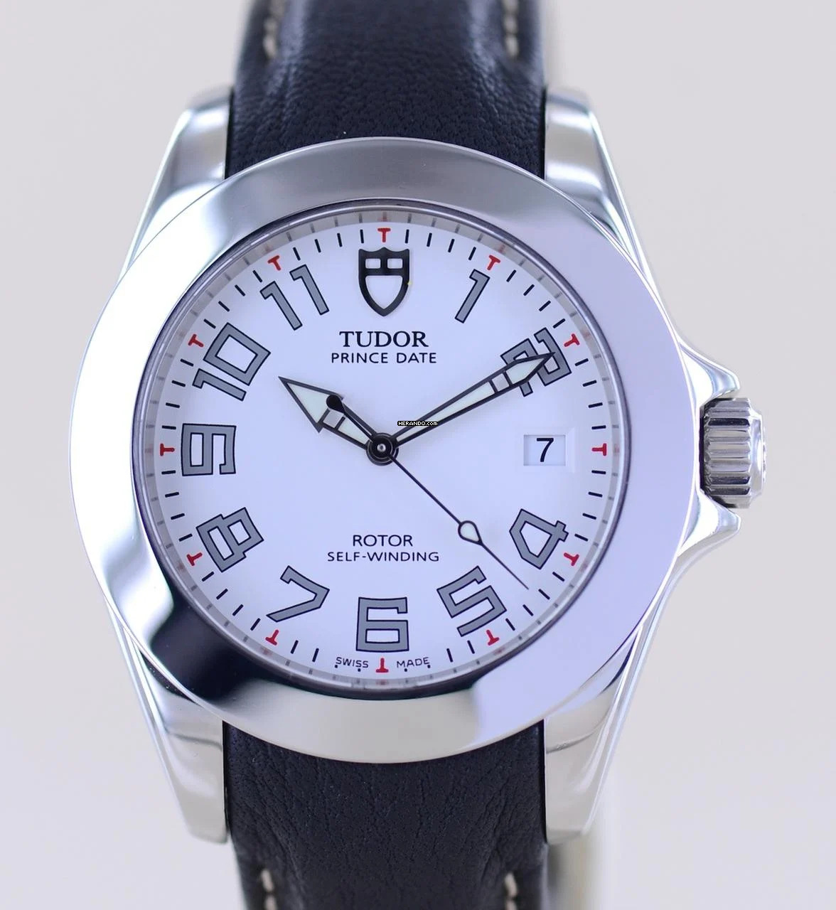 Schöne seltene Tudor Prince Date mit weißem Blatt und polierter Stahllünette. Diese Uhr überzeugt durch beste Verarbeitung und hohen Tragekomfort. Das eigenständige Design ist markant und sportlich. Das Blatt übersichtlich und gut ablesbar. Diese Ausführung der Uhr ist sehr selten zu finden. Das weiße Blatt mit den grauen arabischen Ziffern und der polierter Lünette sowie den polierten Hörnern gibt es nicht oft. Das Original Tudorband mit Formanstößen und Tudor-Kastenschließe passt optisch perfekt und ist ungetragen.Einfach ein wunderbarer funktionaler Klassiker. Die Tudor macht auch im Alltag eine super Figur und hält bei entsprechender Pflege ein Leben lang.