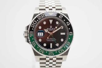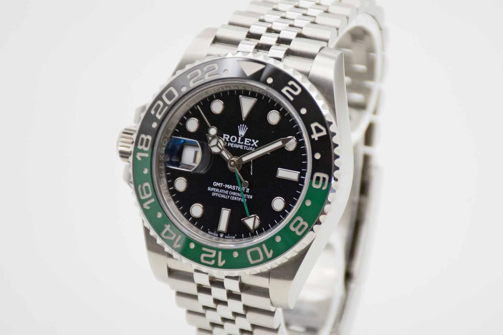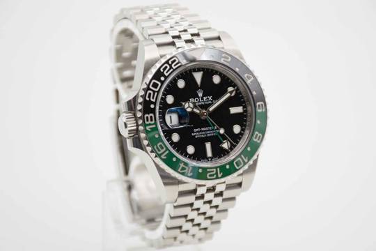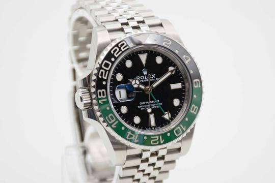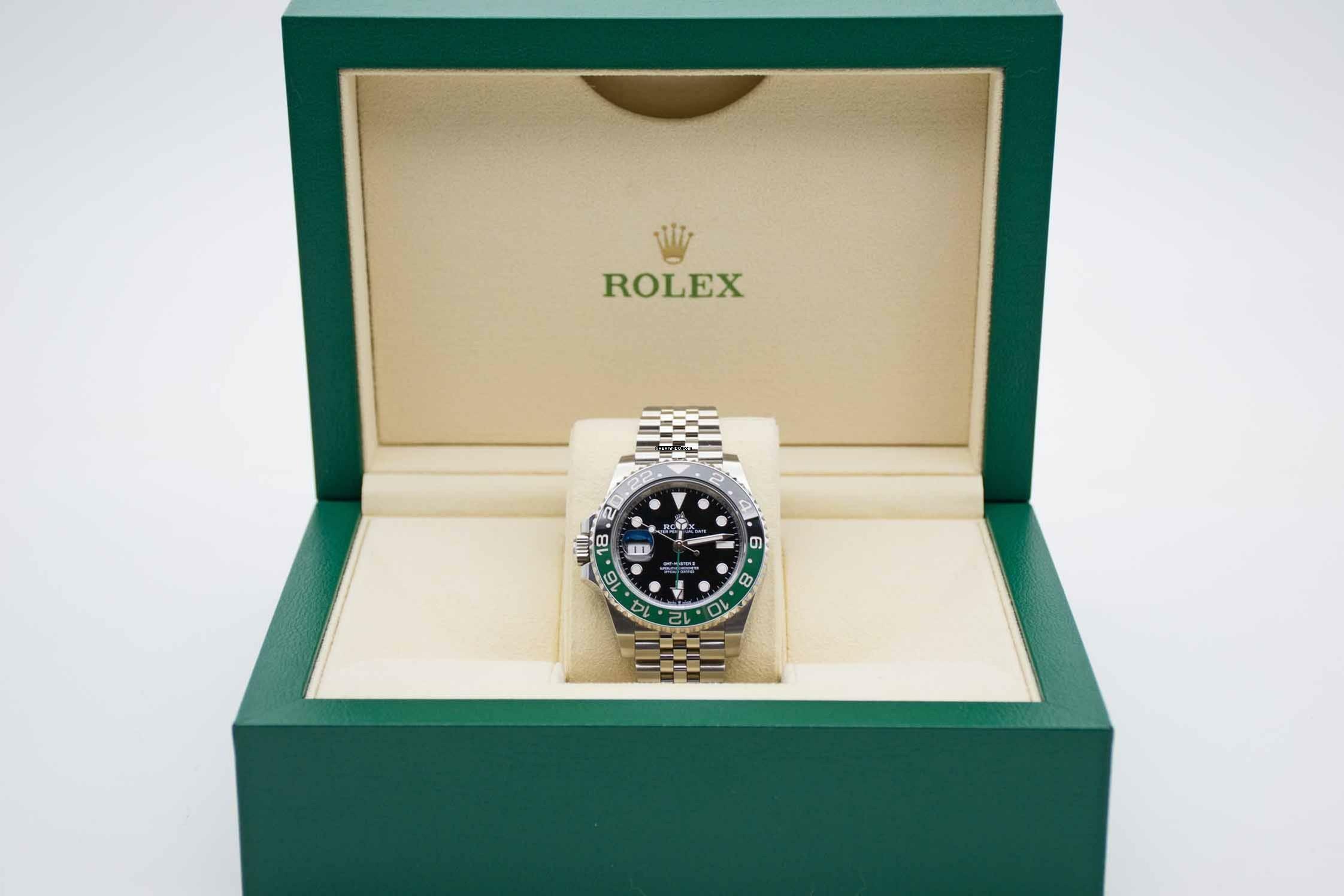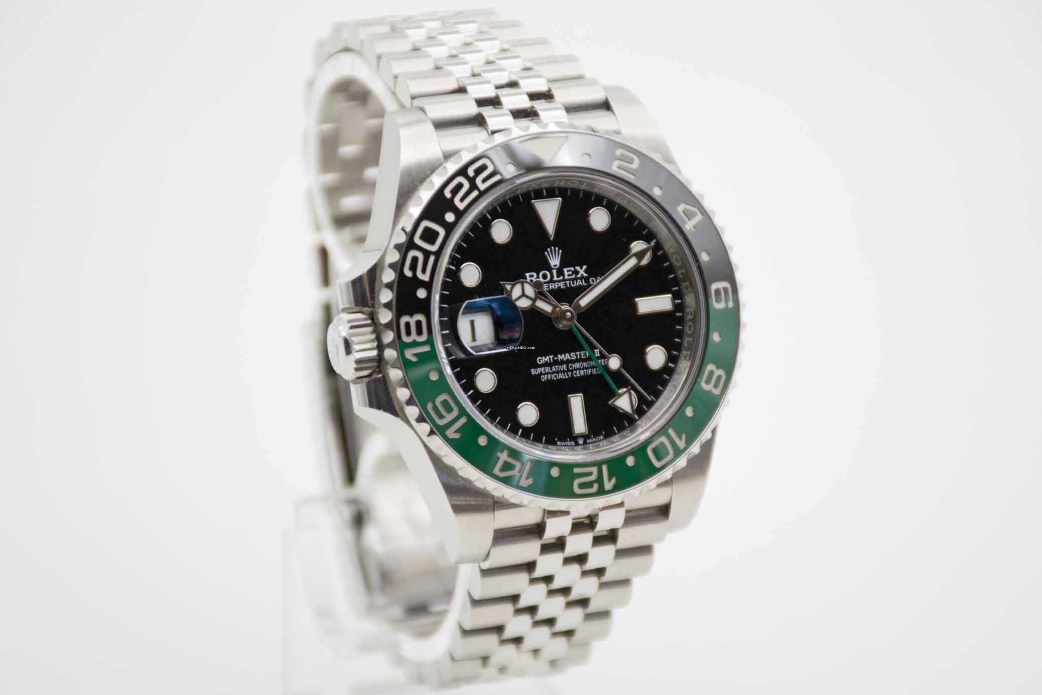 GMT Master II Sprite 126720VTNR, 40 mm Gehäuse mit schwarzem Zifferblatt, grün/schwarzer Keramik Lünette und Rolex Jubilée Armband. Perfektes Fullset in Rolex Box mit Umkarton und Schuber, GMT-Master Bedienungsanleitung, Garantie Booklet, Hang Tag, grünem Lederetui und Rolex Garantiekarte aus 09/2023 (Rolex Garantie bis 09/2023). Die Uhr befindet sich in perfektem und neuwertigem Zustand. Inzahlungnahmen sind nur im Direktgeschäft möglich. Bitte sprechen Sie uns hierzu an. GMT Master II Sprite 126720VTNR, 40 mm case with black dial, green/black ceramic bezel and Rolex Jubilée bracelet. Perfect full set in Rolex inner and outer box with cover, GMT-Master II manual, green leather wallet, warranty booklet, hang tag and Rolex warranty card from 09/2023 (Rolex warranty valid up to 09/2023). The watch comes in perfect and mint condition like new. Trades are possible. Please keep in mind that our complete inventory is stored in our bank safe for safety purposes.