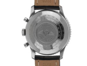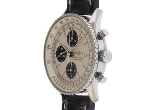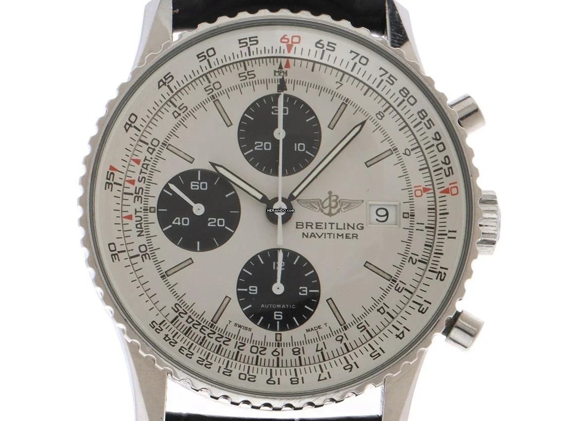 Breitling Old Navitimer Stahl Automatik Chronograph Armband Krokoleder Gehäuse Edelstahl poliert, Gehäusedurchmesser ohne Krone 41mm, Gehäusehöhe 14,2mm. Lünette Edelstahl gerädelt mit unterglas Rechenschieber, beidseitig drehbar. Armband Krokoleder schwarz mit weißer Ziernaht, Anstoßbreite 22mm, Stiftschließe Edelstahl mit Hersteller-Logo. Zifferblatt silberfarben mit schwarzen Hilfszifferblättern und schwarzen Zeigern. Uhrwerk Automatik, Chronograph, Kaliber Breitling. Anzeige von Stunde und Minute über Zeiger aus der Mitte, kleine Sekunde mit Sekundenstopp zur sekundengenauen Einstellung der Uhrzeit bei 9 Uhr, Datumsanzeige mit Schnellverstellung bei 3 Uhr. Saphirglas kratzfest und gewölbt. Krone mit Hersteller-Logo. Boden Edelstahl verschraubt und graviert. Gewicht der Uhr inklusive Armband 85g. Referenznummer: 81610, Gehäusenummer: 1XXX, Baujahr: 2005, ID: P229149000126H-6800, Artikelnummer: 10000084297. Mit Gangkontrolle und kompletter äußerlicher Aufarbeitung von Januar 2026. Original Breitling Service Box und und Watchregister Auszug von Januar 2026, The Watch Register Zertifikat / ohne Eintrag (Internationale Datenbank für verlorene oder gestohlene Uhren. Superschnäppchen, Kapitalanlage mit Wertsteigerungspotential, sehr seltenes Sammlerstück. Sehr guter Zustand. Lieferzeit sofort. Inklusive certified pre owned Siegel / Uhrenpass mit einem Farbbild, der genauen Beschreibung sowie dem Wiederbeschaffungswert der Uhr über 6800,-€ und 1000 Tage Garantie ab Kaufdatum.