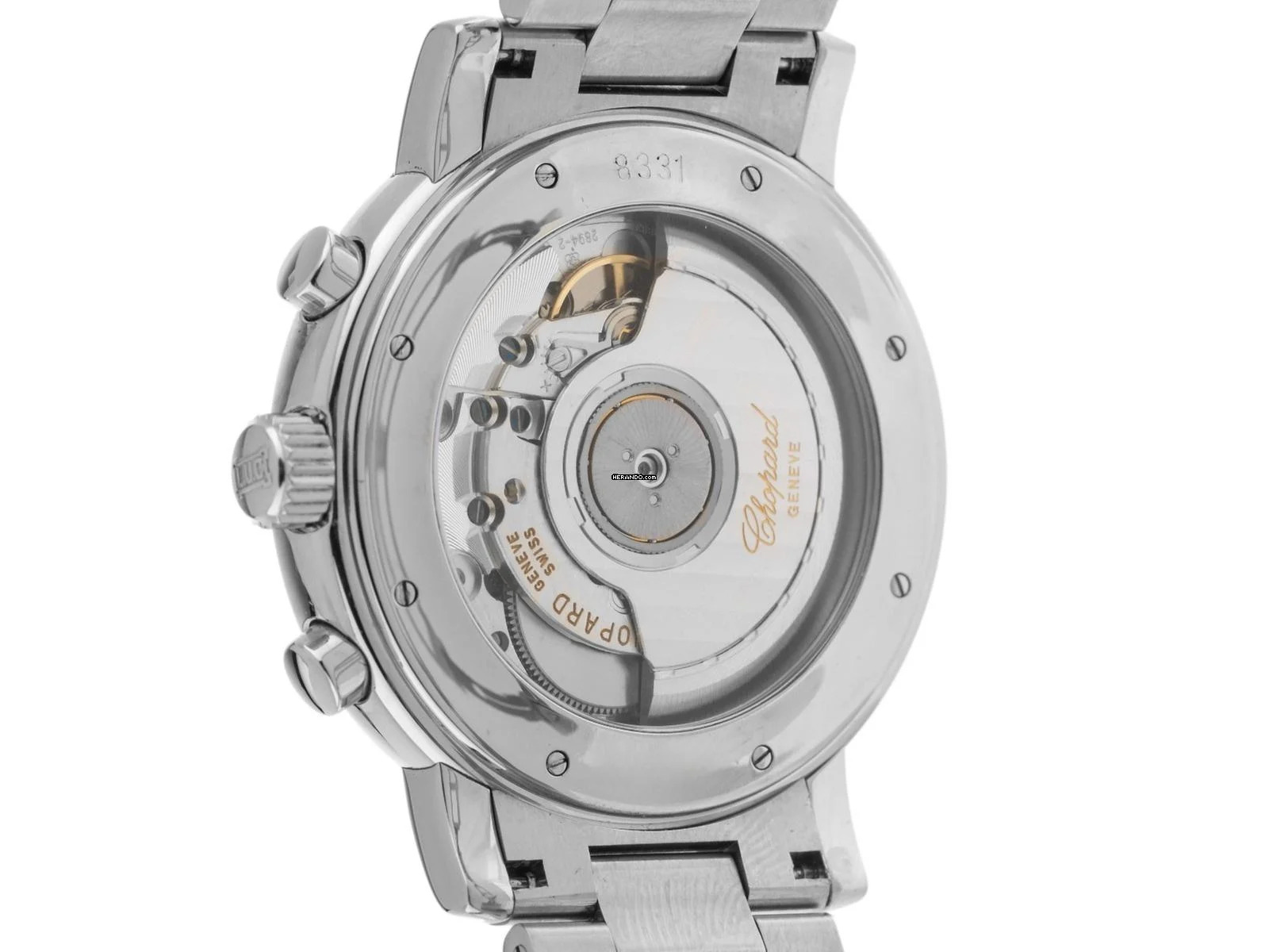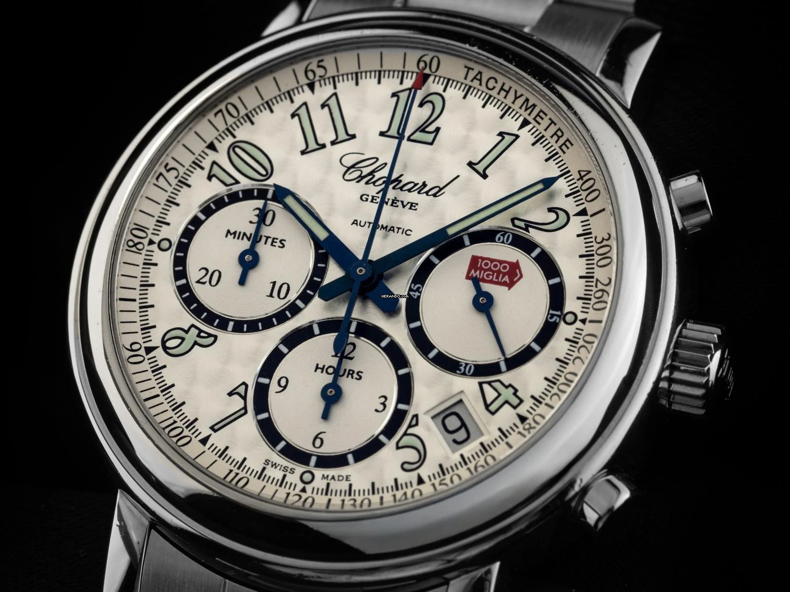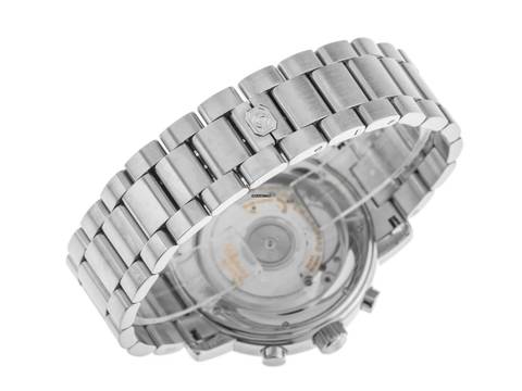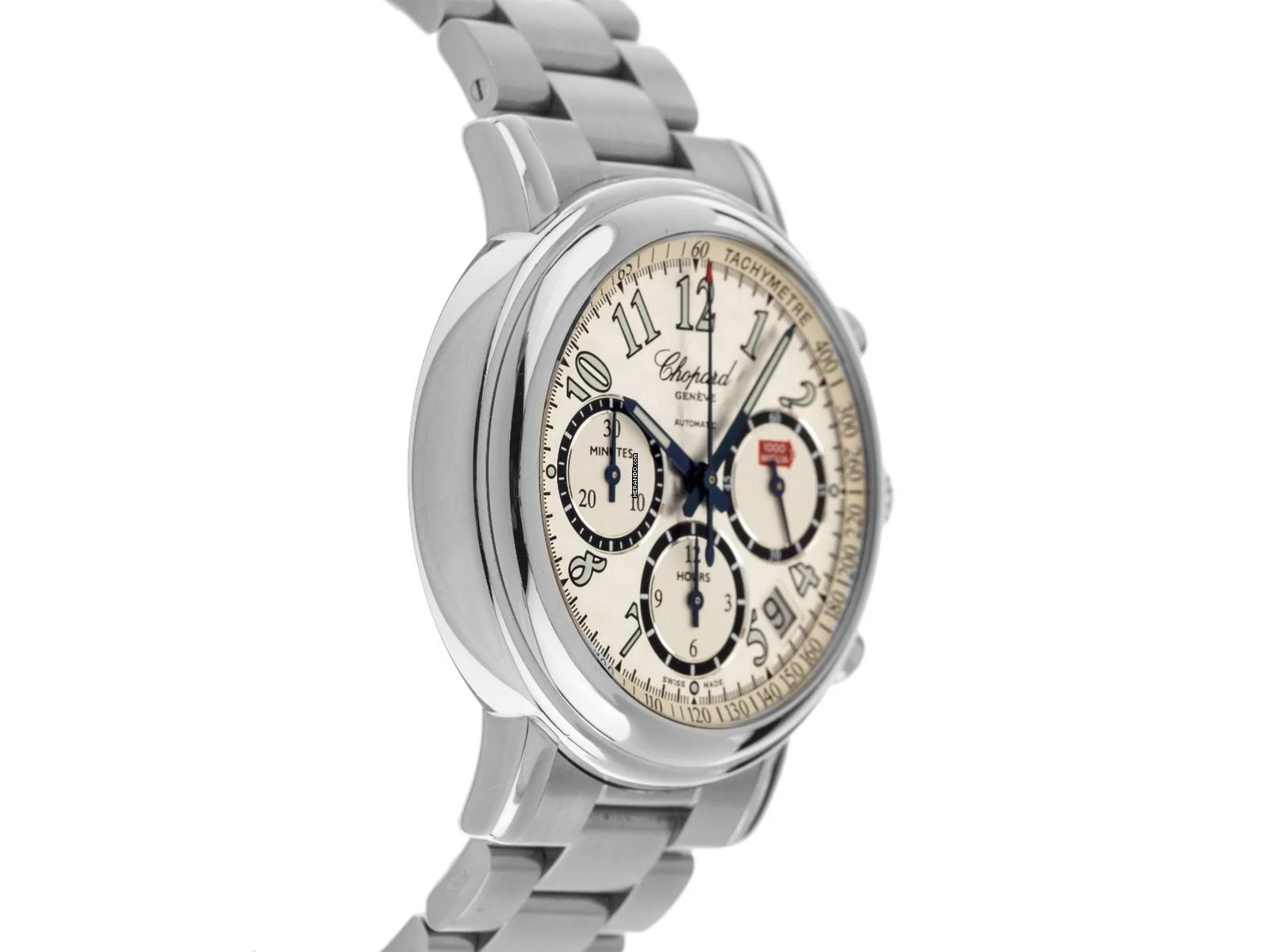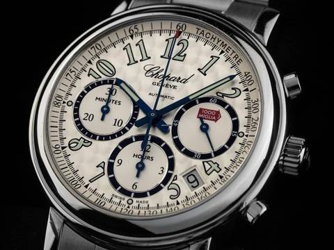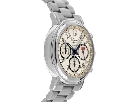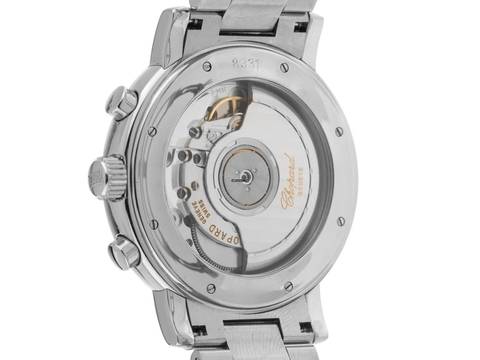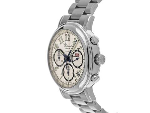 Chopard Mille Miglia Stahl Automatik Chronograph Armband Stahl Gehäuse Edelstahl poliert, Gehäusedurchmesser ohne Krone 39mm, Gehäusehöhe 11,4mm. Lünette Edelstahl glatt und poliert. Armband Edelstahl poliert und satiniert, verdeckte Doppelfaltschließe Edelstahl mit Hersteller-Logo. Zifferblatt silberfarben hell mit arabischen Ziffern und gebläuten Zeigern. Uhrwerk Automatik, Chronograph, COSC Chronometer mit Zeugnis, Kaliber Chopard mit 37 Edelsteinen. Anzeige von Stunde und Minute über Zeiger aus der Mitte, kleine Sekunde mit Sekundenstopp zur sekundengenauen Einstellung der Uhrzeit bei 3 Uhr, Datumsanzeige mit Schnellverstellung zwischen 4 und 5 Uhr. Saphirglas kratzfest und gewölbt. Krone geriffelt mit Hersteller-Logo. Boden Edelstahl 8-fach verschraubt und graviert mit Saphirglas Sichtfenster. Gewicht der Uhr inklusive Armband 123g, Länge des Armbandes inklusive Gehäuse 165mm. Referenznummer: 8331, Baujahr: 2005, ID: P227844000126H-5800, Artikelnummer: 10000084276. Original Chopard Box mit Umkarton und Garantie Papiere ohne Datumseintrag sowie Watchregister Auszug von Januar 2026, The Watch Register Zertifikat / ohne Eintrag (Internationale Datenbank für verlorene oder gestohlene Uhren), Full Set. Superschnäppchen, Kapitalanlage mit Wertsteigerungspotential, sehr seltenes Sammlerstück. Wie Neu. Lieferzeit sofort. Inklusive certified pre owned Siegel / Uhrenpass mit einem Farbbild, der genauen Beschreibung sowie dem Wiederbeschaffungswert der Uhr über 5800,-€ und 1000 Tage Garantie ab Kaufdatum.