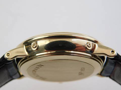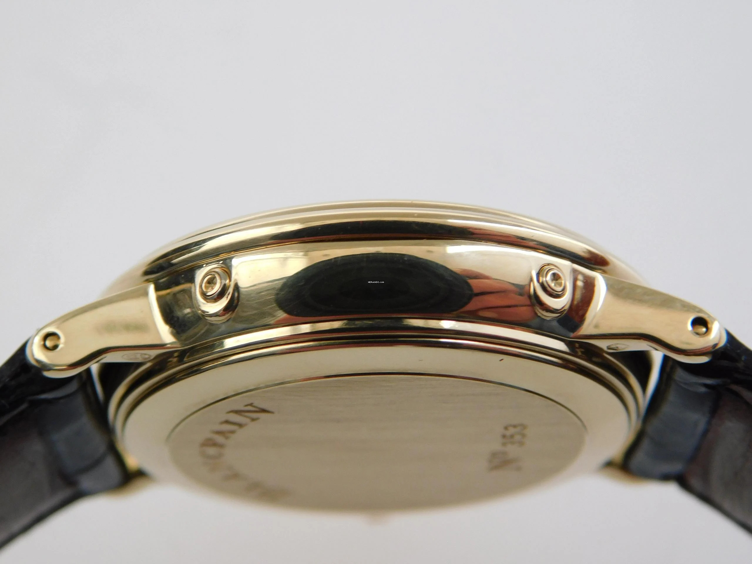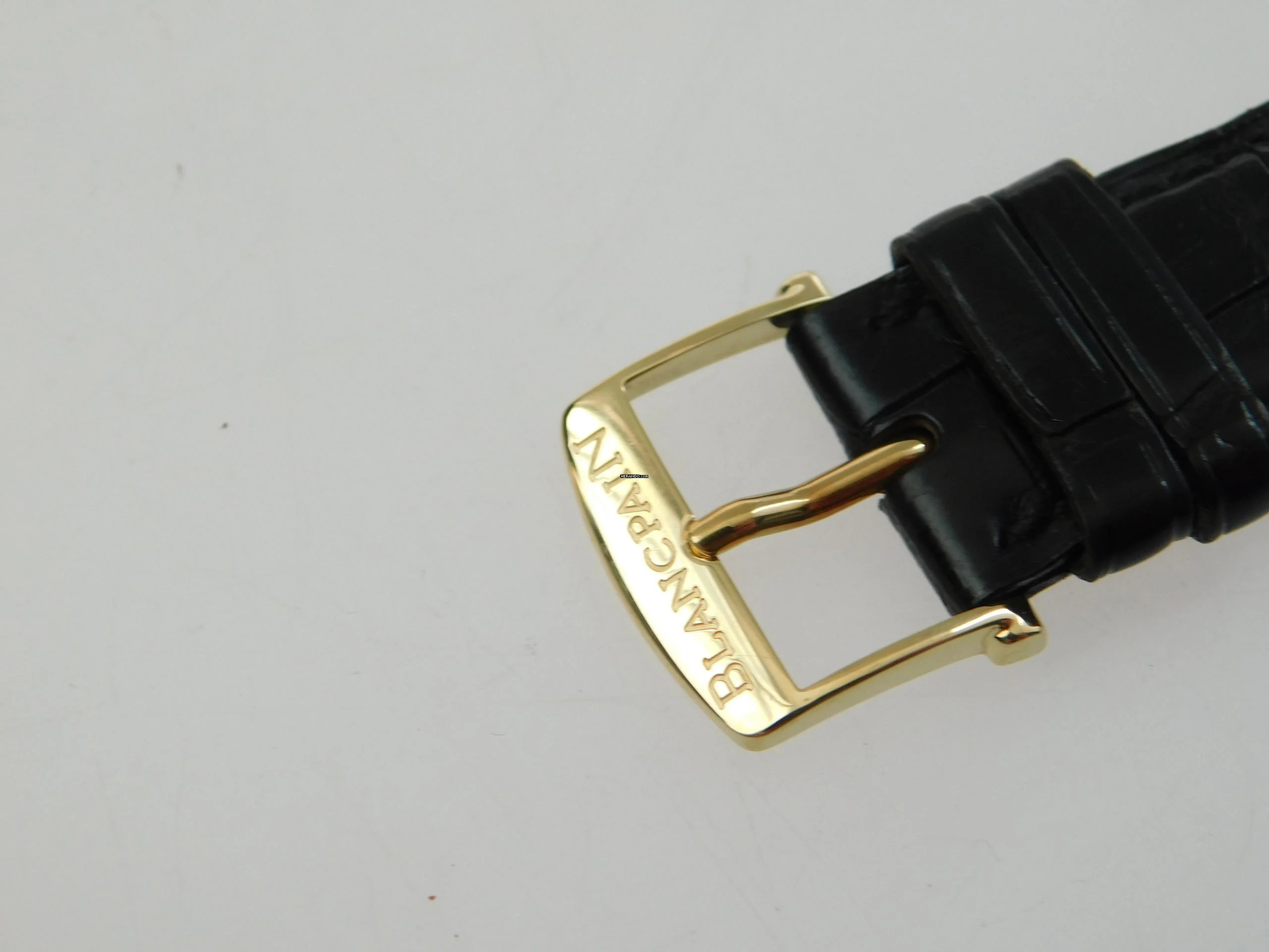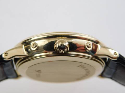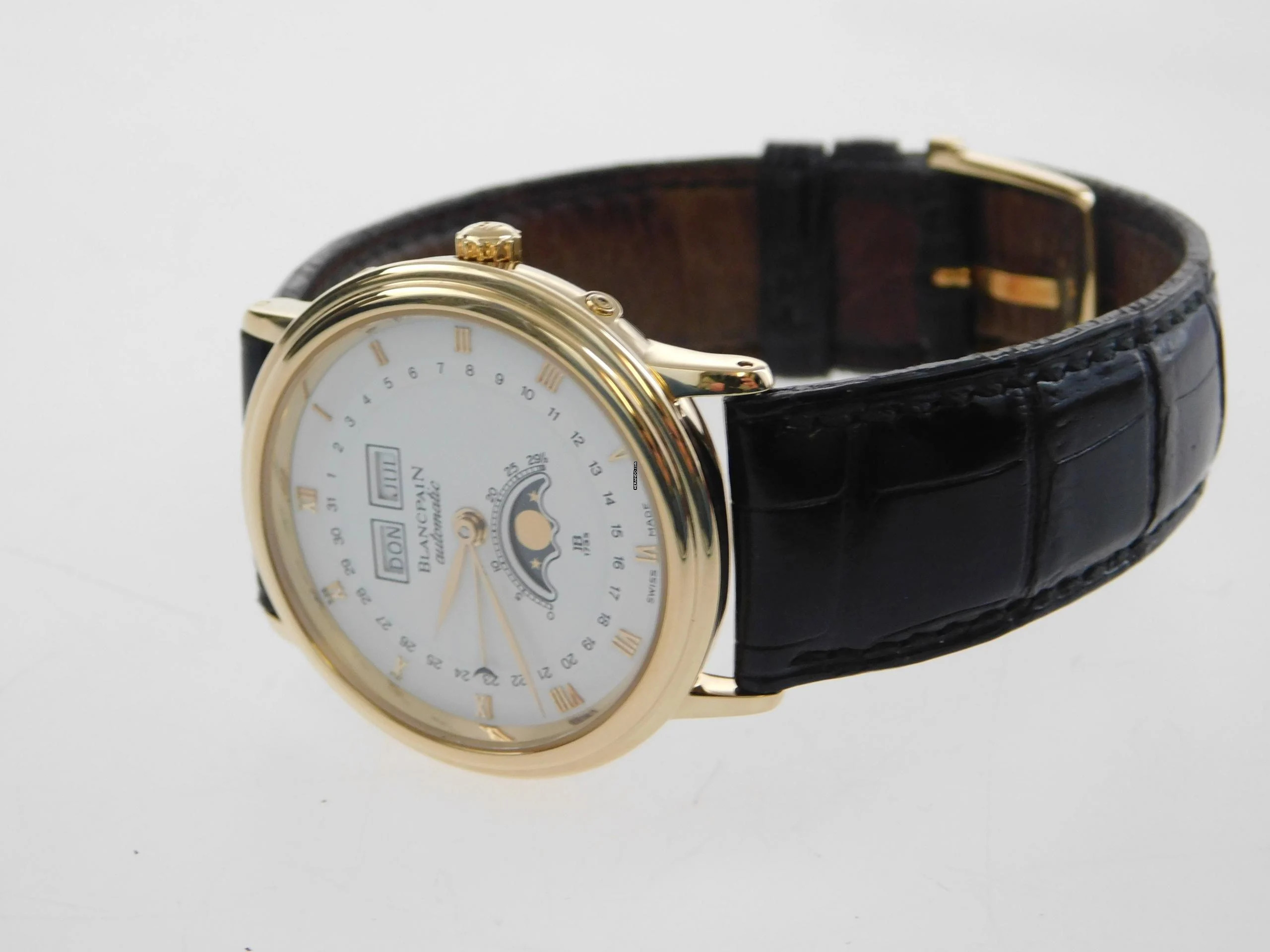 Die Uhr verfügt über ein Blancpain Automatik Kaliber und ist mit dem original Blancpain Krokoband, sowie original Schließe, 18 Karat Gelbgold ausgestattet.