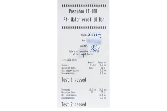 * Wenn die Uhr positiv auf Wasserdichtigkeit getestet wurde, dann gilt diese Eigenschaft zum Zeitpunkt der Messung. Wasserdichtigkeit ist nach DIN 8310 keine bleibende Eigenschaft. Sie sollte jährlich und vor besonderen Belastungen überprüft werden, da die eingebauten Dichtelemente in ihrer Funktion und im täglichen Gebrauch nachlassen. Einflüsse wie starke Temperaturschwankungen, Chlor, Seife oder Salzwasser wirken sich negativ auf die Wasserdichtigkeit aus.