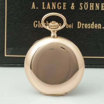 A. Lange & Söhne large, heavy, mint condition 18k gold quality 1A Hunter pocket watch, 1905, box and museum certificate.